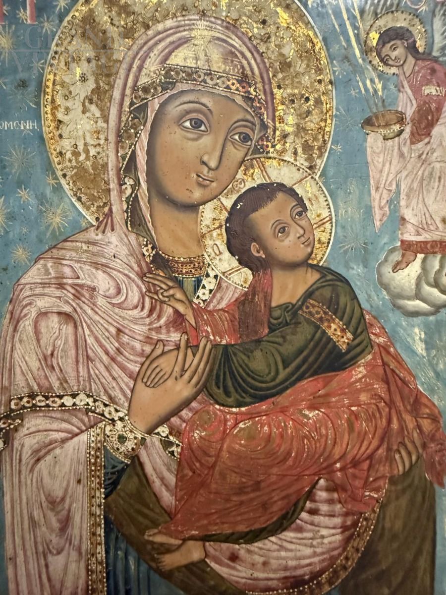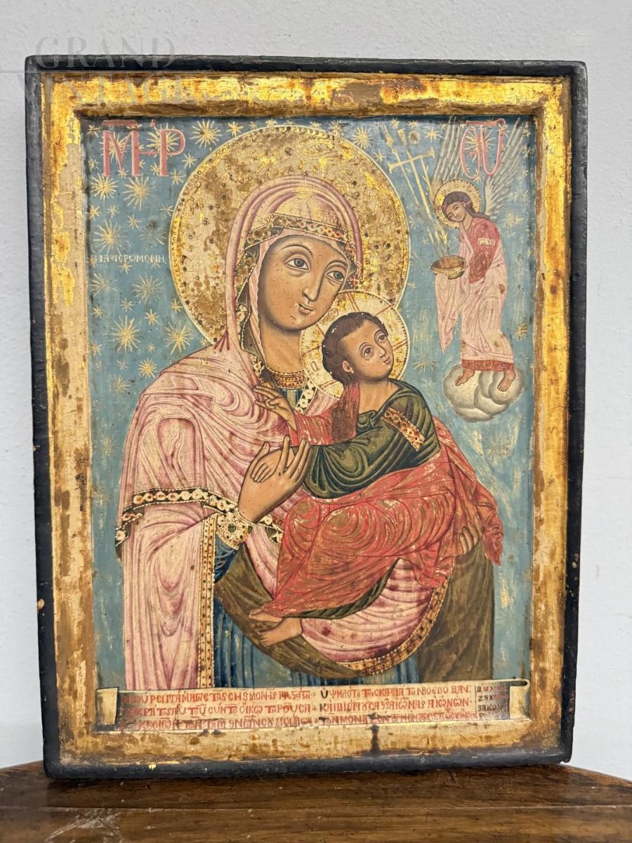 Icona russa antica raffigurante la Vergine col Bambino, dipinta, intagliata e dorata nel XIX secolo, di bella fattura e colori, in buone condizioni, presenta i naturali segni del tempo. Misure: 32 x 25 cm.