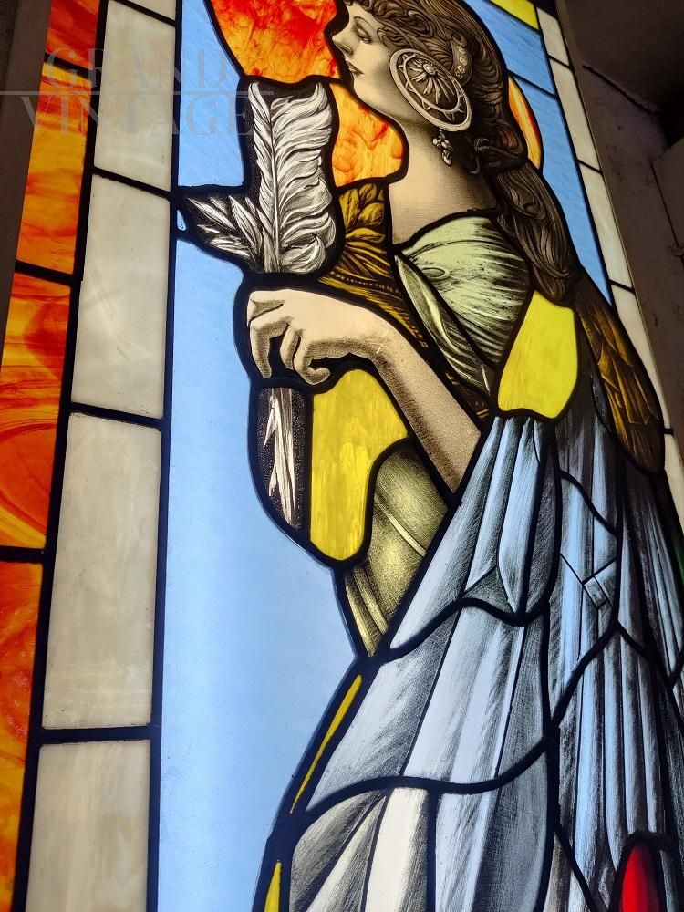 Vetrata artistica rilegata a piombo con pregiati vetri cattedrale, raffigurazione di donna in stile art nouveau. La vetrata è montata su un telaio di sicurezza in lamiera, è smontabile dal telaio e utilizzabile per altri usi d'arredo. Realizzazione artigianale di maestri vetrai, lavorata a mano nei primi anni '50. Vetrata in ottimo stato conservativo, nessun difetto, unico esemplare.