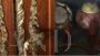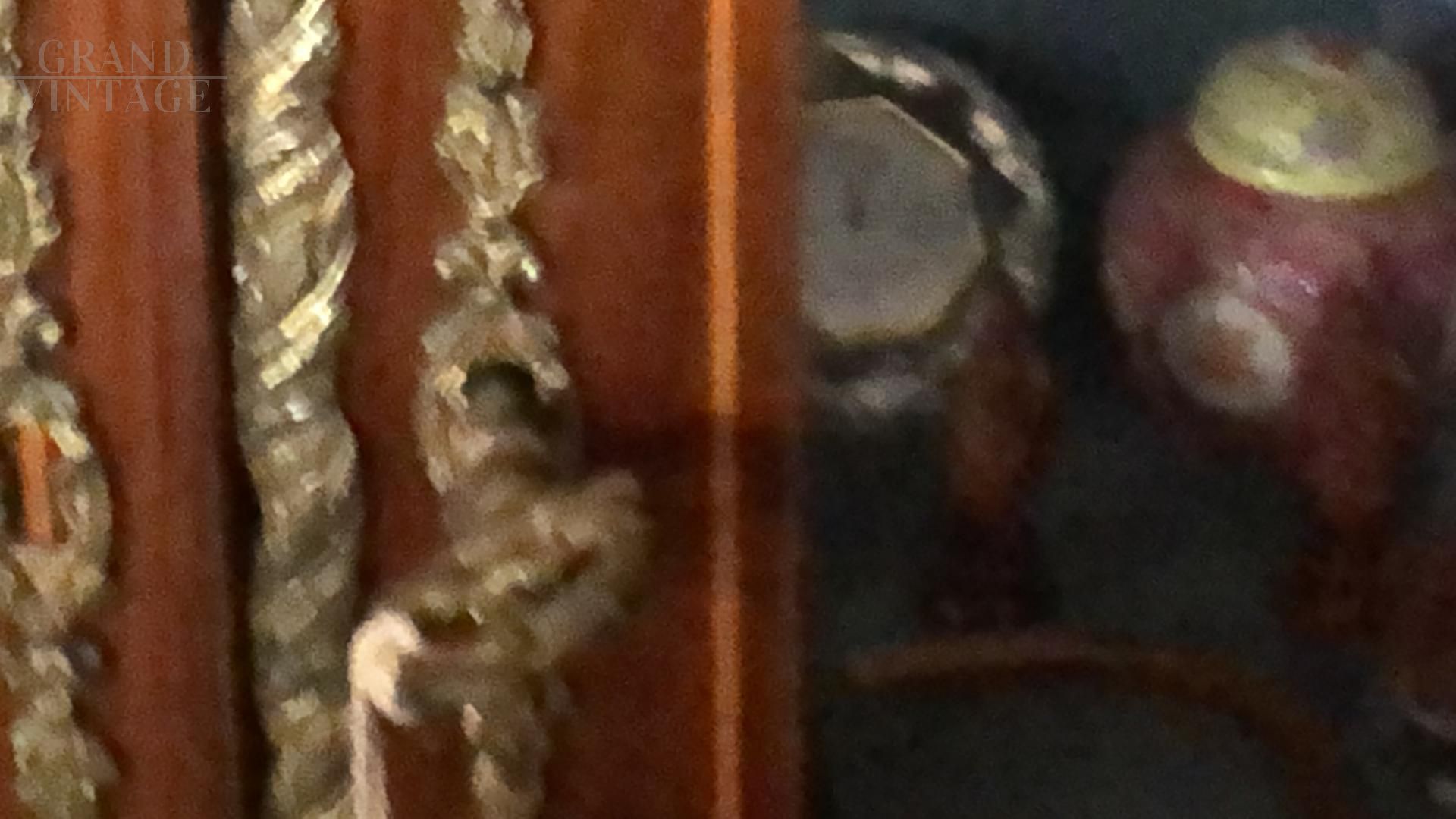 Antica vetrina bassa inglese del XIX secolo a due sportelli, in radica di noce, filettata variamente in legno chiaro, con marqueterie del tipo floreale, ornata con bronzi dorati, databile intorno alla metà del secolo 19º. Con certificato di autenticità.