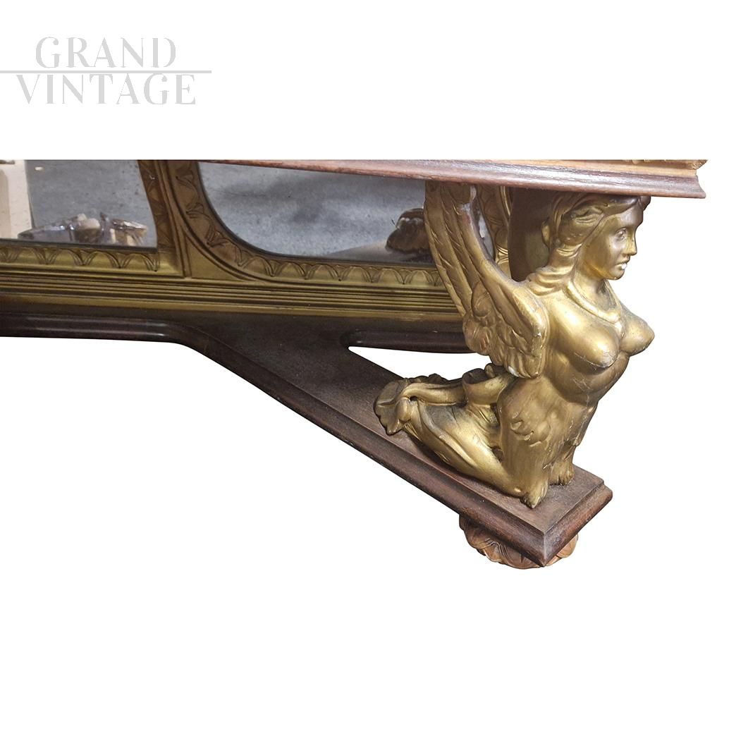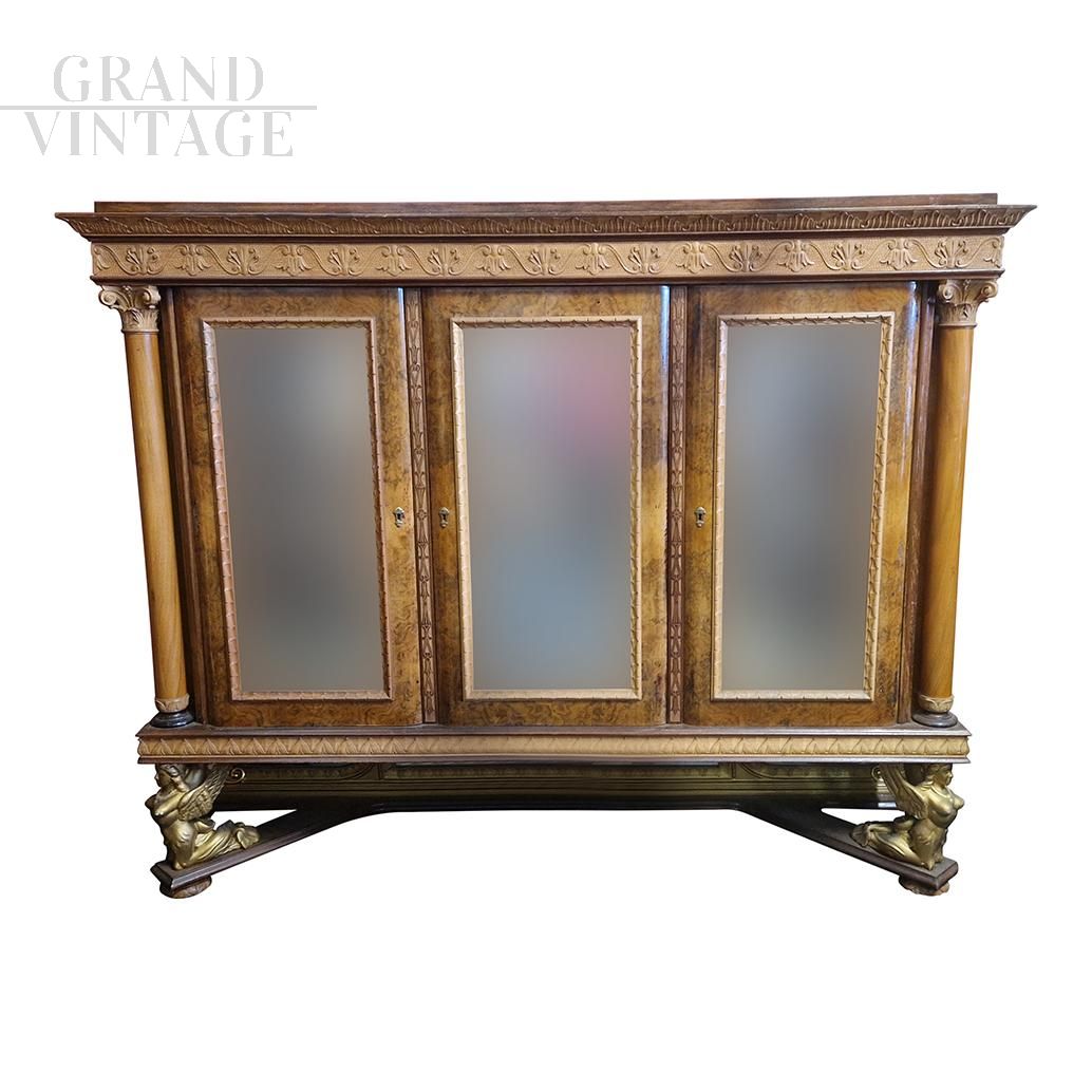 Vetrina in stile antico Impero Italiano realizzata nella prima metà del XX secolo in noce e altre essenze di legni, con tre ante a vetro e due colonne ai lati. L'intera vetrina è intagliata con acero e noce lavorato con motivi floreali e geometrici, le tre ante e fianchi sono impiallacciati in radica di noce. La base, in corrispondenza alle due colonne, è caratterizzata dalla presenza di due cariatidi in legno dorato a sorreggere il mobile.