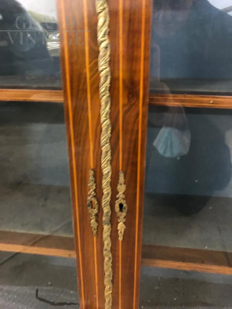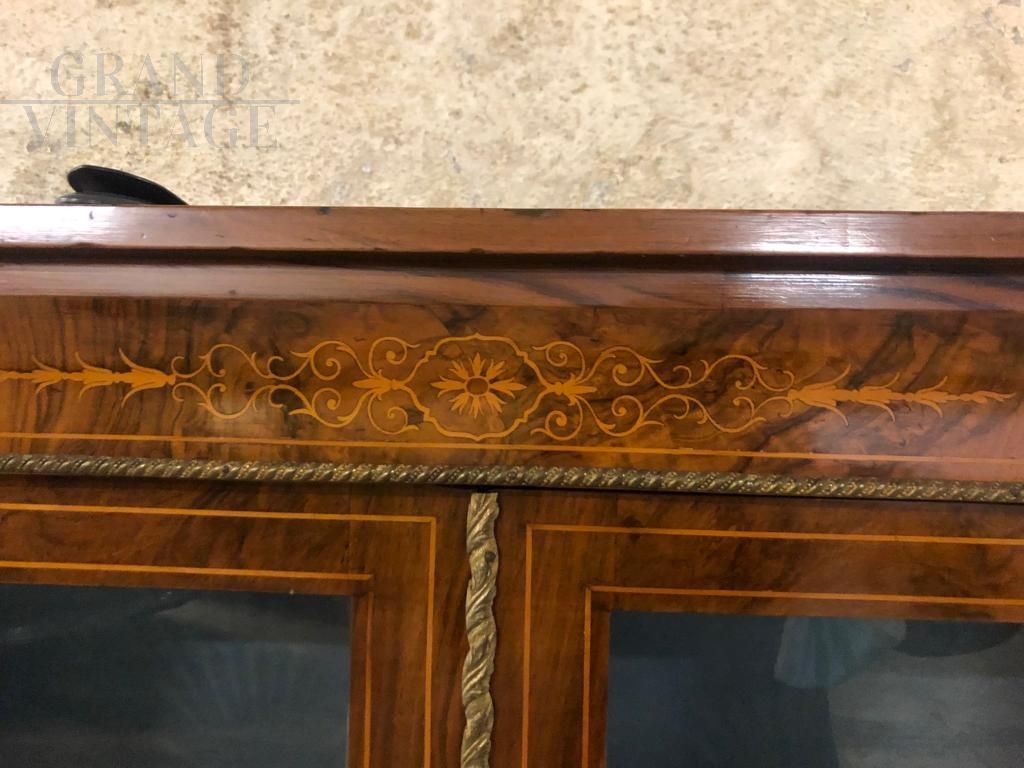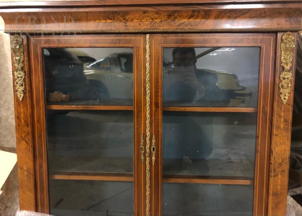 Vetrina inglese dell'800 in radica noce, con intarsio marquetterie floreale e applicazione di bronzi dorati, completa di certificato autenticità.
