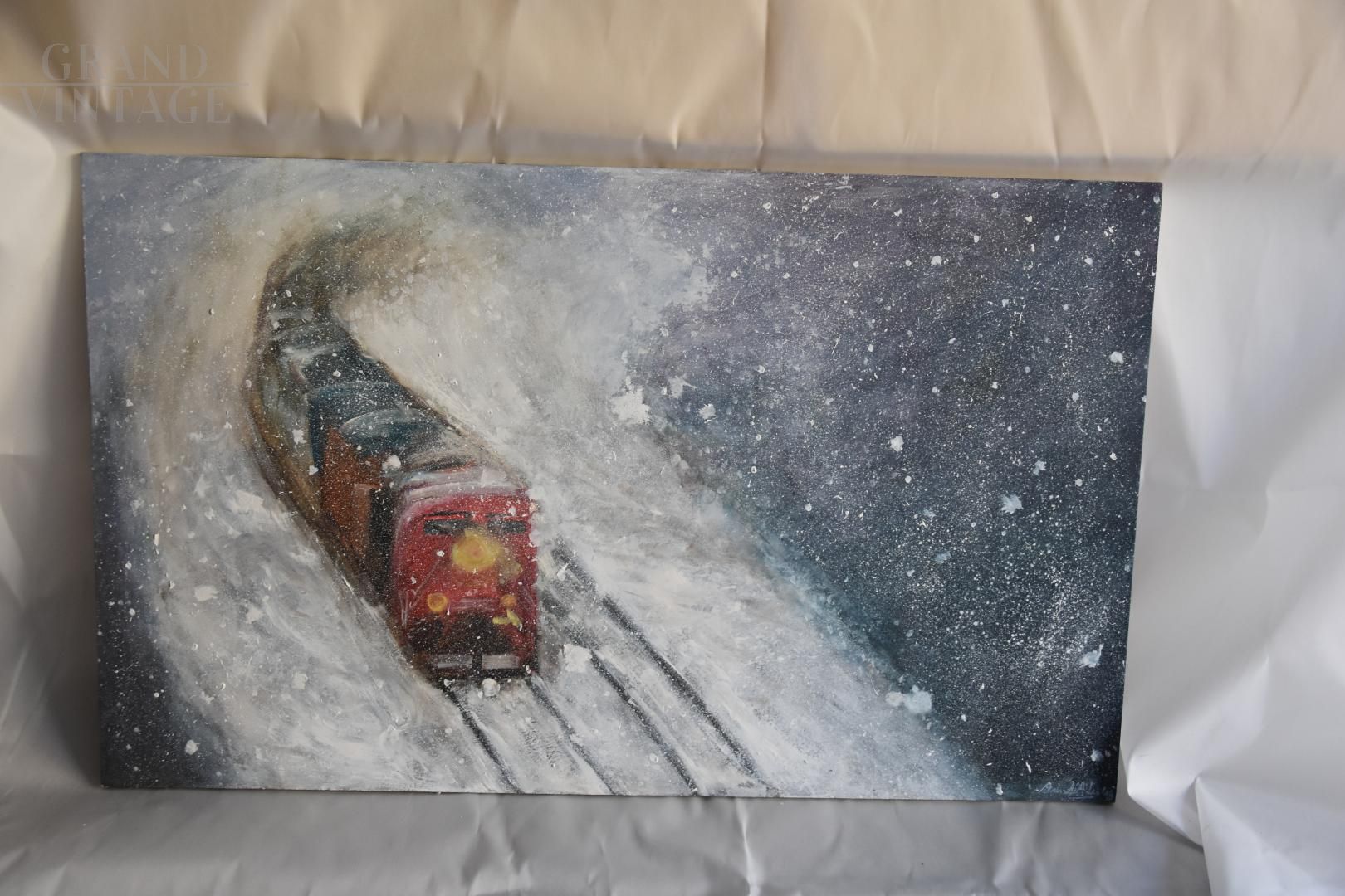 Winter (Inverno) - Dipinto dell’artista lombardo Andrea Busnelli (1989) realizzato con colori ad olio su tavola. E’ quasi possibile sentire lo sferragliare del treno in corsa lungo i binari nascosti dalla neve che cade sotto questo cielo notturno. E’ questa l’idea d’inverno che ha l’artista, un'immagine che richiama l’arte impressionista e gli iconici disegni di Raymond Briggs. Dipinto munito di certificato di originalità firmato dall’artista.