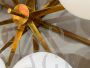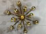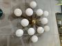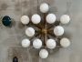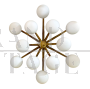 Grande lampadario modello Stella nello stile di Angelo Lelli per Arredoluce con struttura a raggiera in ottone e 12 punti luce con paralume a sfera in vero bianco opalino, design space age italiano degli anni '70.