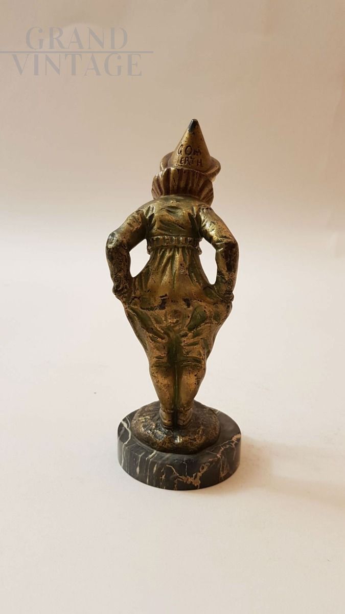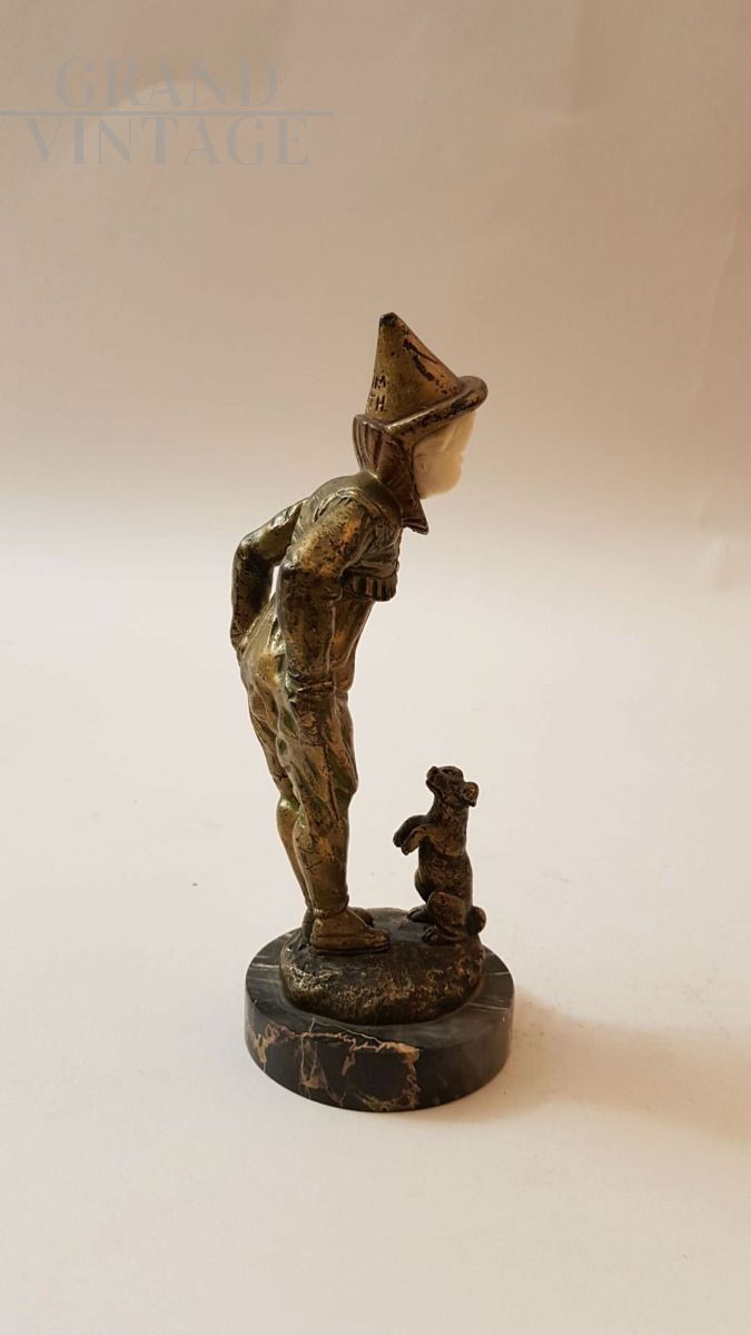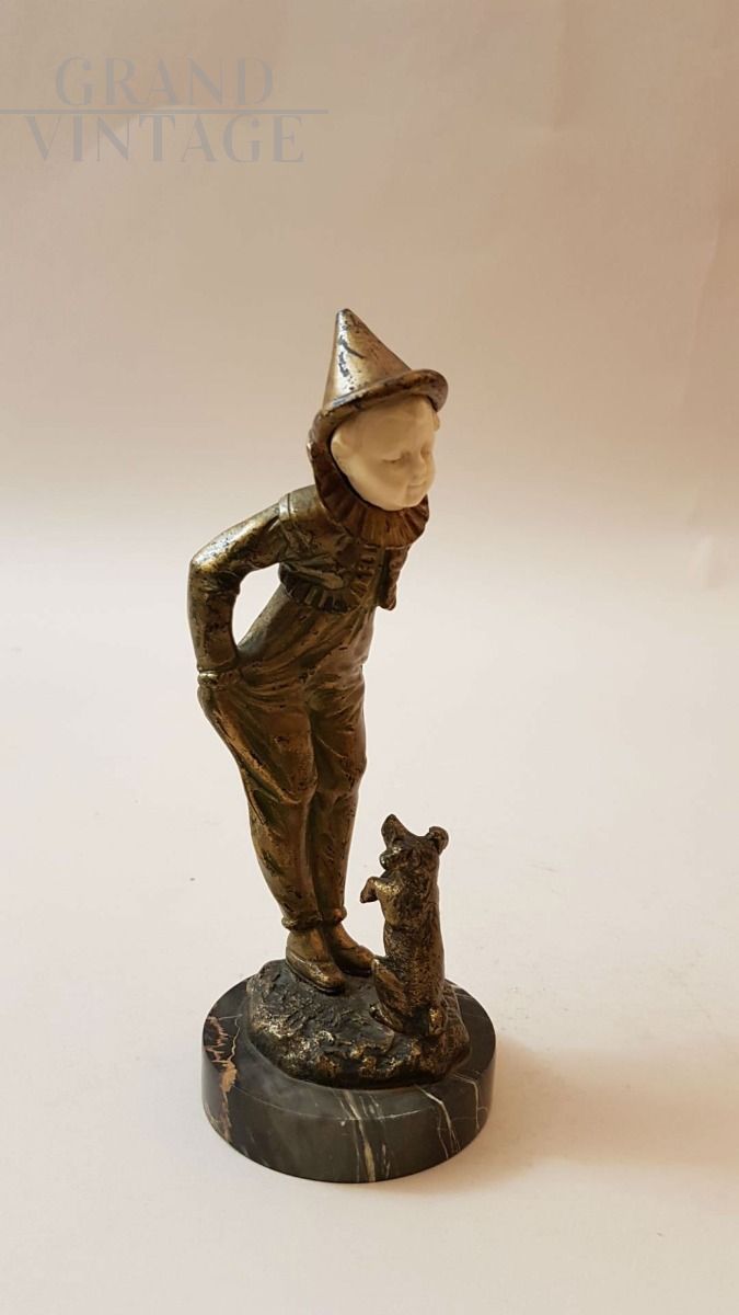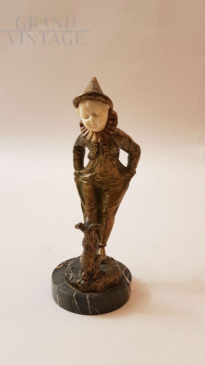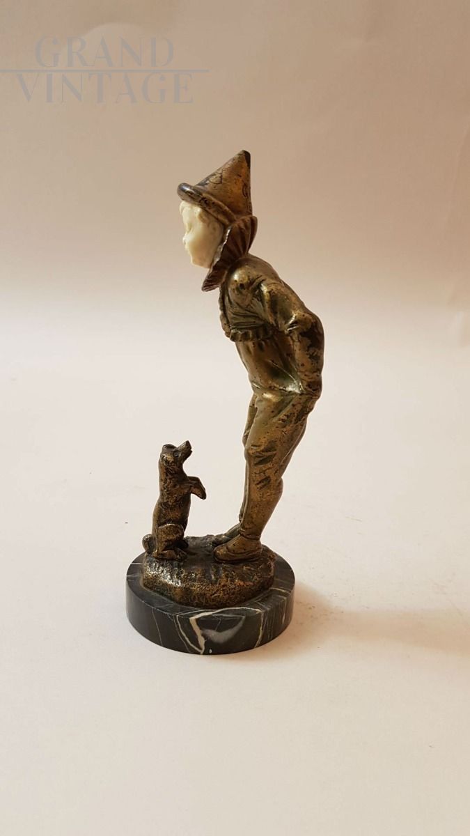 Omerth, Francia, primi 1900: scultura crisoelefantina in bronzo e avorio raffigurante Pierrot con cane in bronzo.