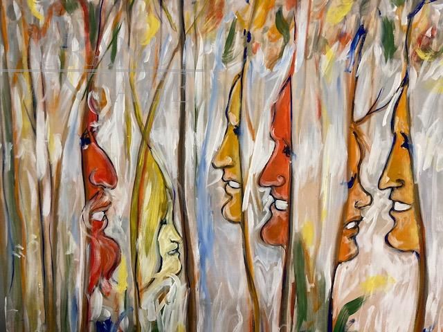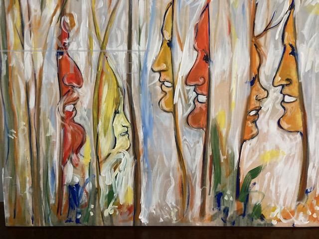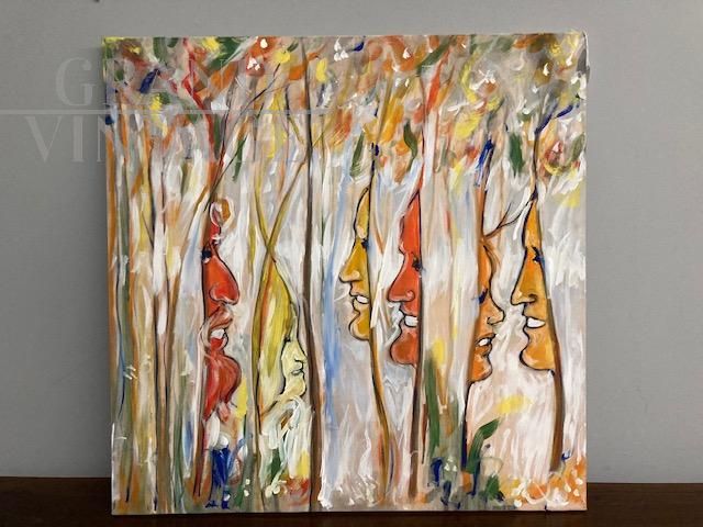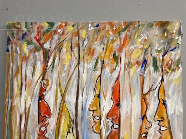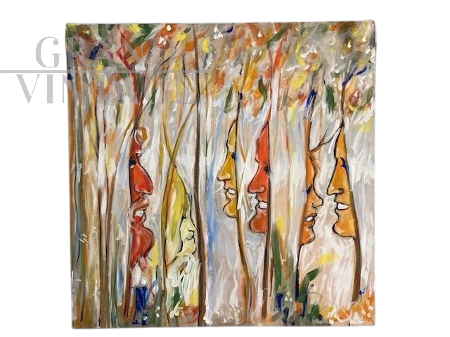Dipinto di arte contemporanea di Antonio Celaia in smalti policromi su tela raffigurante volti e natura, firmato sul retro e datato 1980.
