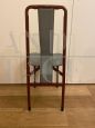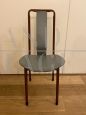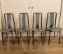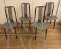 Set di 4 sedie modello Irma del designer Achille Castiglioni e prodotte da Zanotta, Italia 1979. La struttura della sedia è un tubo di acciaio del diametro di 25 mm laccato bordeaux, lo schienale e il sedile sono in cuoio color grigio. La forma è studiata rigida, obbligando ad una postura corretta del corpo durante i pasti. É uno dei pochi progetti realizzato da Castiglioni e dedicato alla moglie Irma. Le sedie sono in buone condizioni, usate poco, presentano i classici segni del tempo.