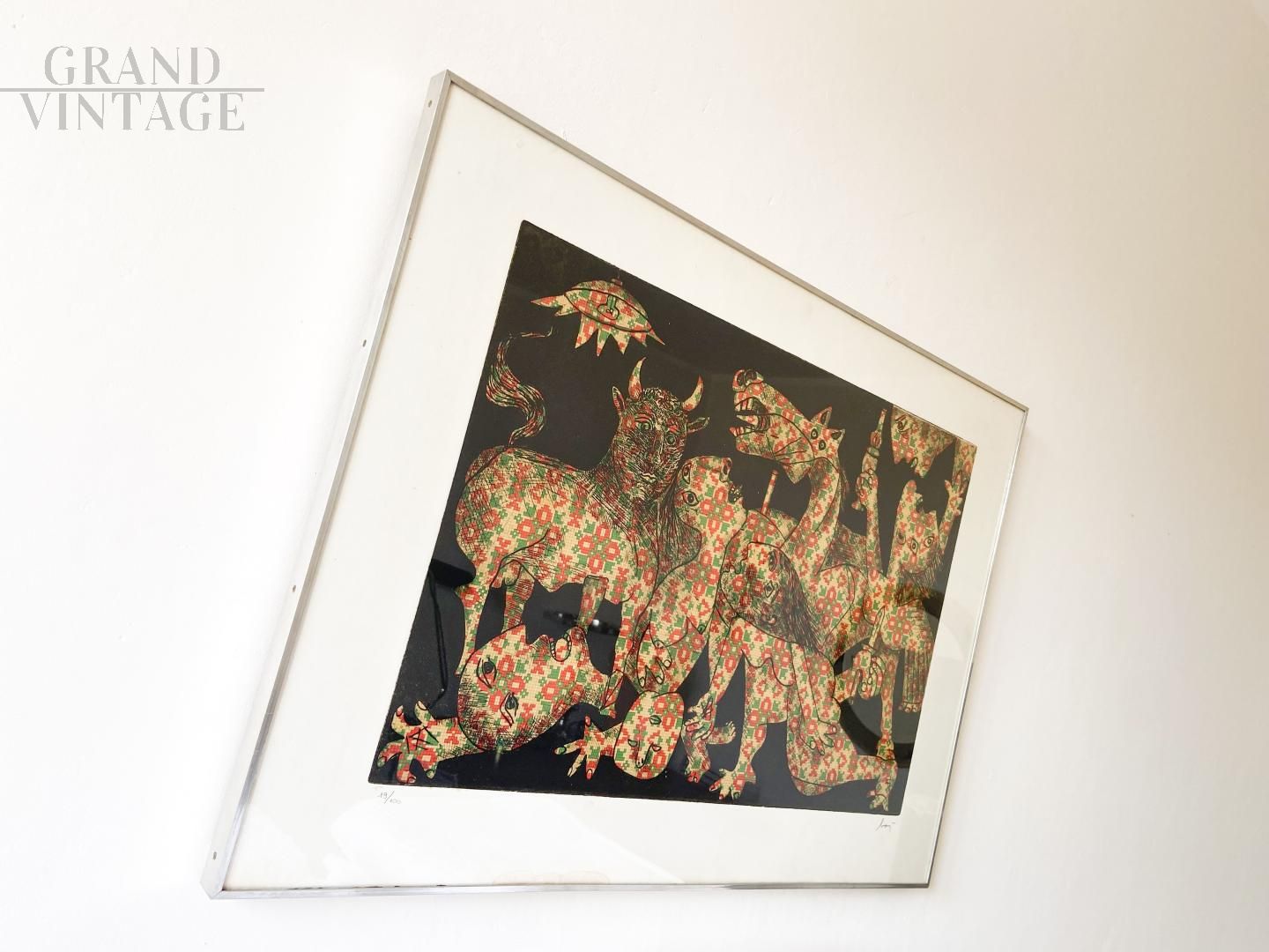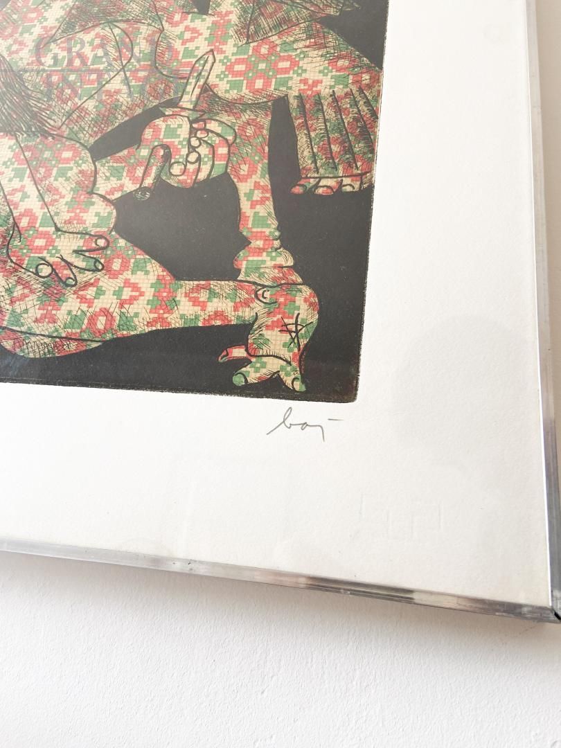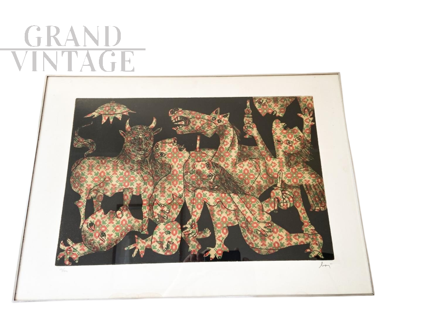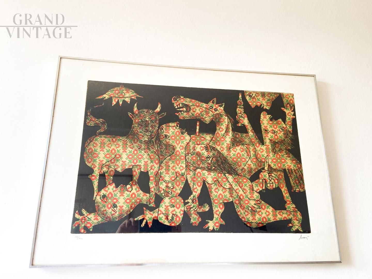 Acquatinta acquaforte con La Guernica di Enrico Baj, Baj Chez Picasso 2 - Italia anni '60. Acquaforte e acquatinta di Enrico Baj Firmata e numerata a matita dall'artista. L'opera è in ottime condizioni, ulteriori immagini sono disponibili su richiesta. Enrico Baj, uno dei più importanti artisti italiani degli anni Cinquanta e Sessanta, è nato a Milano nel 1924. Dopo il diploma al Liceo Classico, inizia gli studi di medicina all'Università degli Studi di Milano, che abbandona nel secondo dopoguerra a favore della Facoltà di Giurisprudenza (che completa diventando avvocato) e dell'Accademia di Belle Arti di Brera, spesso in parallelo. Nel 1951 tiene la sua prima mostra personale alla Galleria San Fedele di Milano.