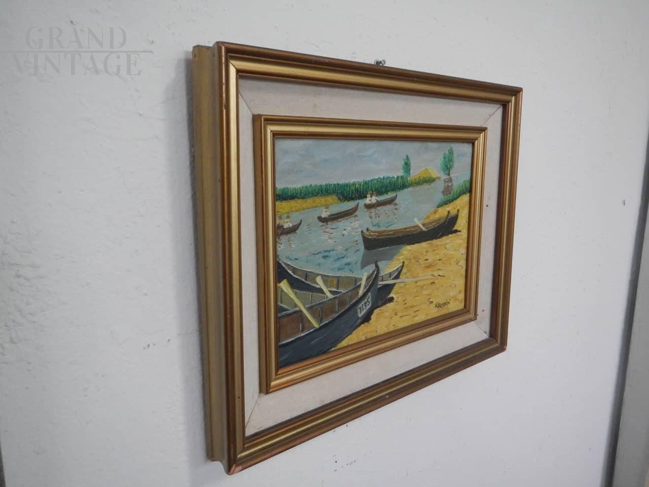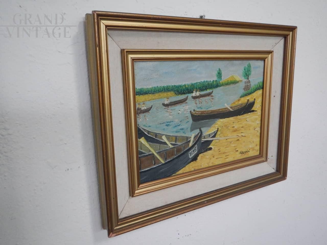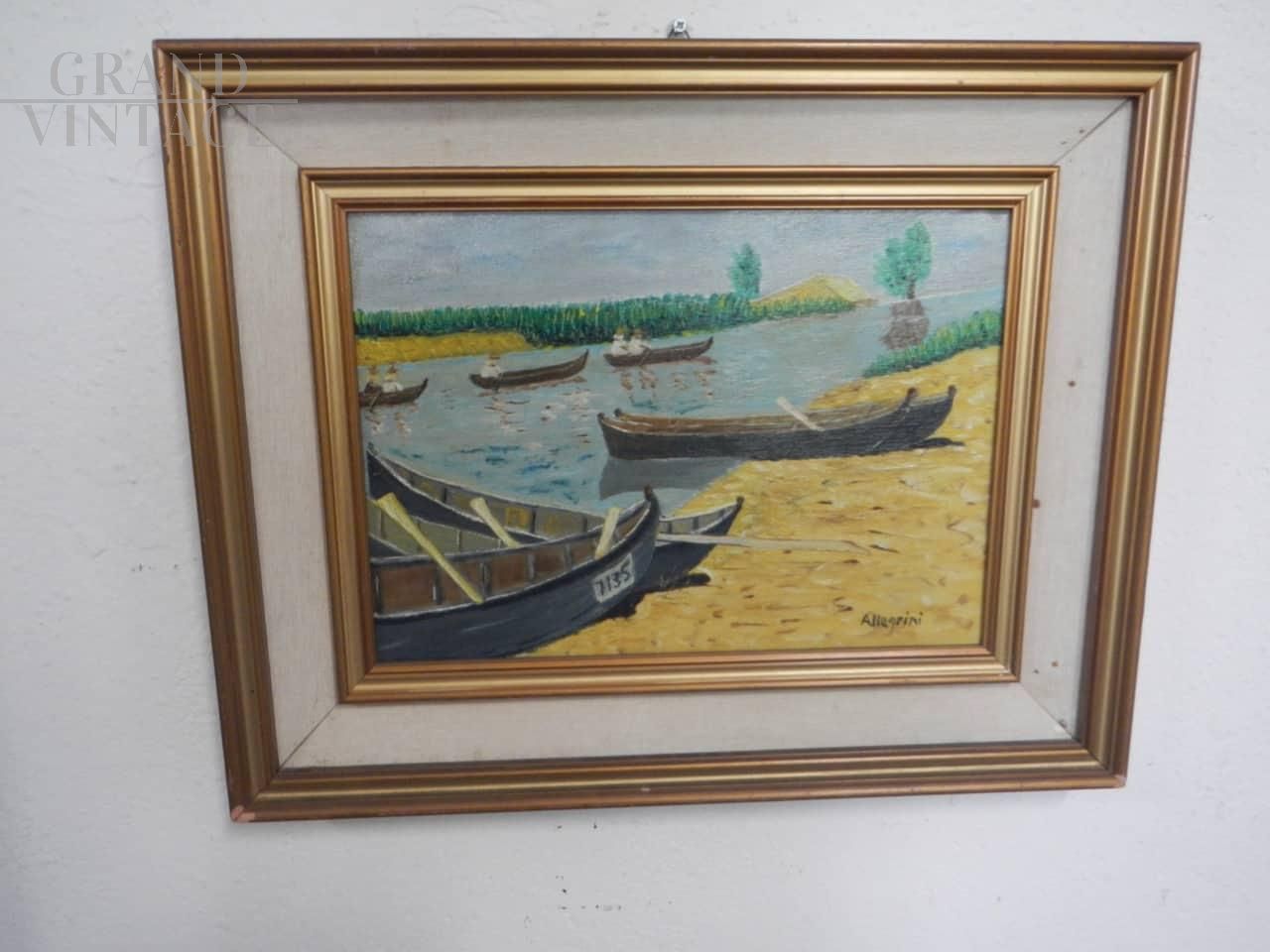 Dipinto olio su tela con barche a fiume, firmato Allegrini P. Luca 1934-2006, completo di doppia cornice in legno di abete.