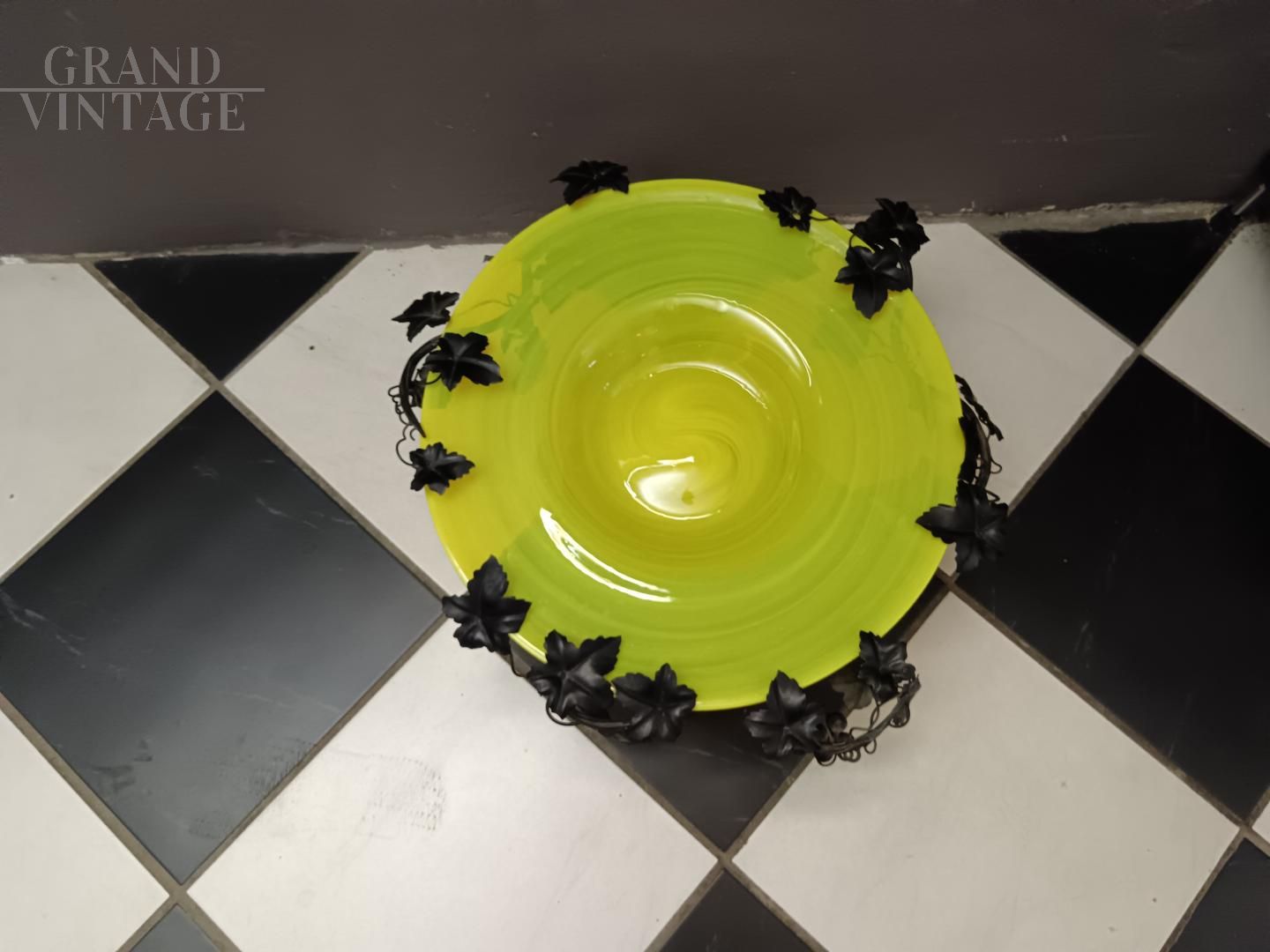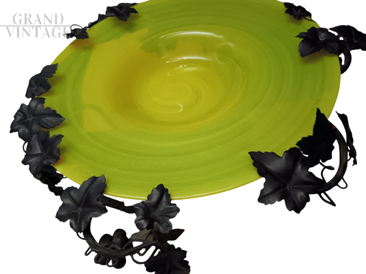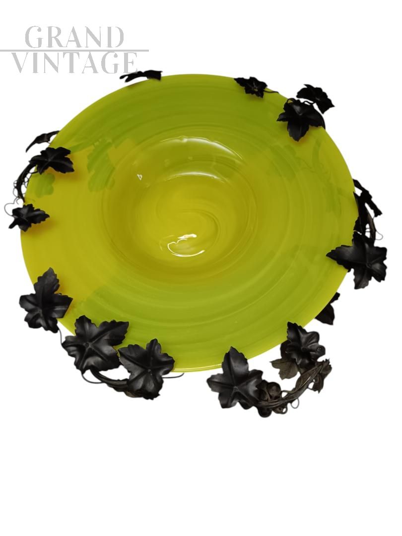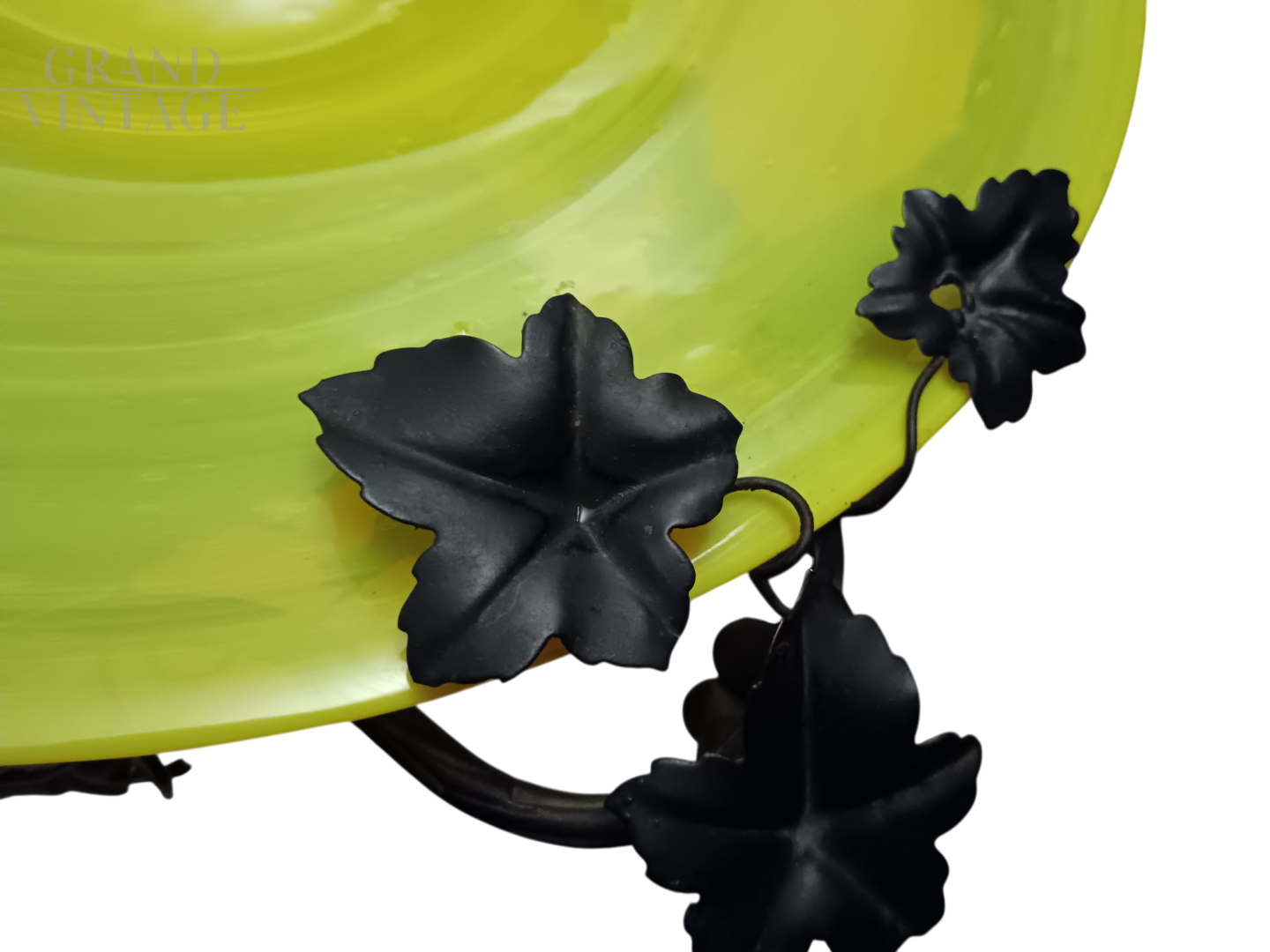 Magnifica alzatina centrotavola artistico con intrico di foglie di vite in ferro battuto e piatto superiore in vetro di Murano giallo con belle sfumature, Italia anni '20, in perfette condizioni, senza sbeccature o difetti!!