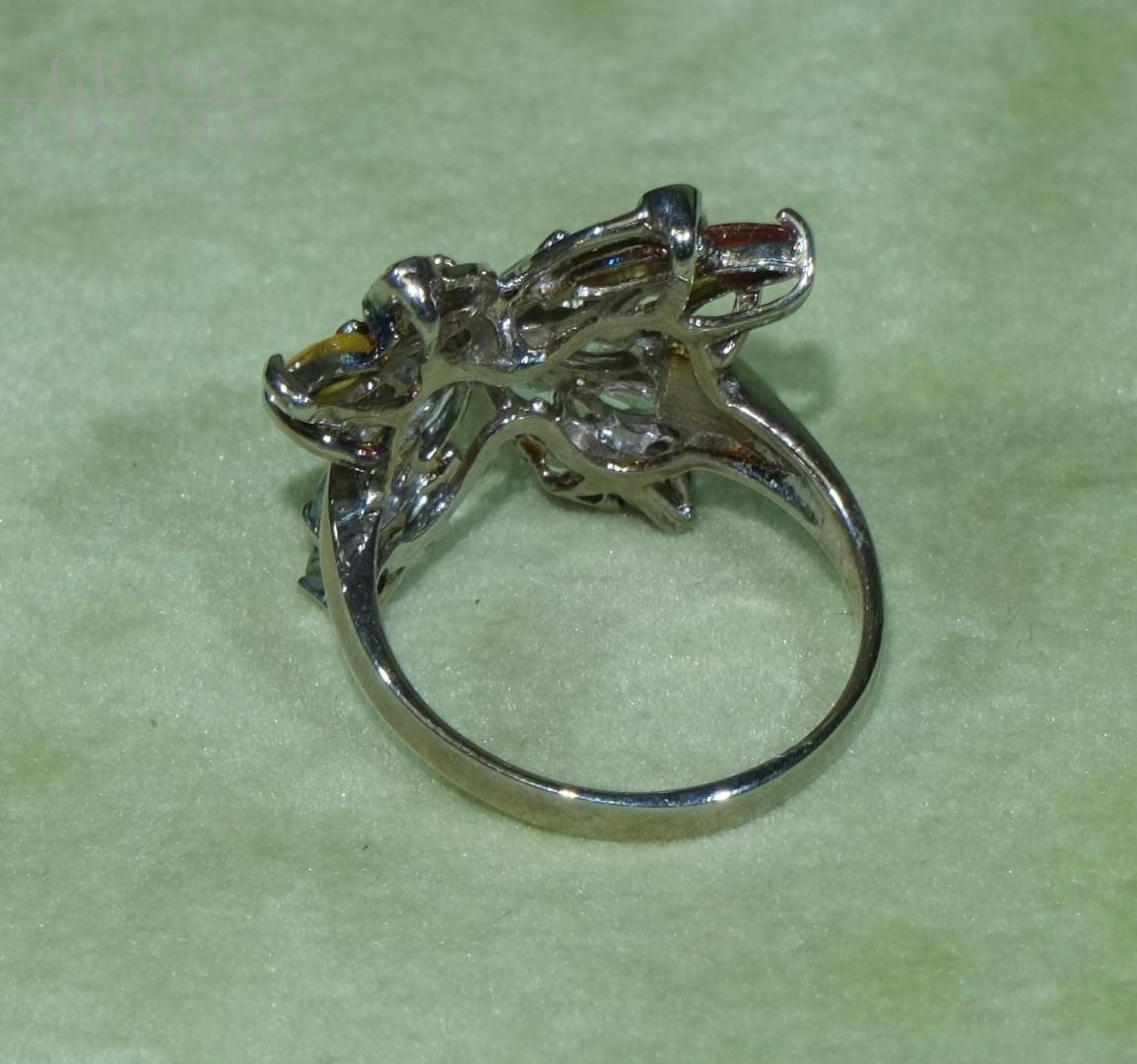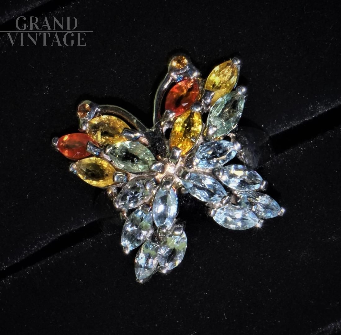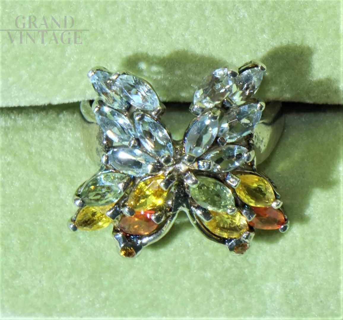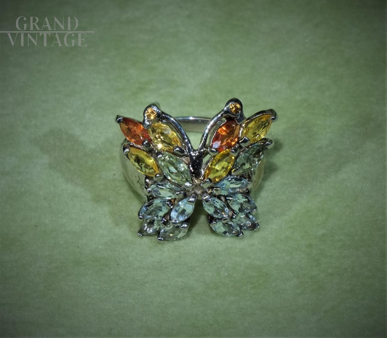 Le mani parlano, gli anelli sono i punti esclamativi dei nostri discorsi. Particolare anello vintage stile Art Déco in argento 925 a forma di farfalla, formato da zaffiri, acquamarine e diopside cromato con taglio Marquise.