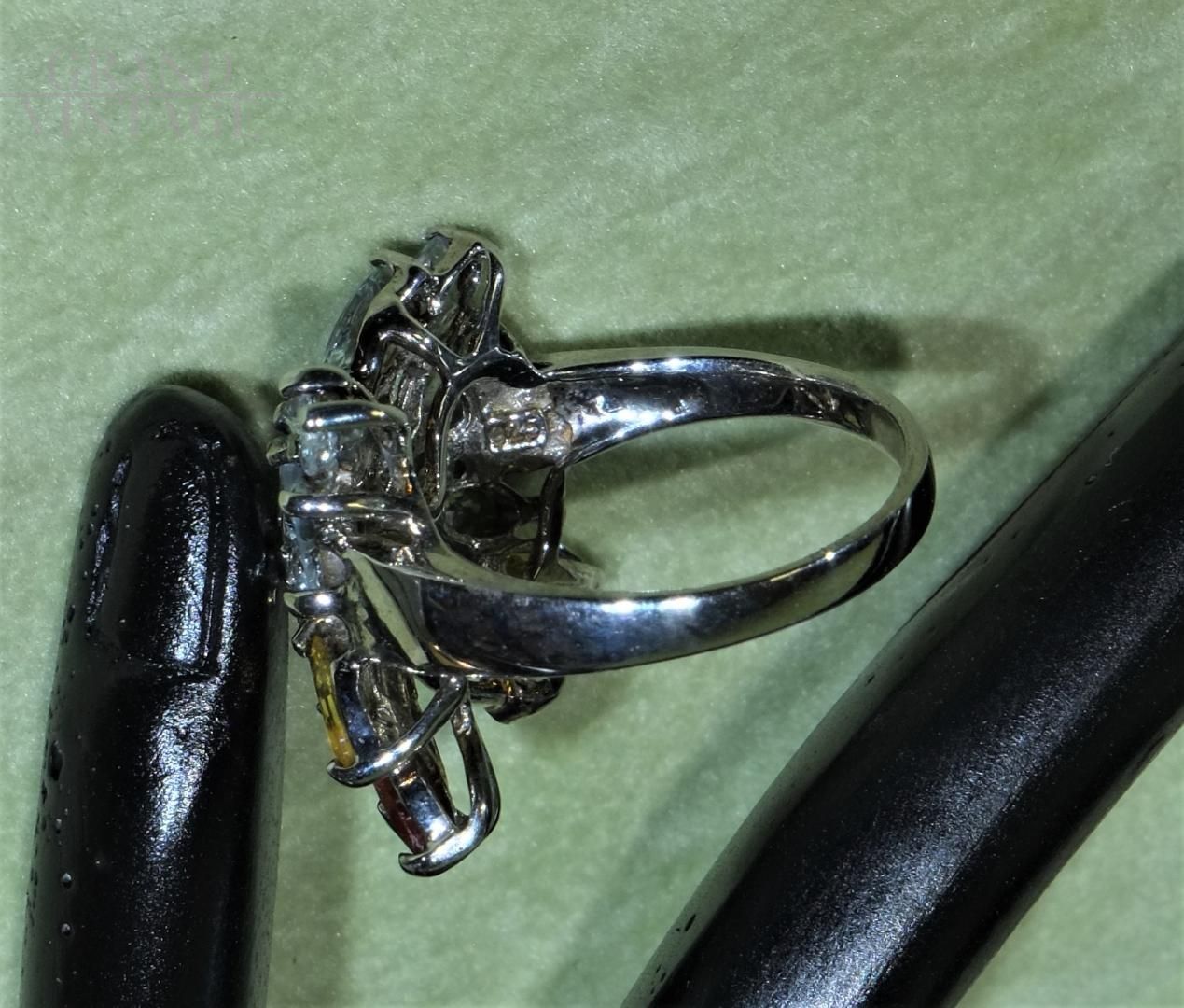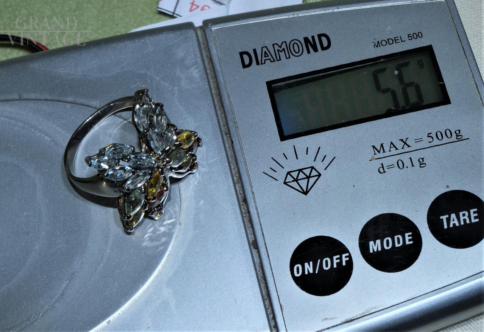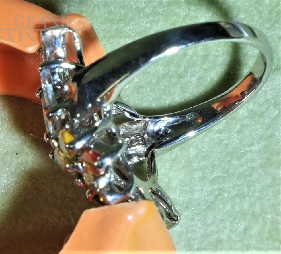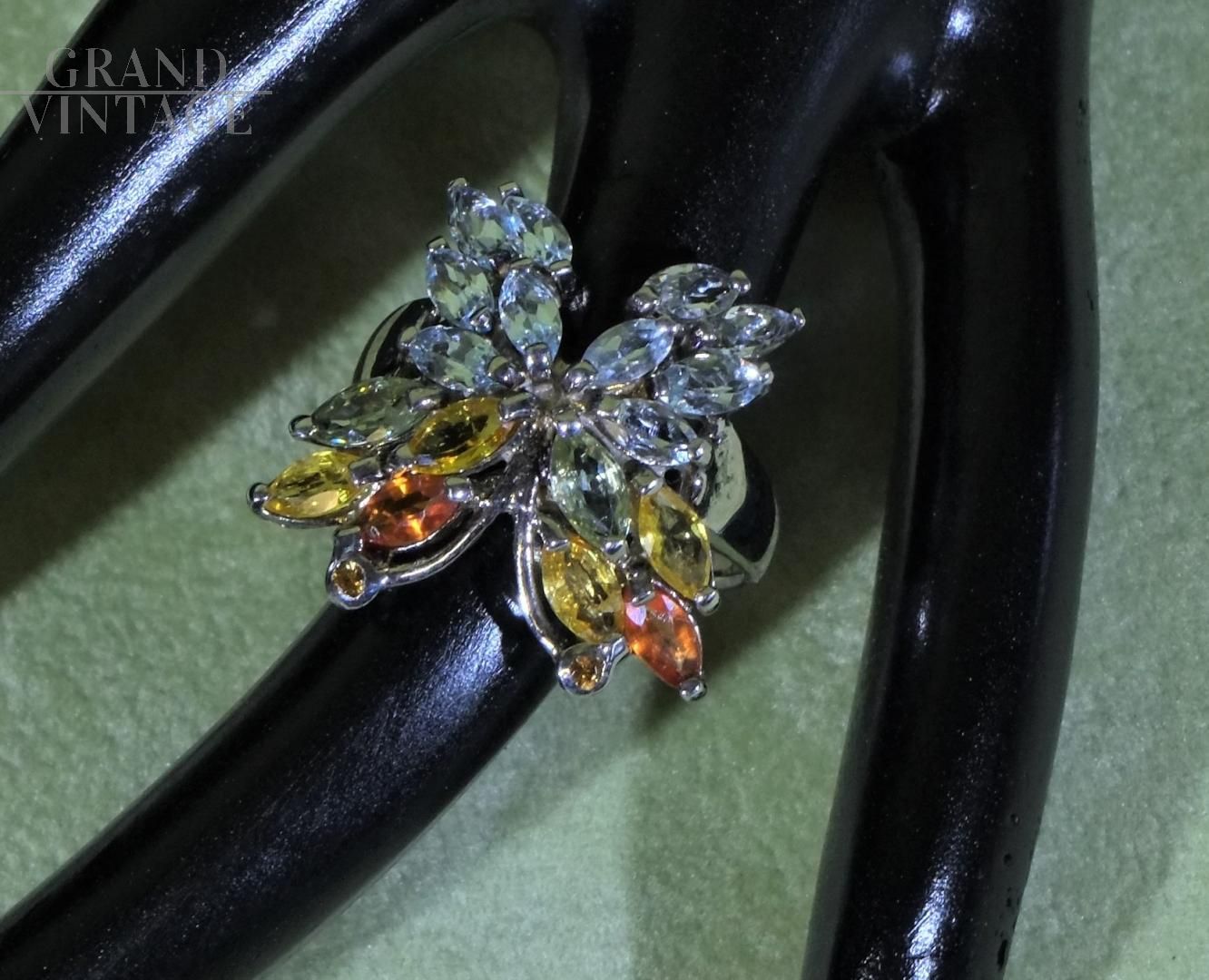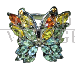 Le mani parlano, gli anelli sono i punti esclamativi dei nostri discorsi. Particolare anello vintage stile Art Déco in argento 925 a forma di farfalla, formato da zaffiri, acquamarine e diopside cromato con taglio Marquise.