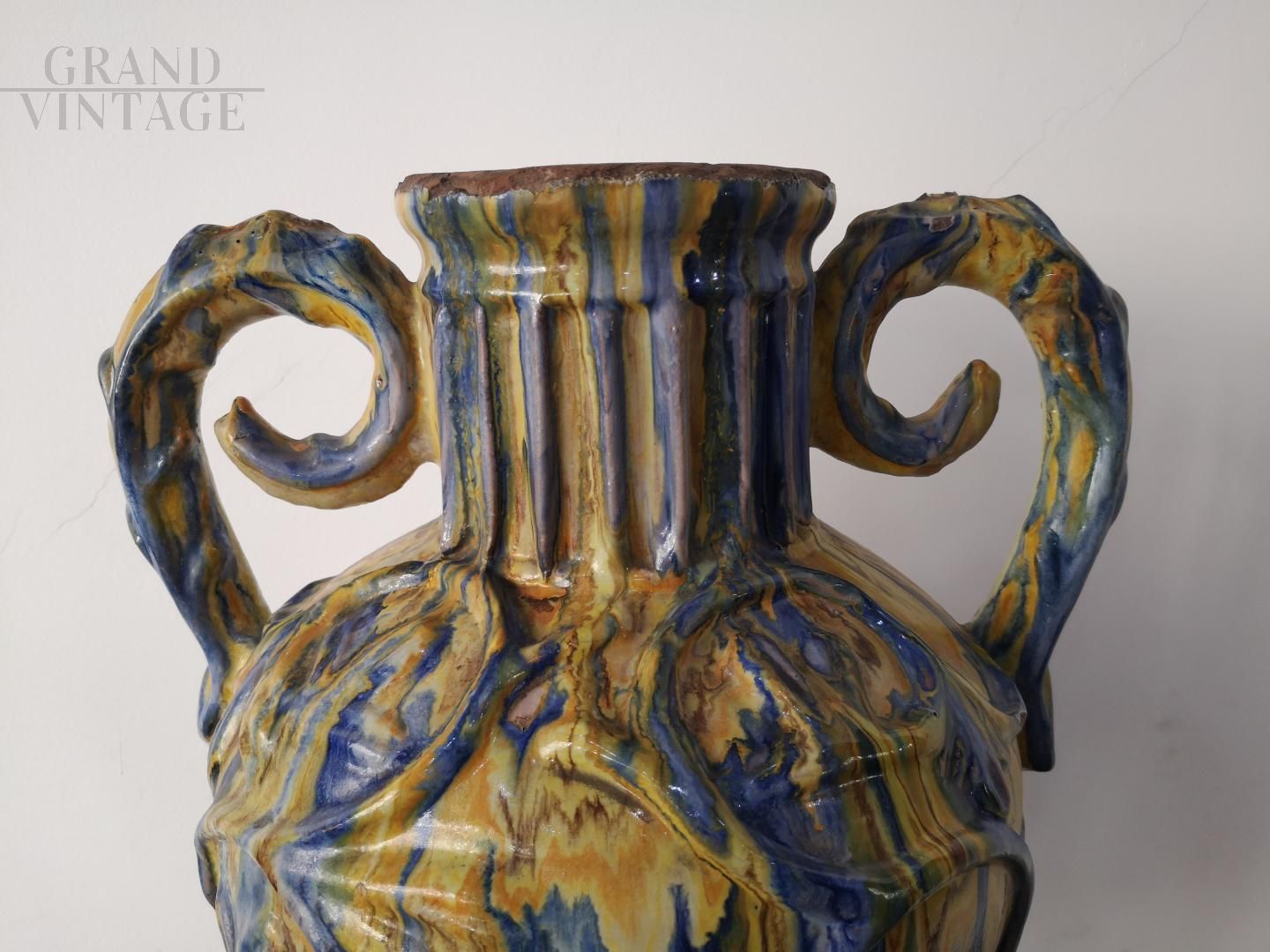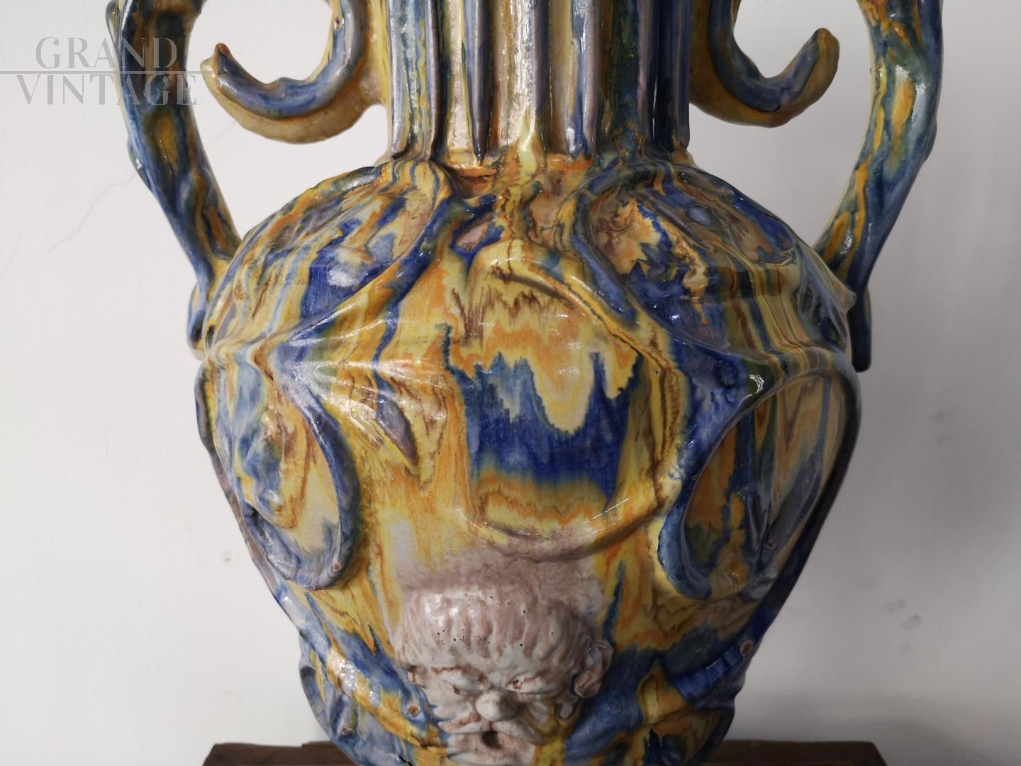 Anfora antica in ceramica di Caltagirone di metà '800 raffigurante il mascherone di un satiro, decorata solo da un lato.