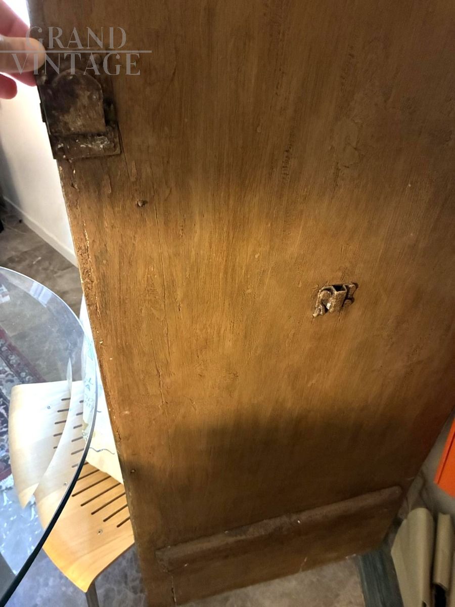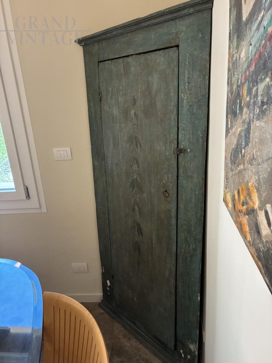 Angoliera pisana rustica antica del '600 completamente originale in legno di quercia in pittura verde con motivo floreale sull'anta. Su una cornice sono presenti alcune scrostature del tempo. Acquistata nel secondo dopoguerra da antiquari fiorentini.