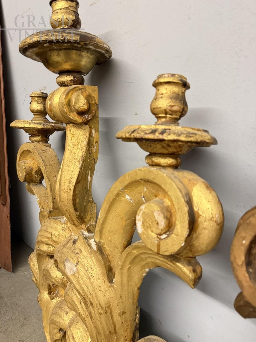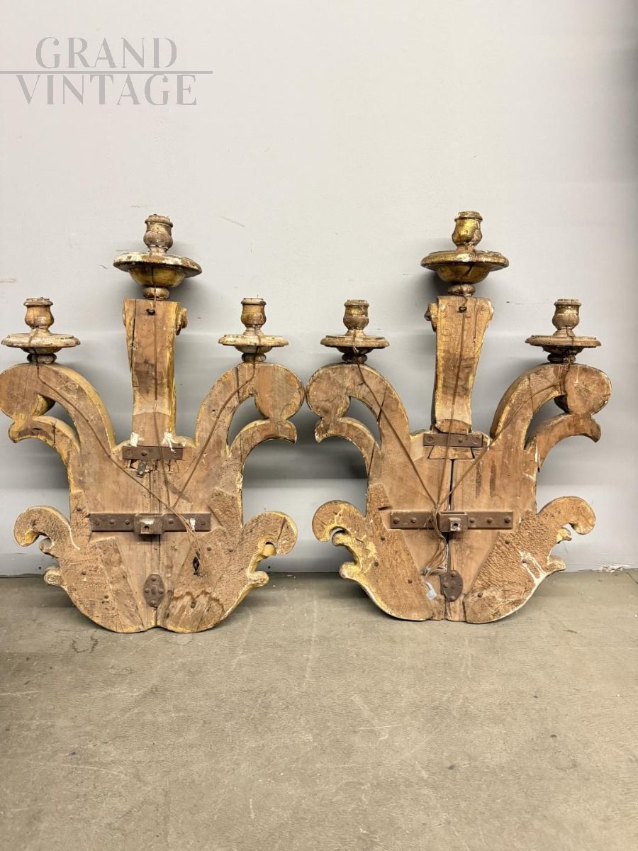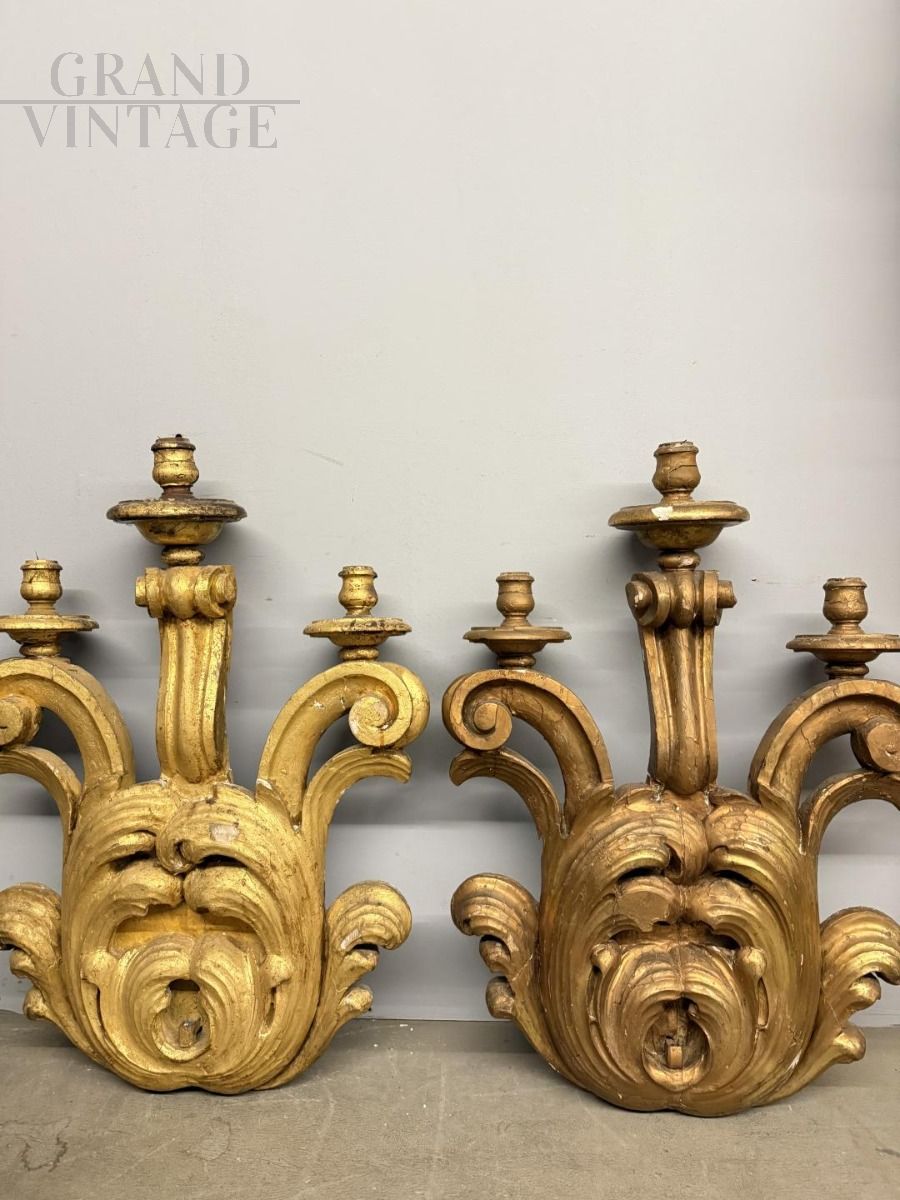 Antica coppia di grandi applique in legno dorato e intagliato, XIX secolo