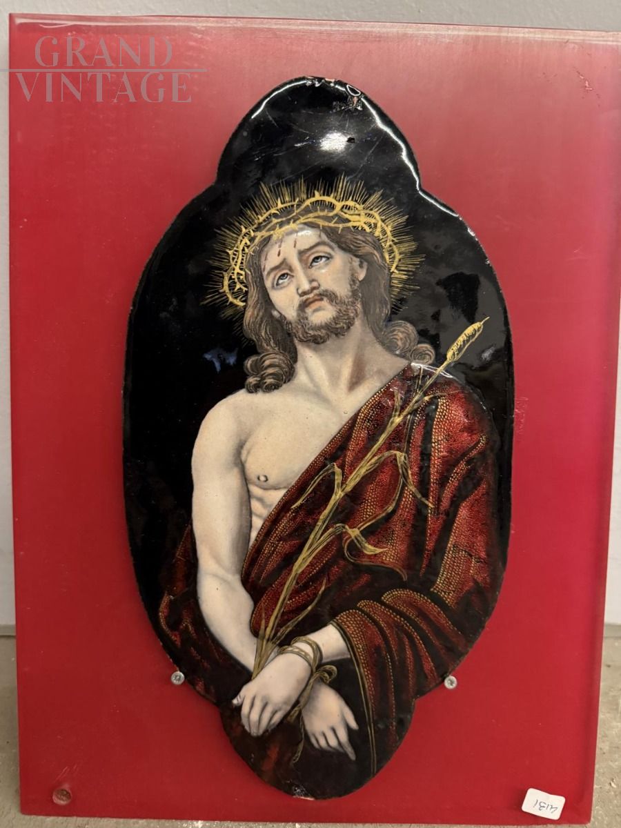 Antica placca in porcellana Limoges con Cristo dipinto a smalto, metà '800