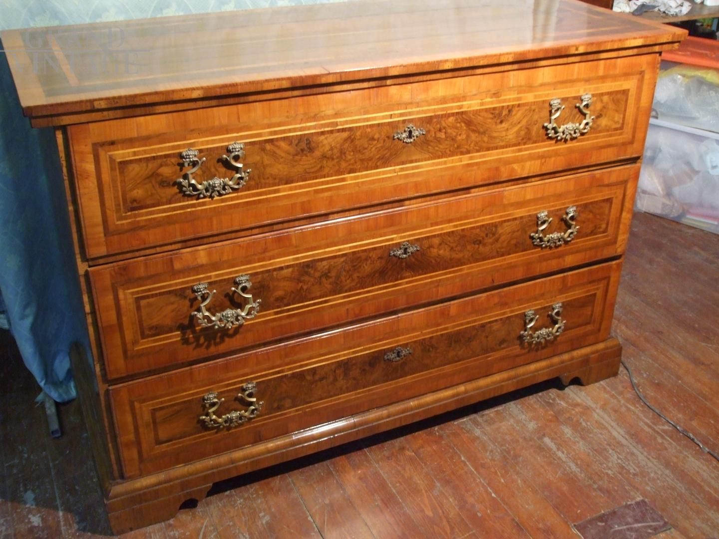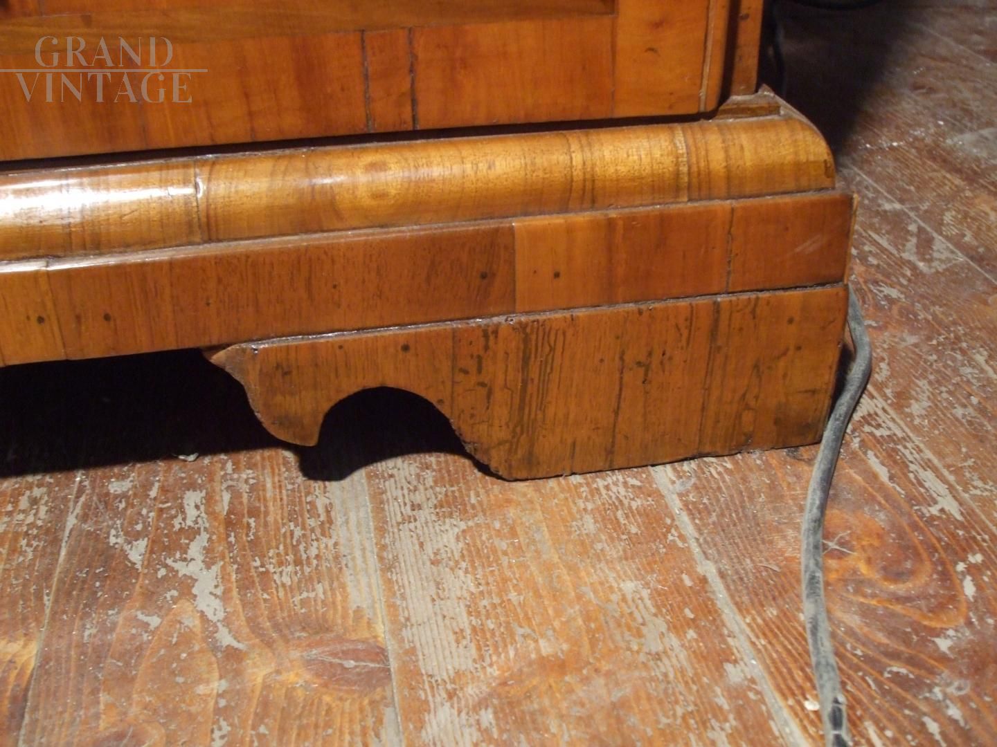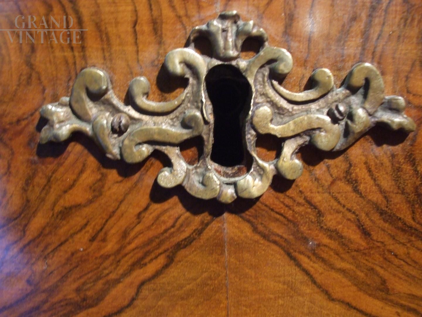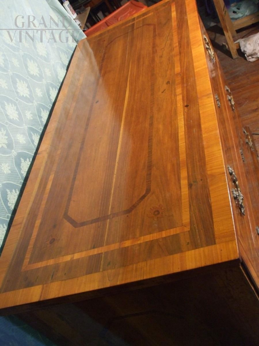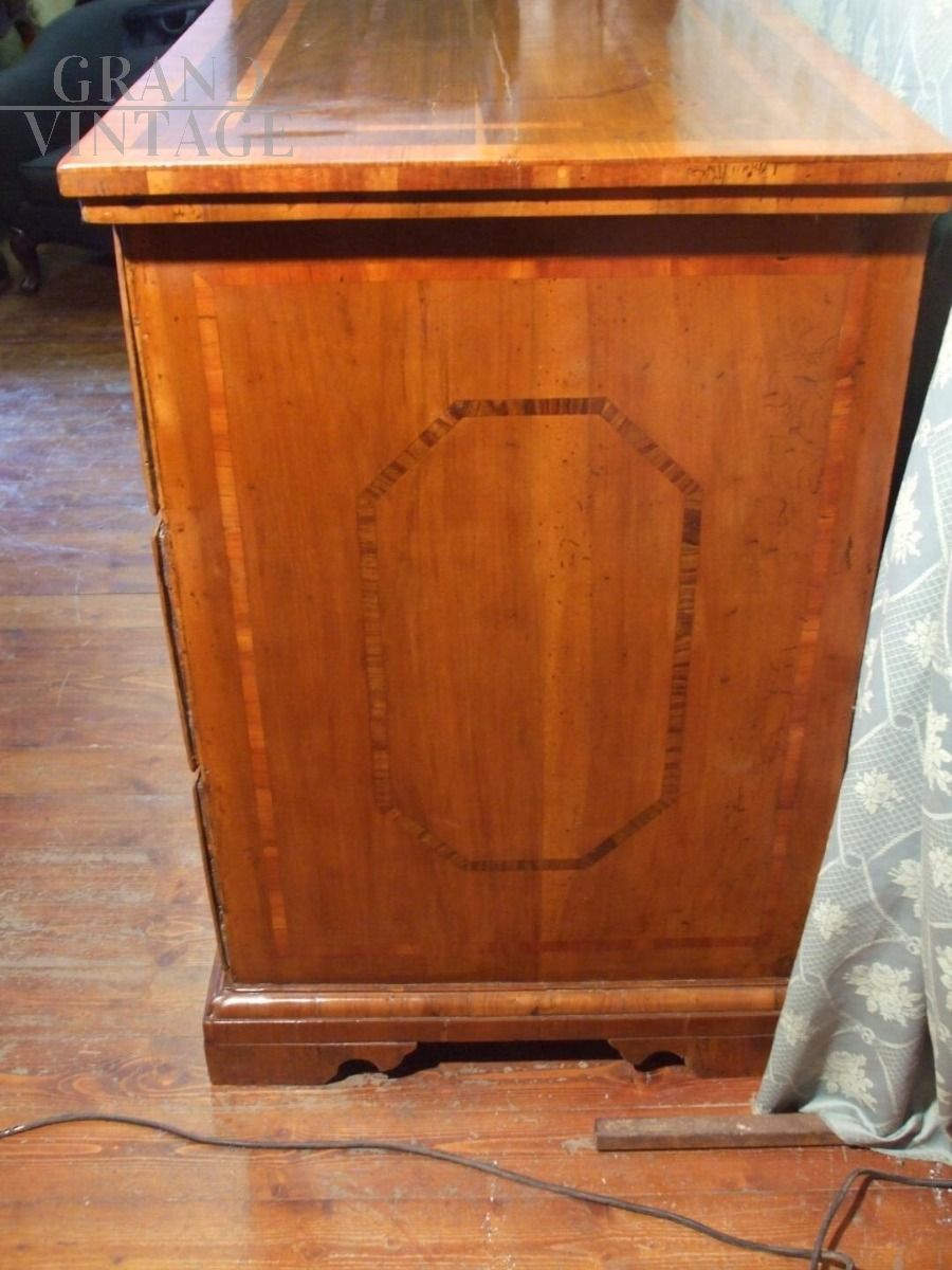 Cassettone Lombardo lastronato e intarsiato con essenze miste pregiate (ciliegio, noce, radica di noce, bosso e bois de violette), maniglie e bocchette in bronzo. Serrature e chiave originali. Il mobile è databile nella prima metà del XVIII secolo.