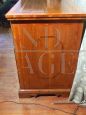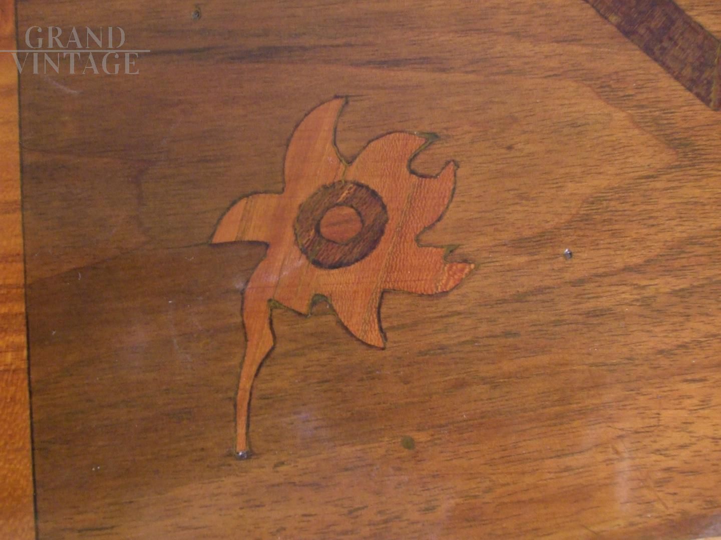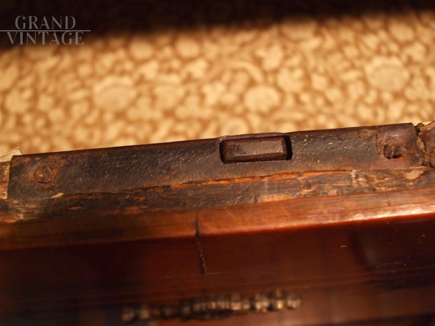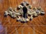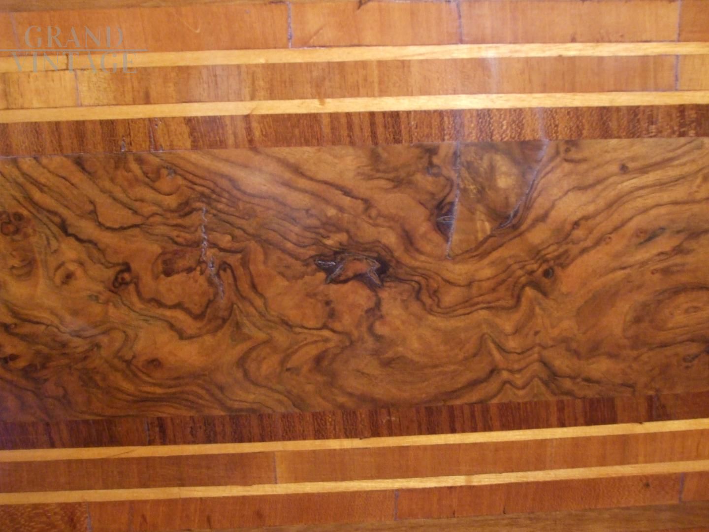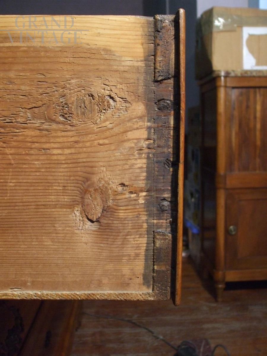 Cassettone Lombardo lastronato e intarsiato con essenze miste pregiate (ciliegio, noce, radica di noce, bosso e bois de violette), maniglie e bocchette in bronzo. Serrature e chiave originali. Il mobile è databile nella prima metà del XVIII secolo.