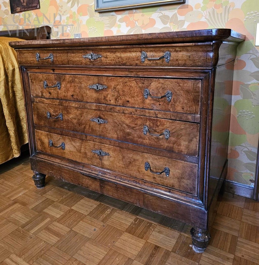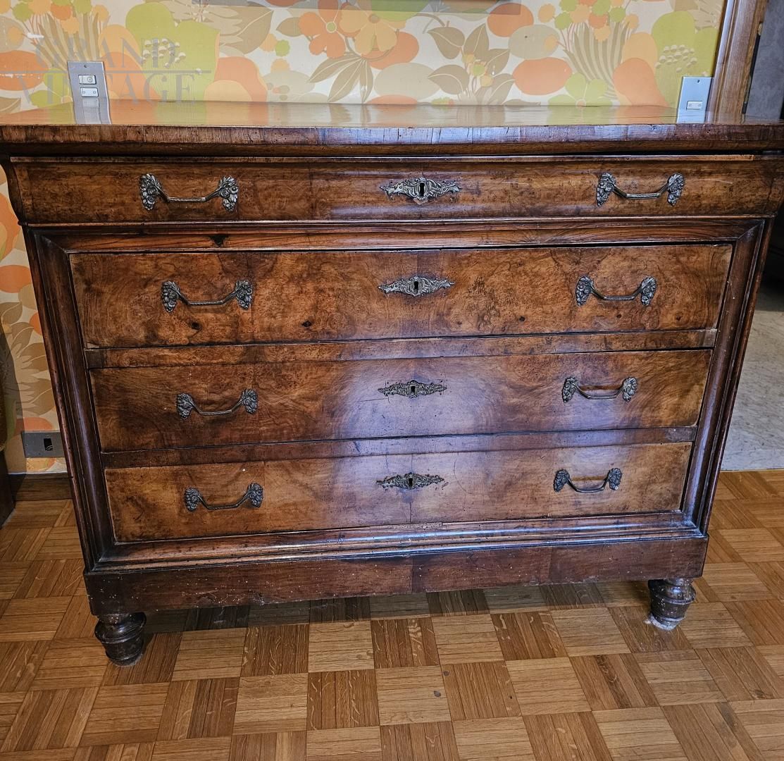 Comò canterano antico del XVII secolo in pregiata finitura in legno di noce e radica di noce, dotato di 3 cassetti profondi più un cassetto nella parte alta del mobile. I cassetti sono di ottima fattura e in ottimo stato. Struttura integra e perfettamente stabile, che appoggia su quattro piedi a cipolla. Piano superiore di appoggio in ottimo stato di conservazione e con finitura originale, probabilmente si tratta di un'asse unica. Legno integro e senza evidenti segni di deterioramento.