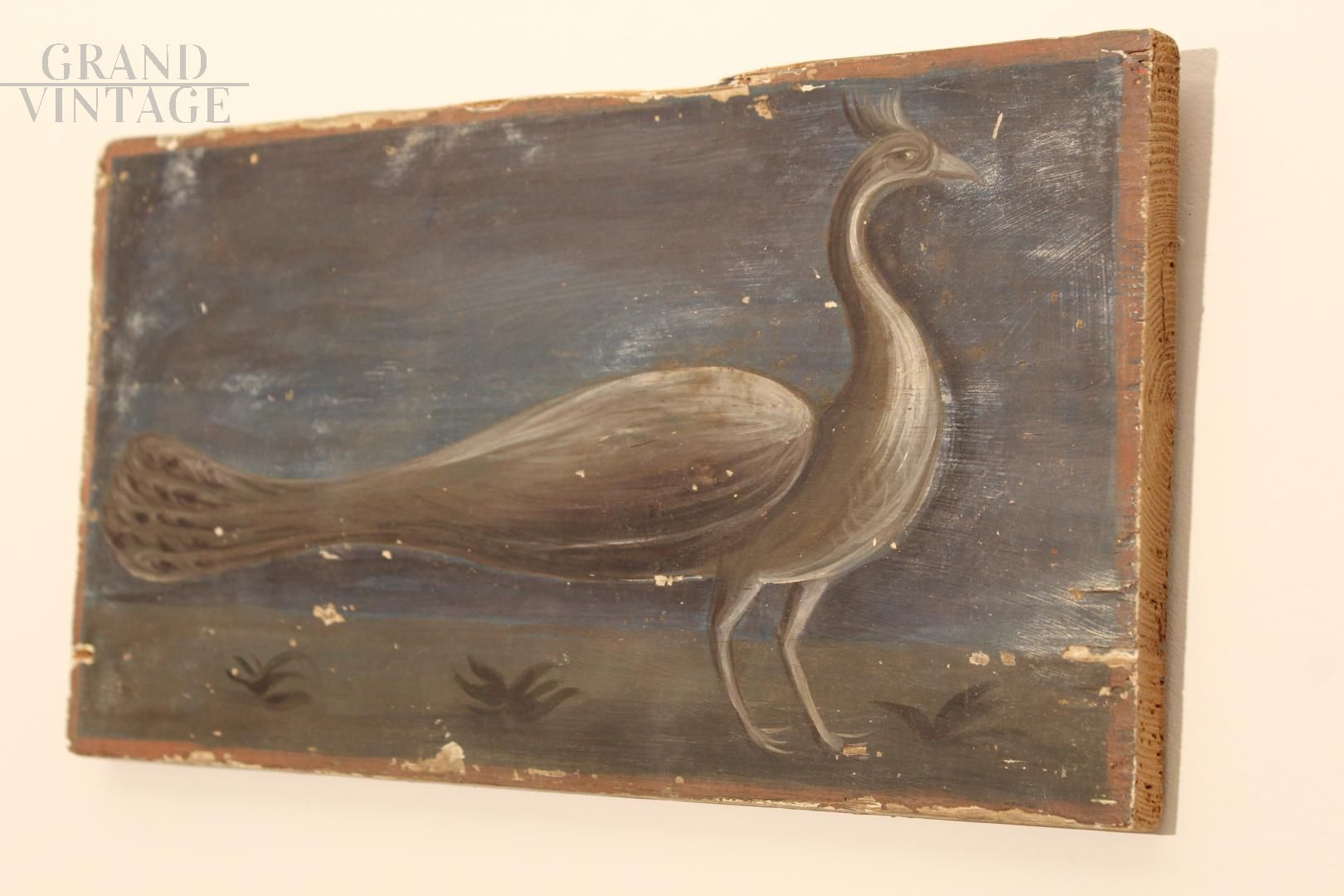 Antica decorazione da soffitto dell'Italia dell'800 dipinta a mano su pannello di legno raffigurante un pavone, con colorazioni che vanno dal blu al grigio.