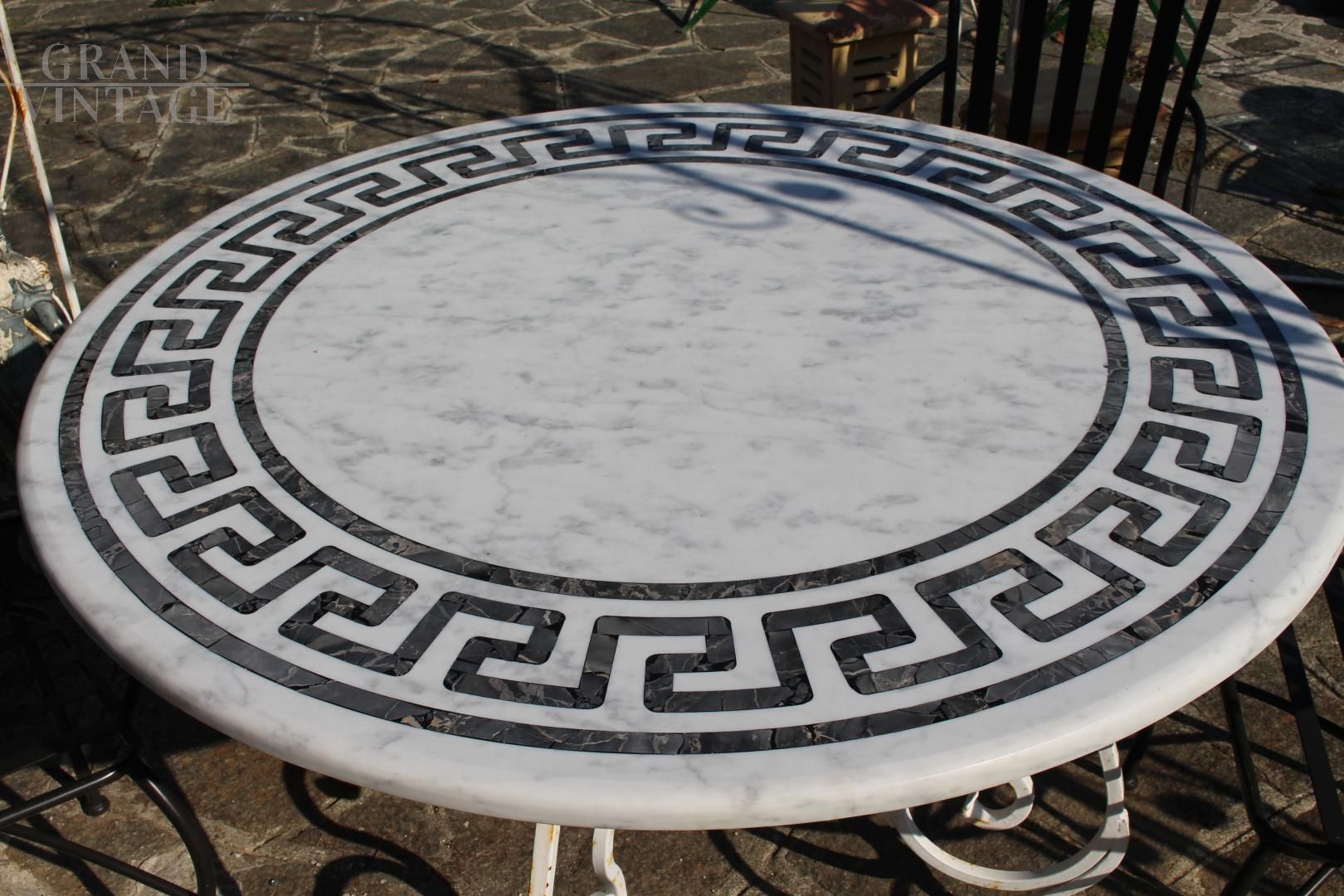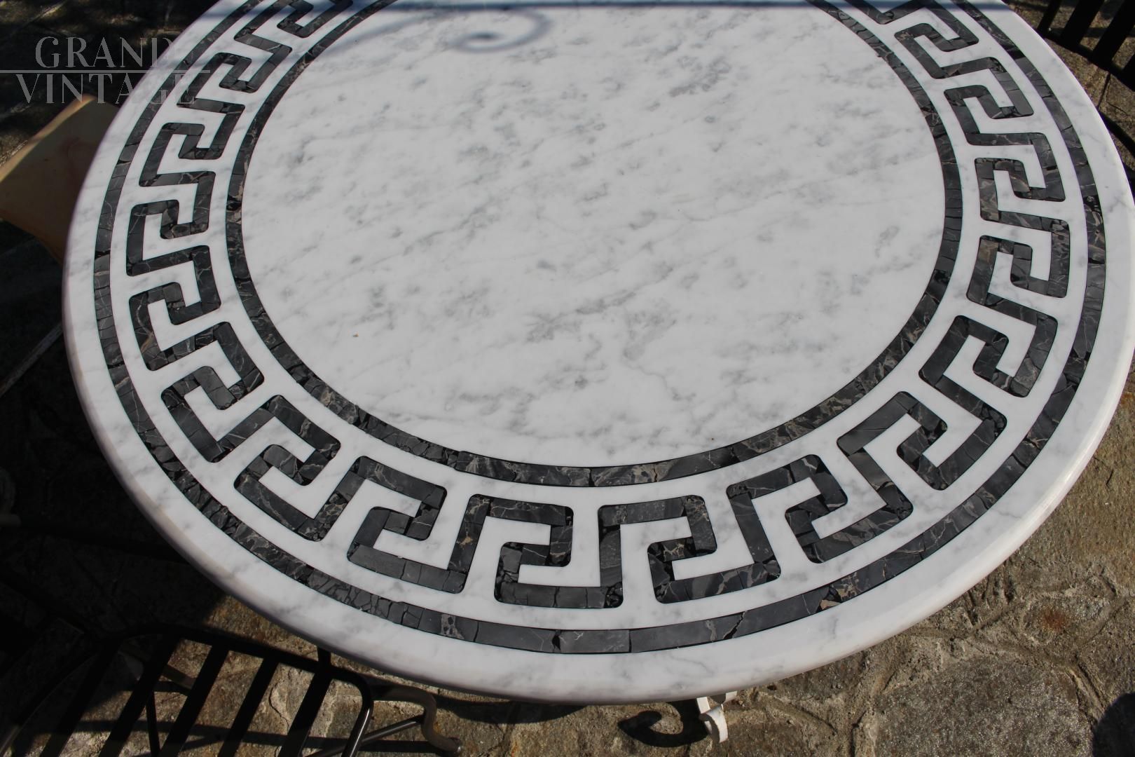 Bellissima lastra di marmo rotonda in marmo bianco di Carrara con ricco intarsio a forma di greca, ottimo come piano per un tavolo. In condizioni perfette, senza rotture o sbeccature.