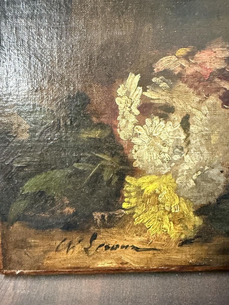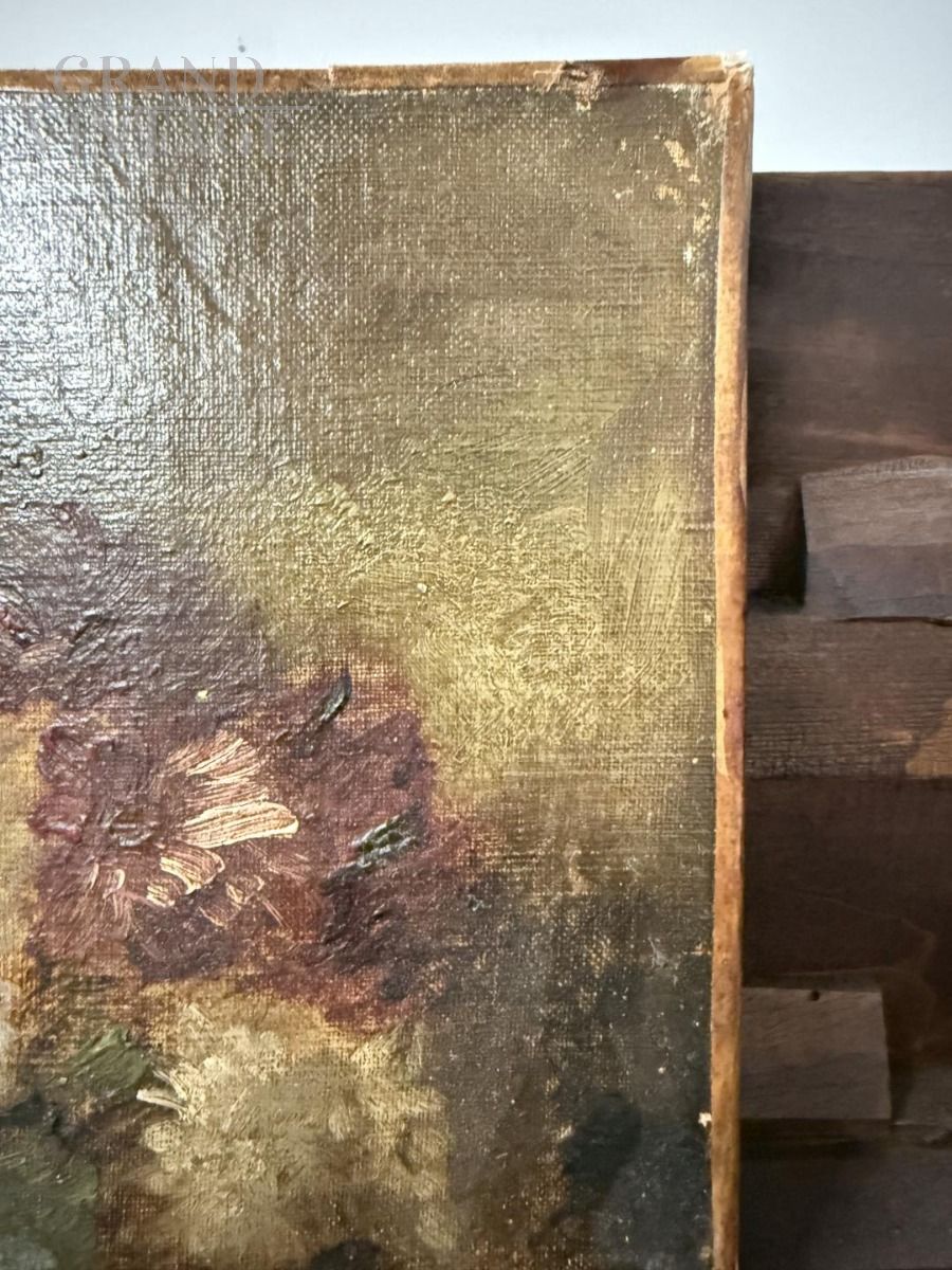 Antico piccolo dipinto ad olio su tela raffigurante natura morta con fiori, XIX secolo, 29 x 39cm, di bella qualità e in buono stato conservativo. Firmato.