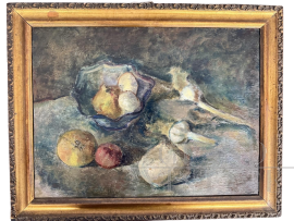 Antico piccolo dipinto olio su tela con natura morta, XIX secolo