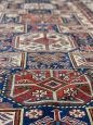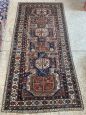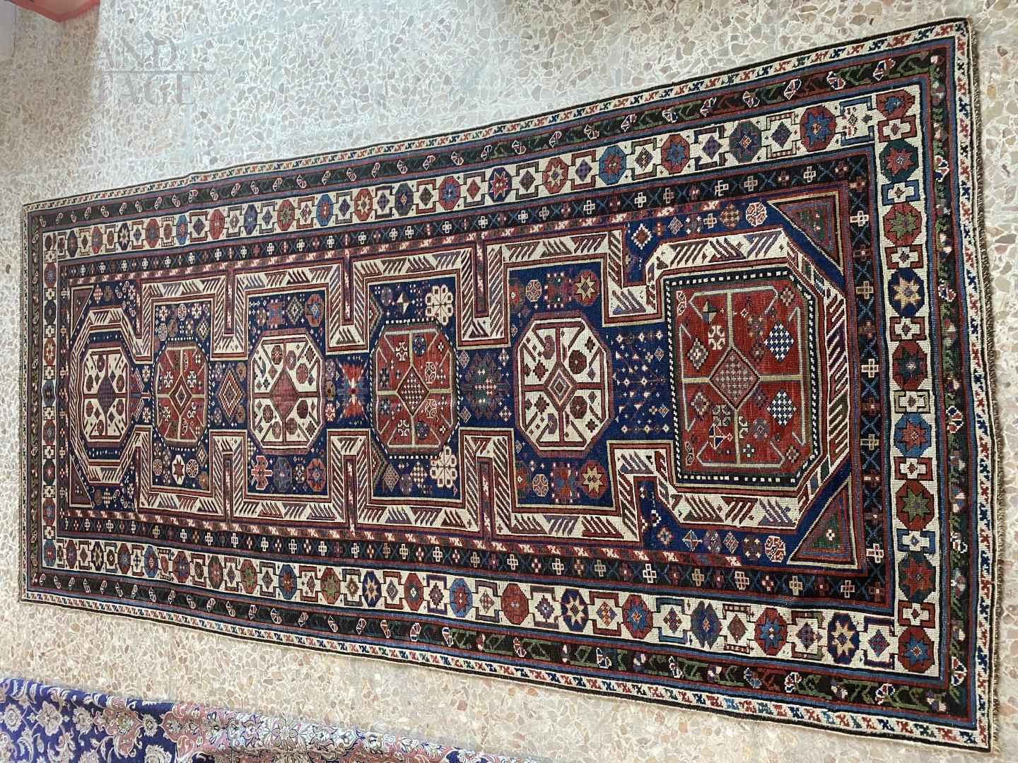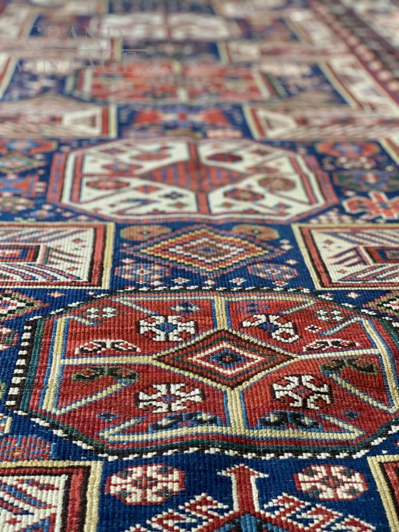 Tappeto caucasico della seconda meta’ dell’800, stato di conservazione ottimo, trama ordito e vello in lane policrome colorate vegetalmente. Tappeto corredato di certificato di autenticità’ rilasciato da perito della camera di commercio di Milano.