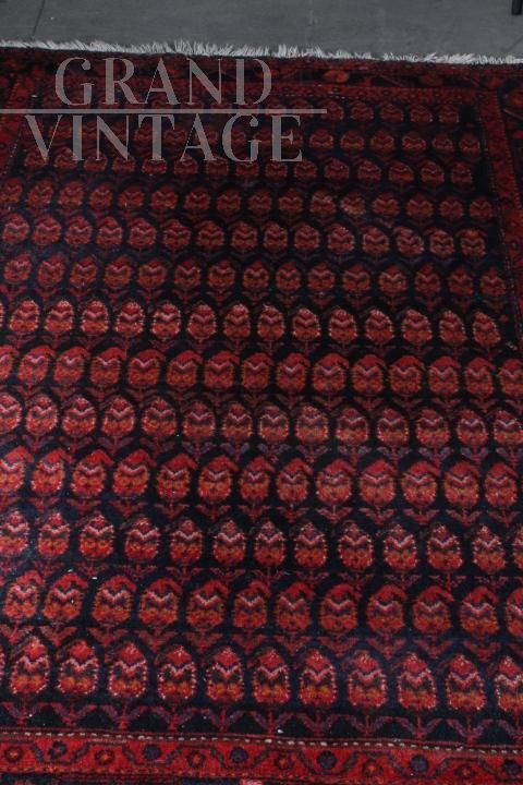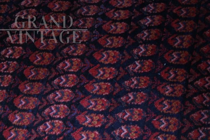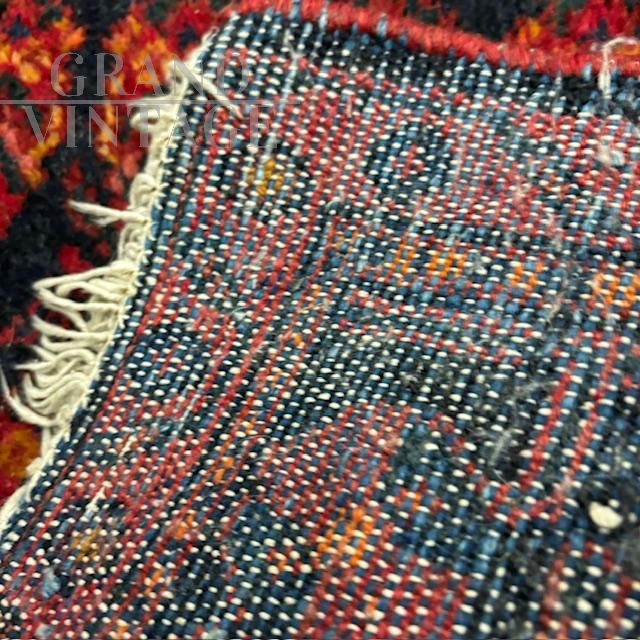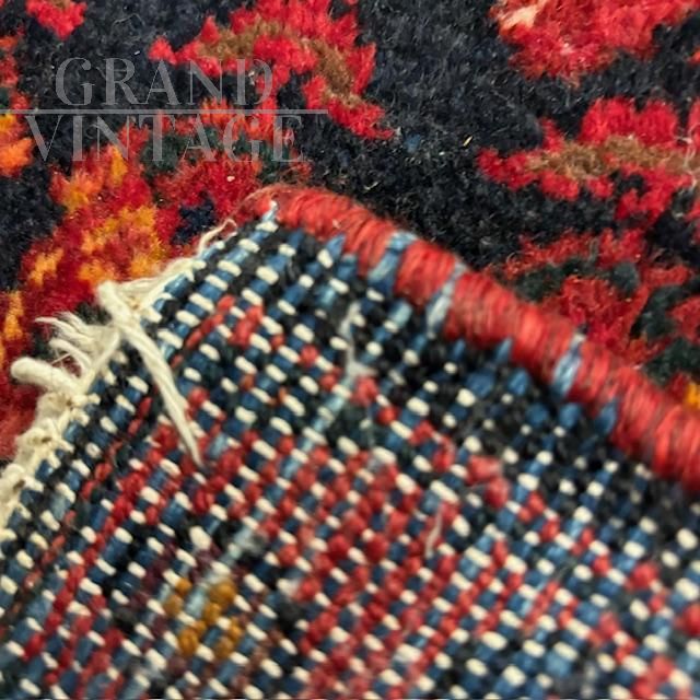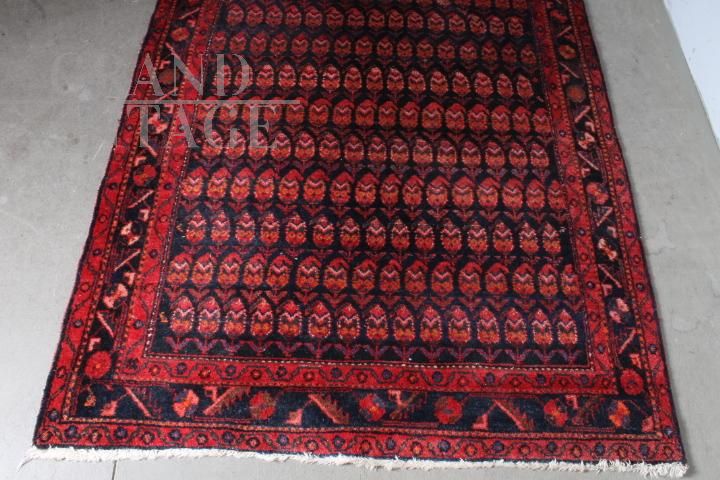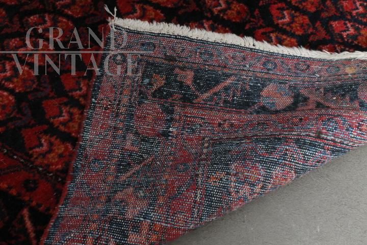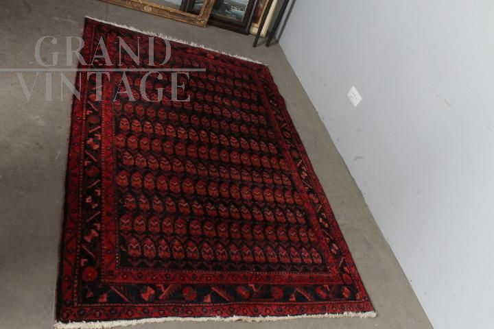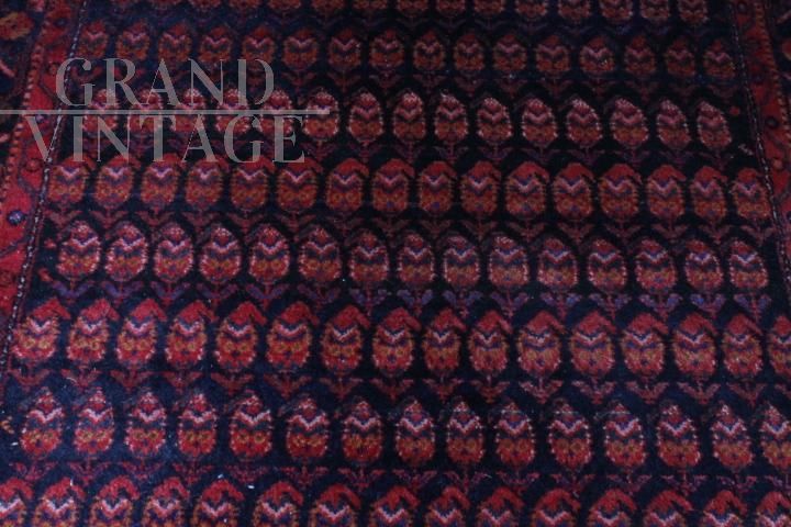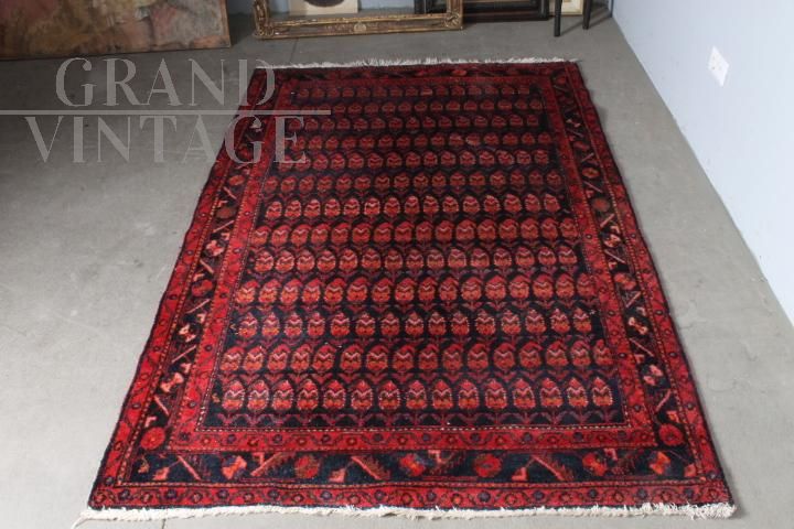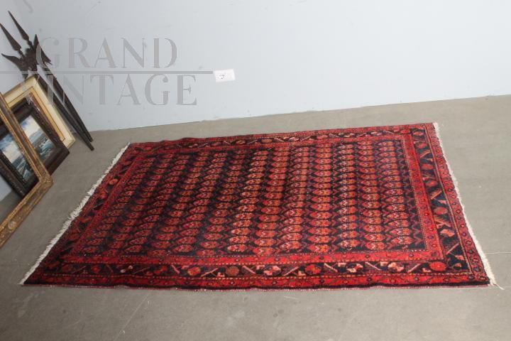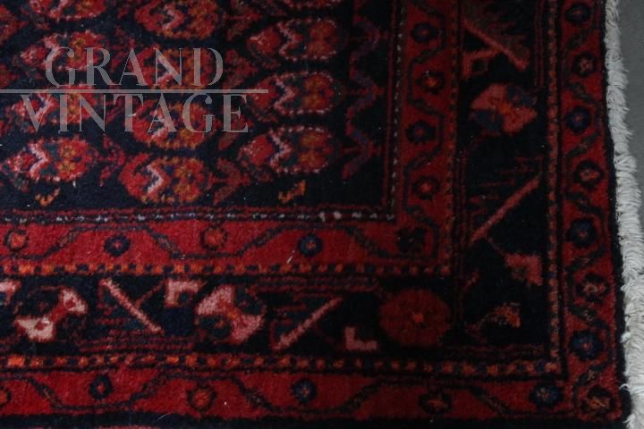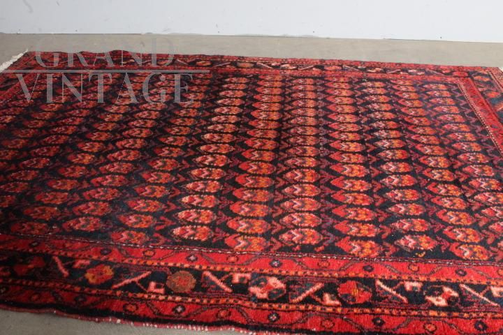 Tappeto Hamadan Turco – Persiano vintage degli anni '50 con sfondo rosso e lavorazione a spighe con toni del blu e dell’arancio, annodato in lana molto raffinata, in stato di conservazione molto buono, proveniente da una collezione privata.
