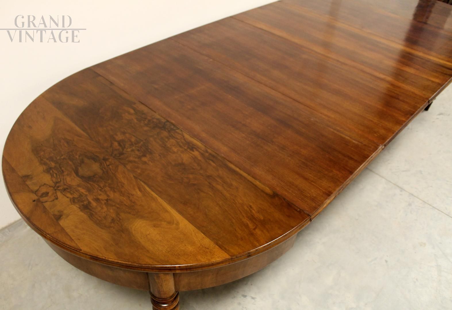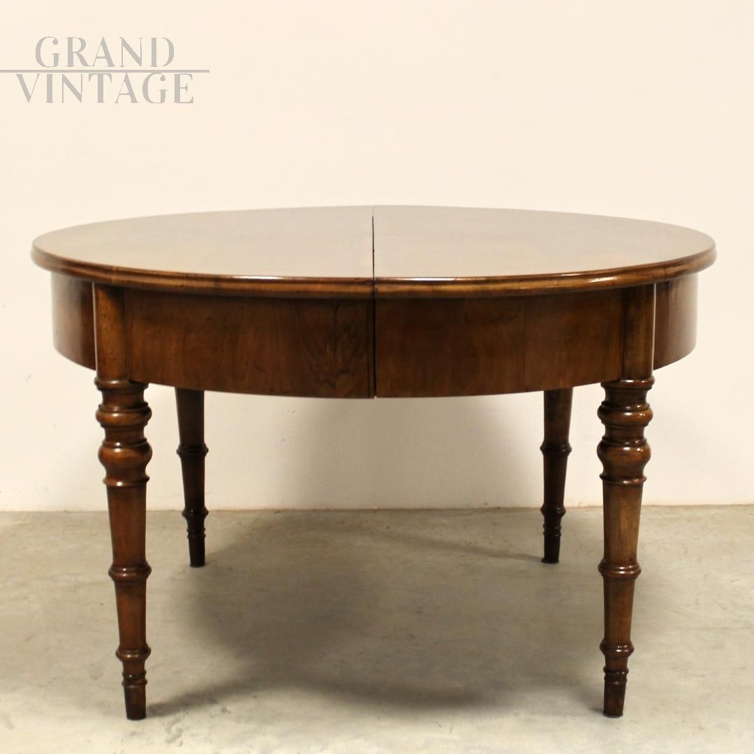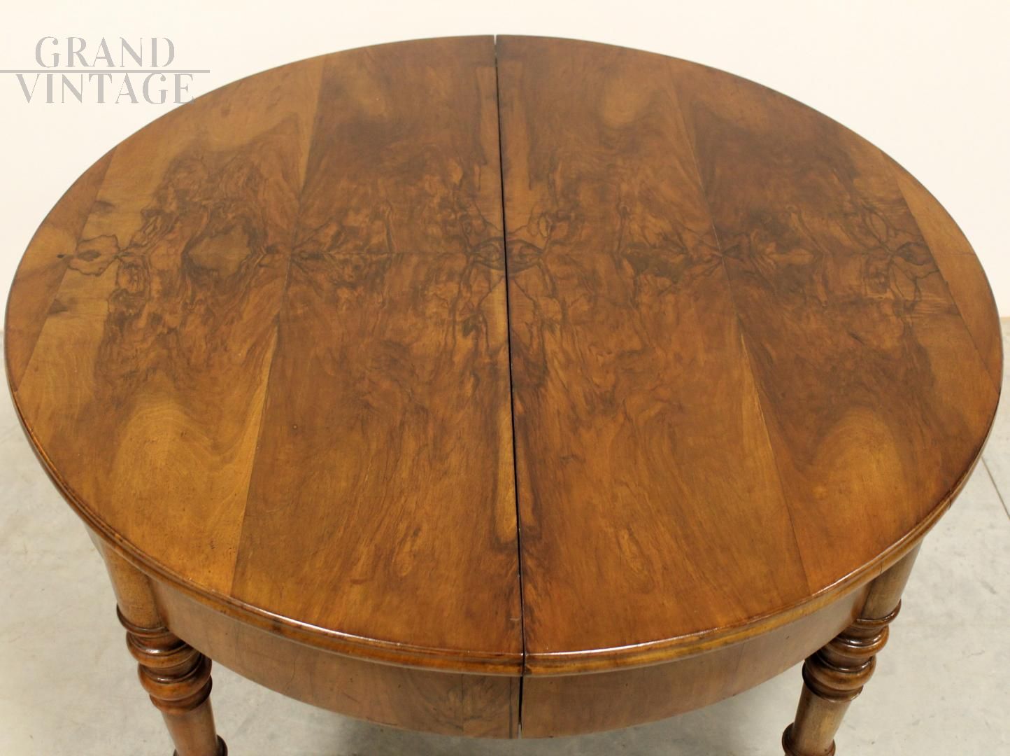 Extendable Louis Philippe table in walnut and walnut veneer from the second half of the 19th century, Louis Philippe era, from Italy. In perfect condition.