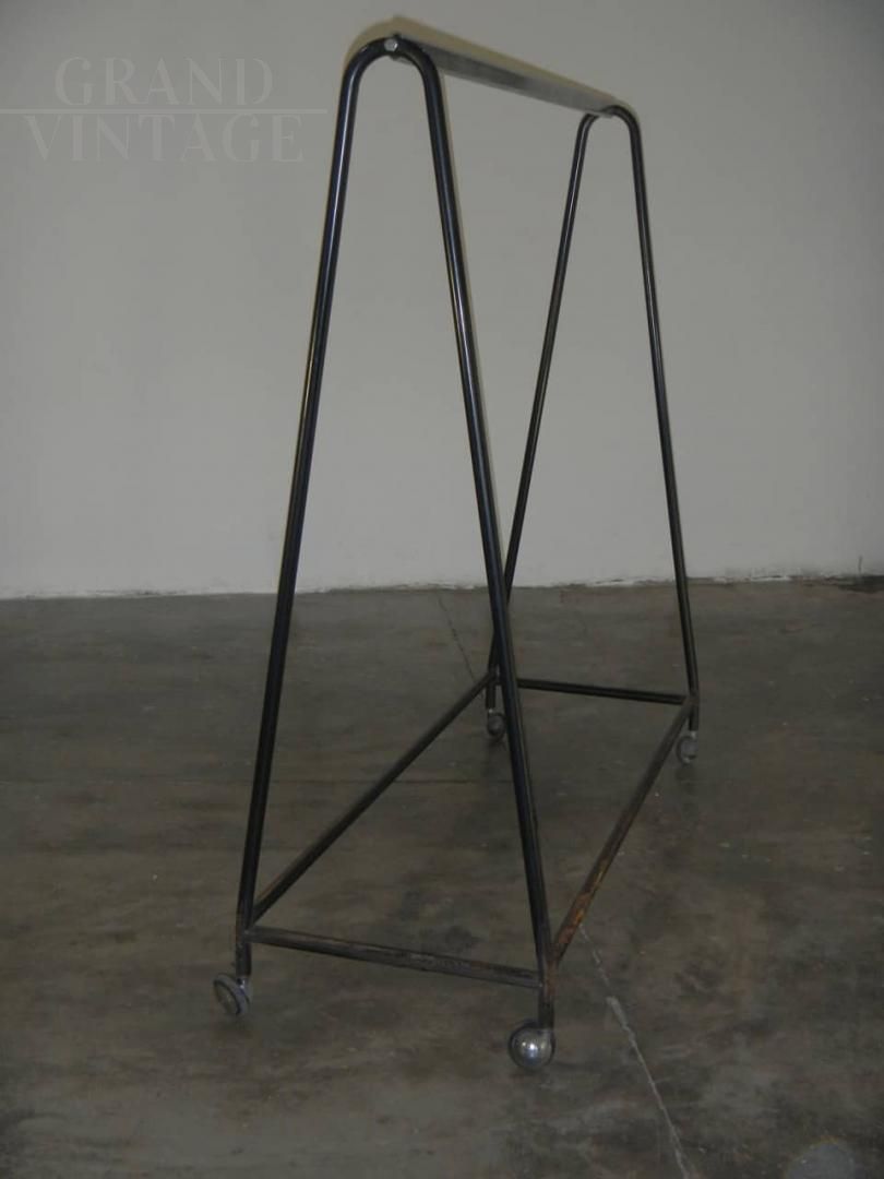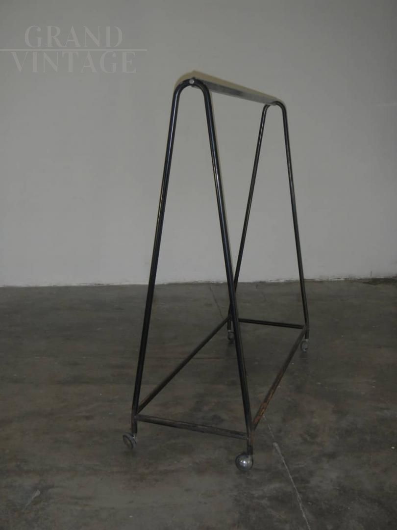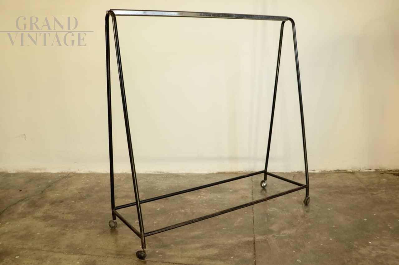 Appenderia appendiabiti stender vintage in tubo di ferro verniciato in nero, con palo superiore cromato, ruote funzionanti.