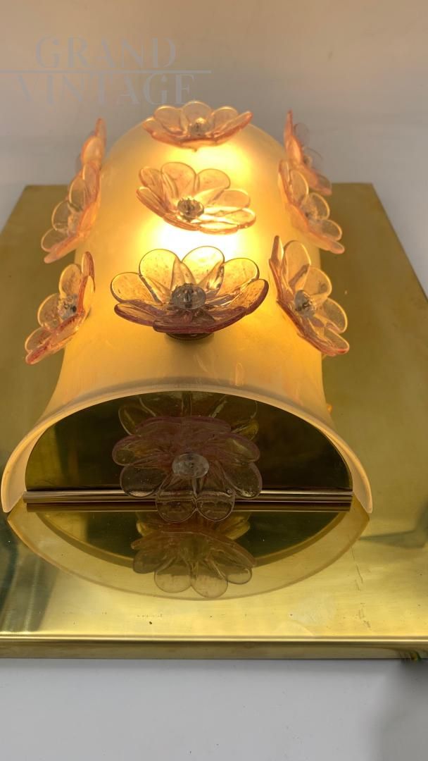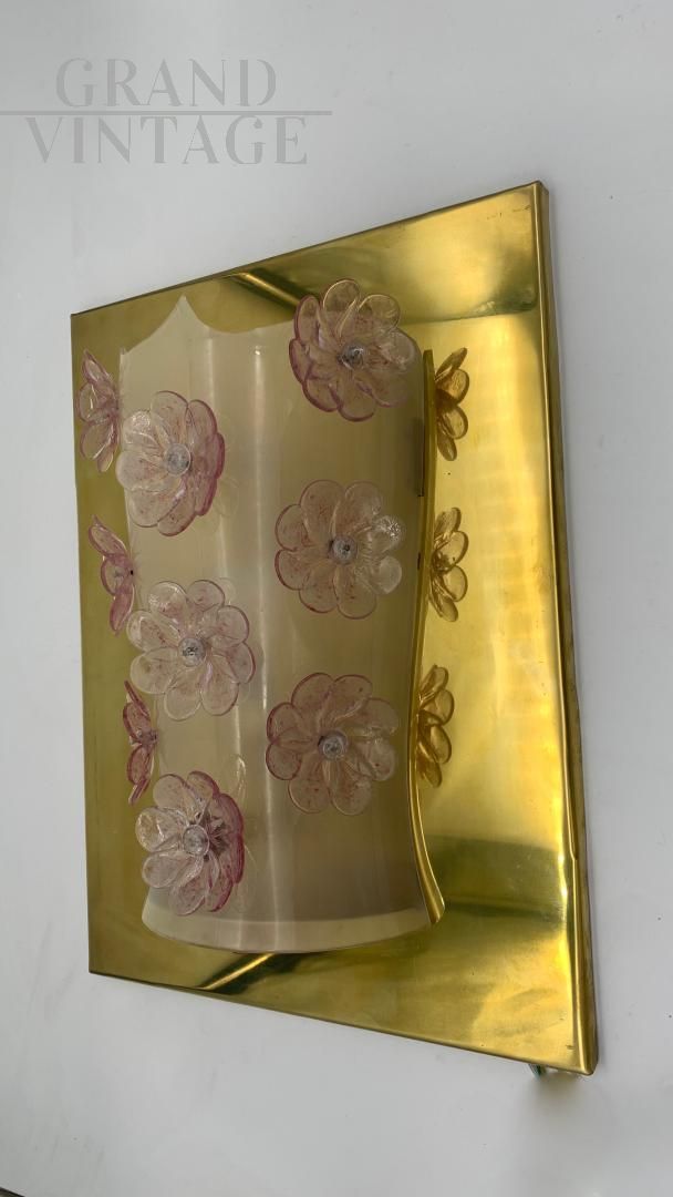 Lampada da parete con base rettangolare in ottone lucido su cui è montata una struttura centrale curva in vetro satinato, molato a mano, decorata con fiori tridimensionali in vetro trasparente e rosa, fissati con elementi in vetro al centro di ciascun fiore; la luce interna diffonde un’illuminazione calda e avvolgente che mette in risalto sia la texture satinata del vetro sia i riflessi dell'ottone, creando un effetto decorativo raffinato e scenografico.La struttura curva in vetro satinato ha un profilo dolcemente ondulato che accentua la morbidezza dell'insieme, mentre i fiori applicati, ciascuno composto da petali in vetro trasparente leggermente venato di rosa, donano un tocco romantico e artigianale; i petali sono leggermente irregolari, suggerendo una realizzazione manuale.