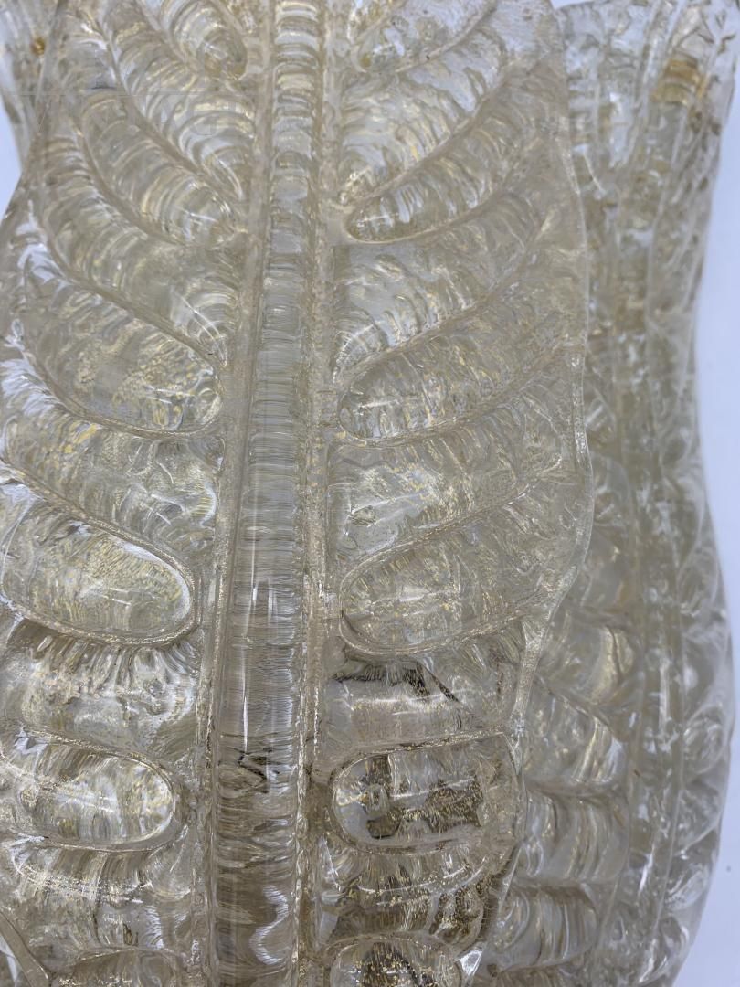 Fantastica e rara applique singola attribuita a Barovier in vetro di Murano trasparente con oro e graniglia di vetro nella base, Italia anni '80. In buone condizioni, con vetro perfetto, a parte una crepa nella foglia centrale, che non è facimlmente visibile e che è presente nella lampada da diversi anni senza allargarsi. Struttura in ottone in buone condizioni con pochi segni del tempo. La lampada ha un attacco permlampadina di tipo E27 in metallo.