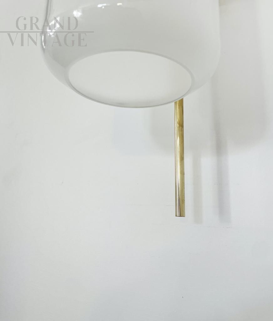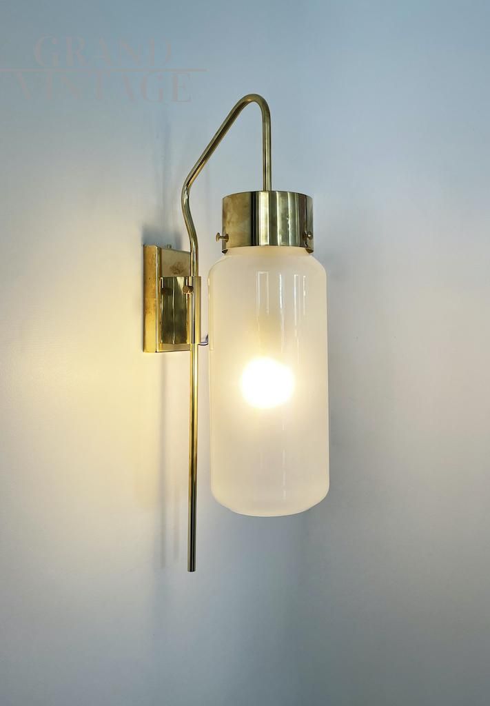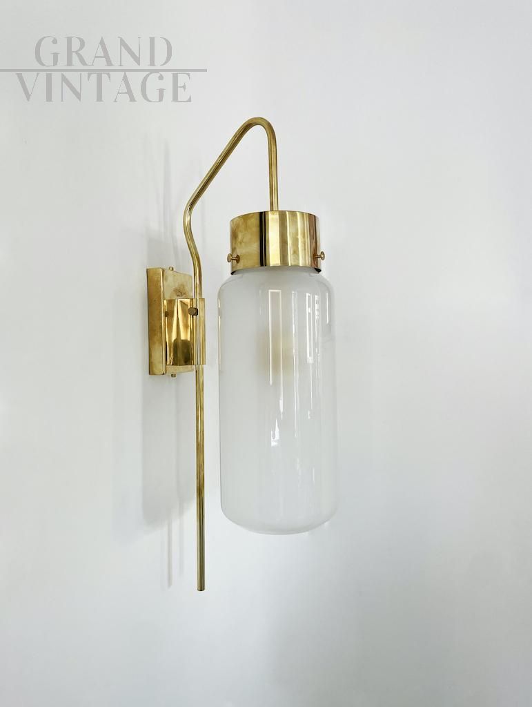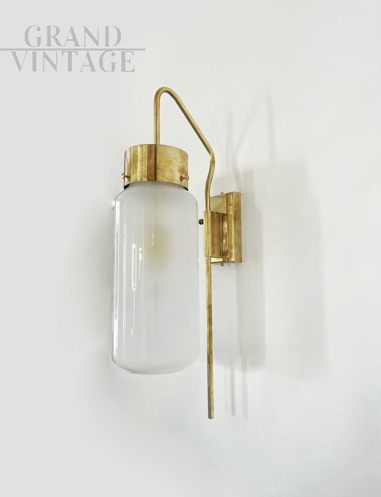 Elegante lampada da parete modello LP10 attribuibile a Luigi Caccia Dominioni per Azucena, eccezionalmente rara e meravigliosamente scultorea, realizzata in ottone e vetro opalino nel 1958 circa. Un design raffinato e moderno, realizzato da una delle icone italiane del Novecento. Disponibili diversi pezzi, il prezzo si riferisce alla singola lampada.