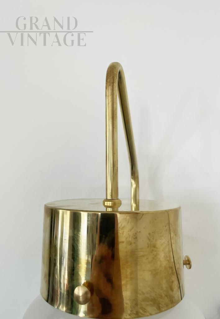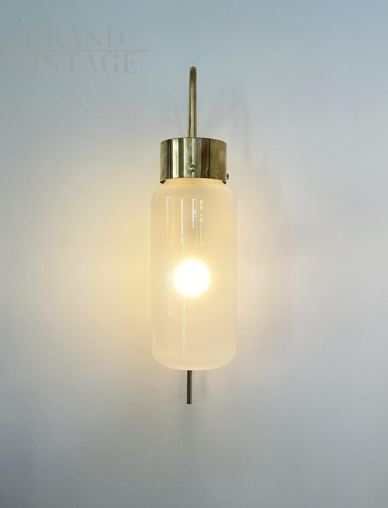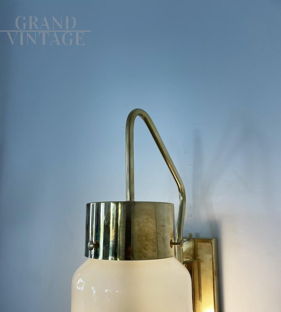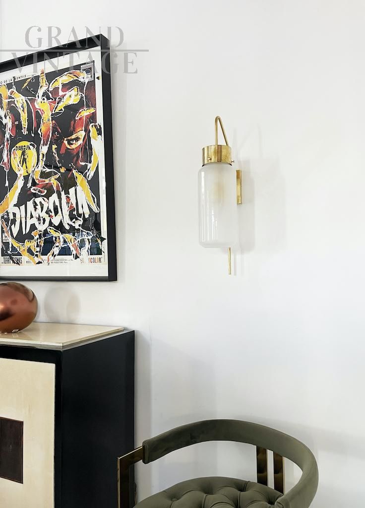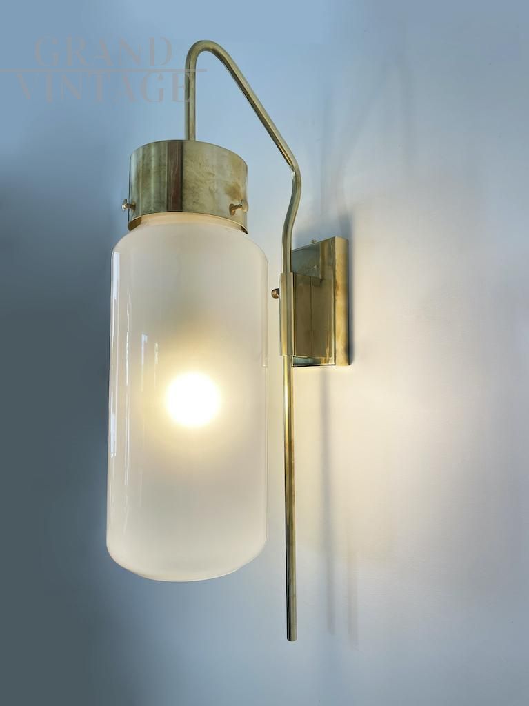 Elegante lampada da parete modello LP10 attribuibile a Luigi Caccia Dominioni per Azucena, eccezionalmente rara e meravigliosamente scultorea, realizzata in ottone e vetro opalino nel 1958 circa. Un design raffinato e moderno, realizzato da una delle icone italiane del Novecento. Disponibili diversi pezzi, il prezzo si riferisce alla singola lampada.