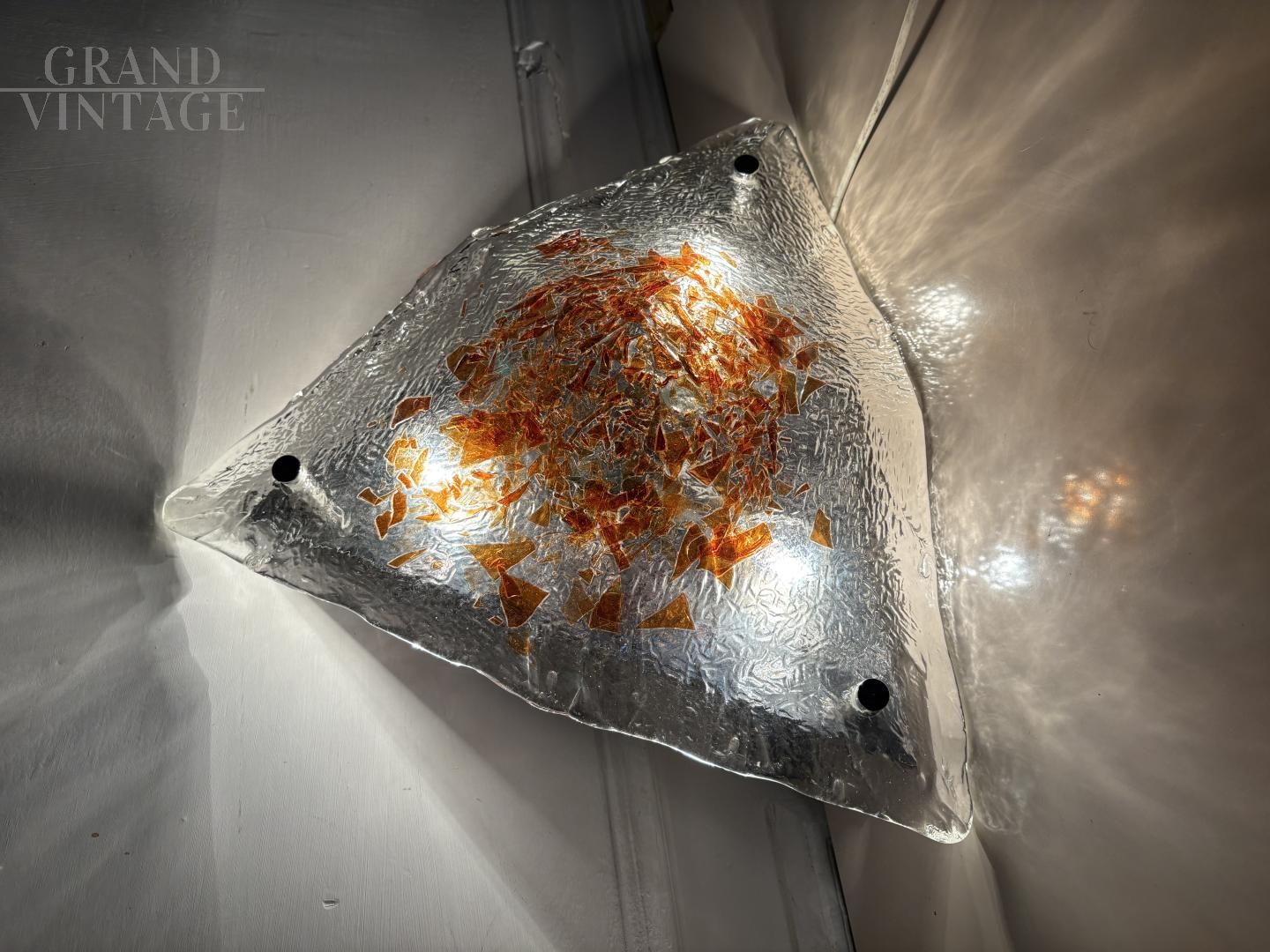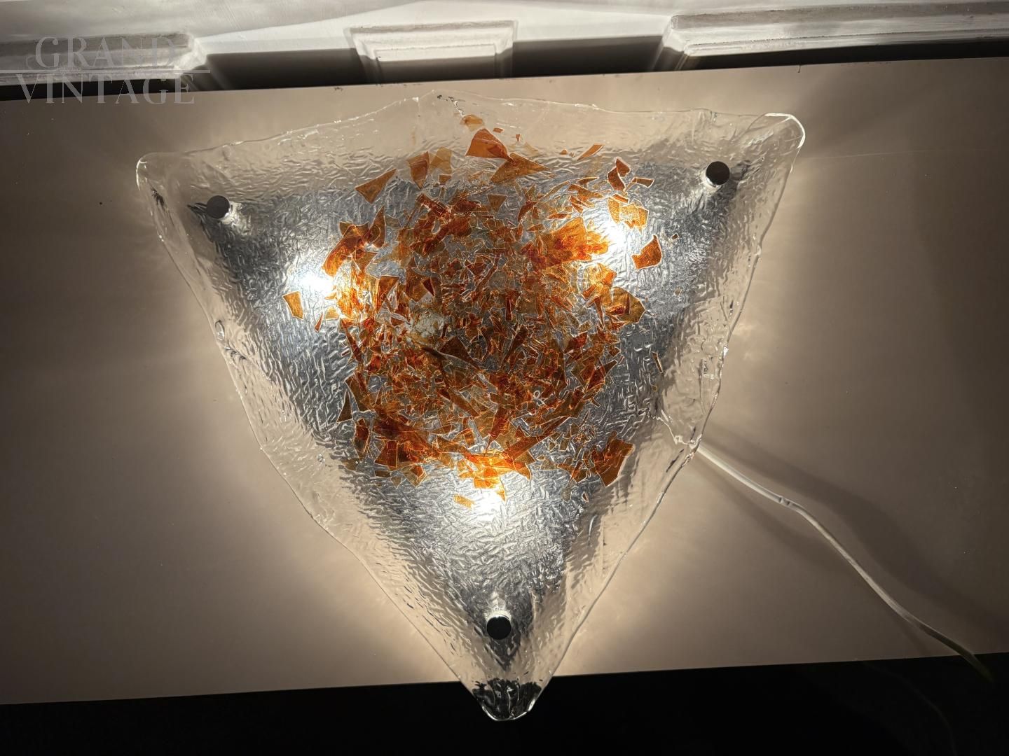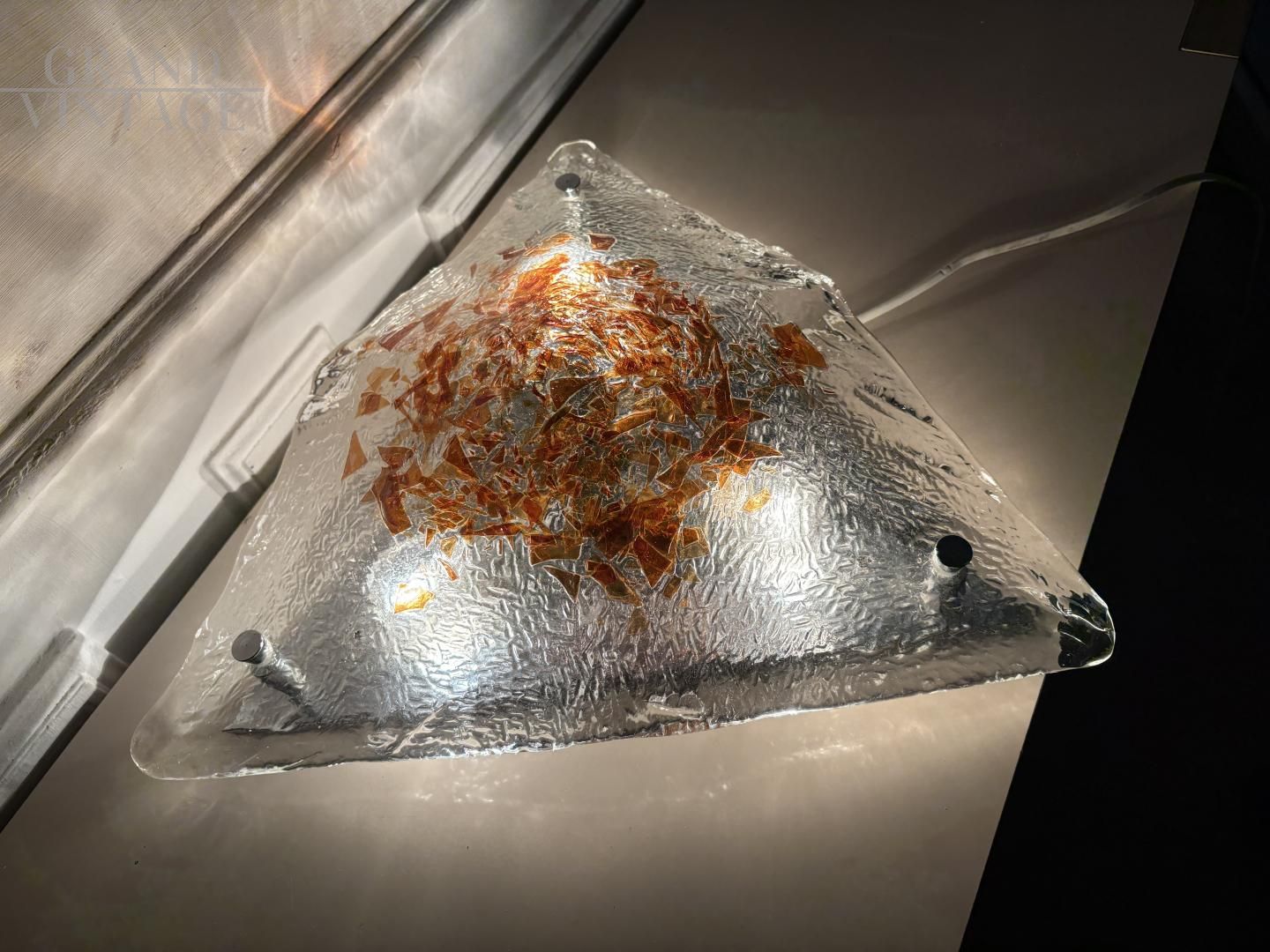 Applique plafoniera triangolare in vetro di Murano lavorato nei colori trasparente e ambrato, larghezza 43 cm, altezza 11 cm.