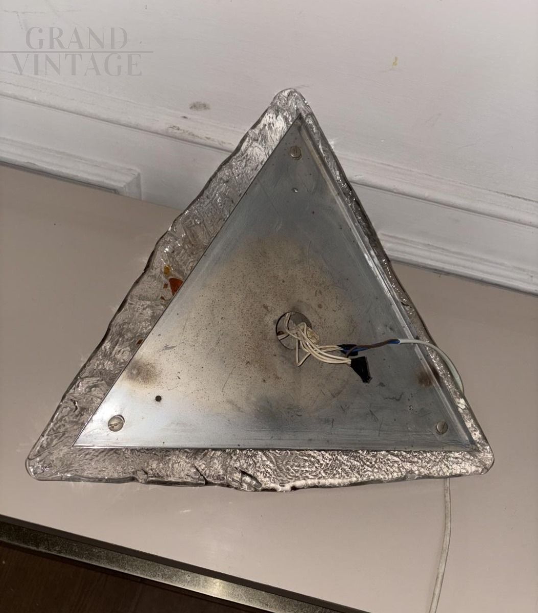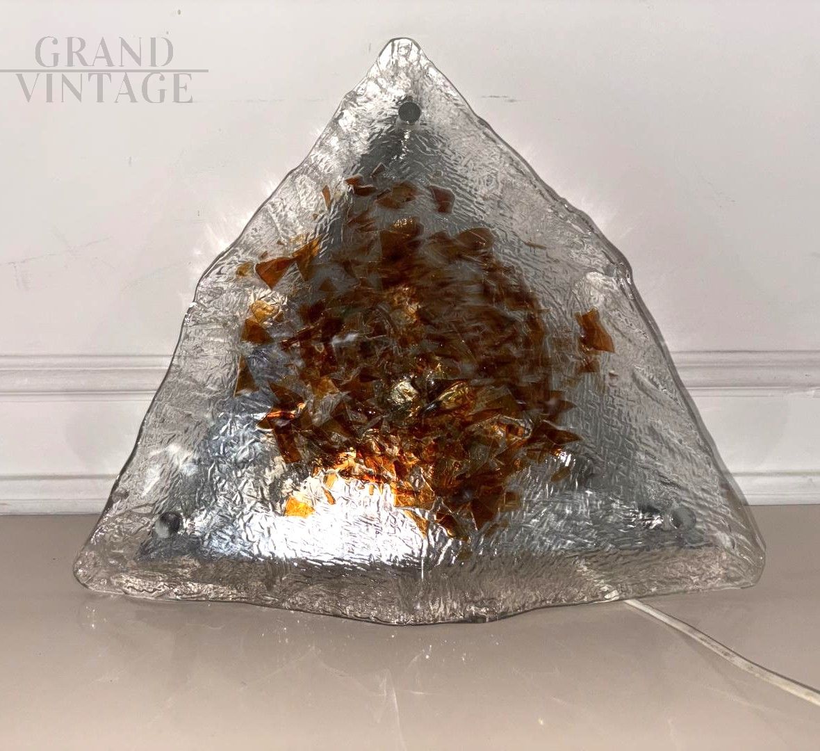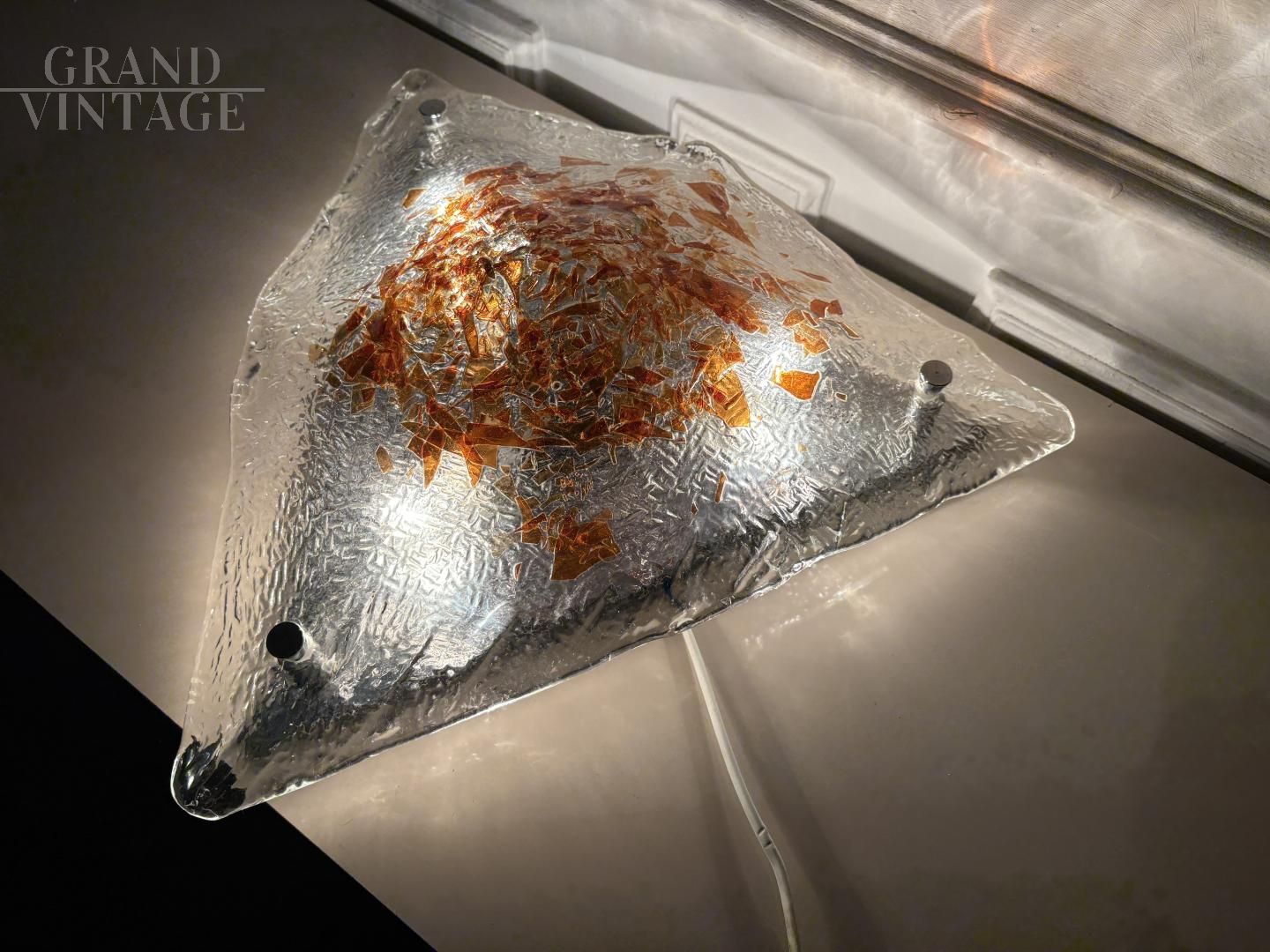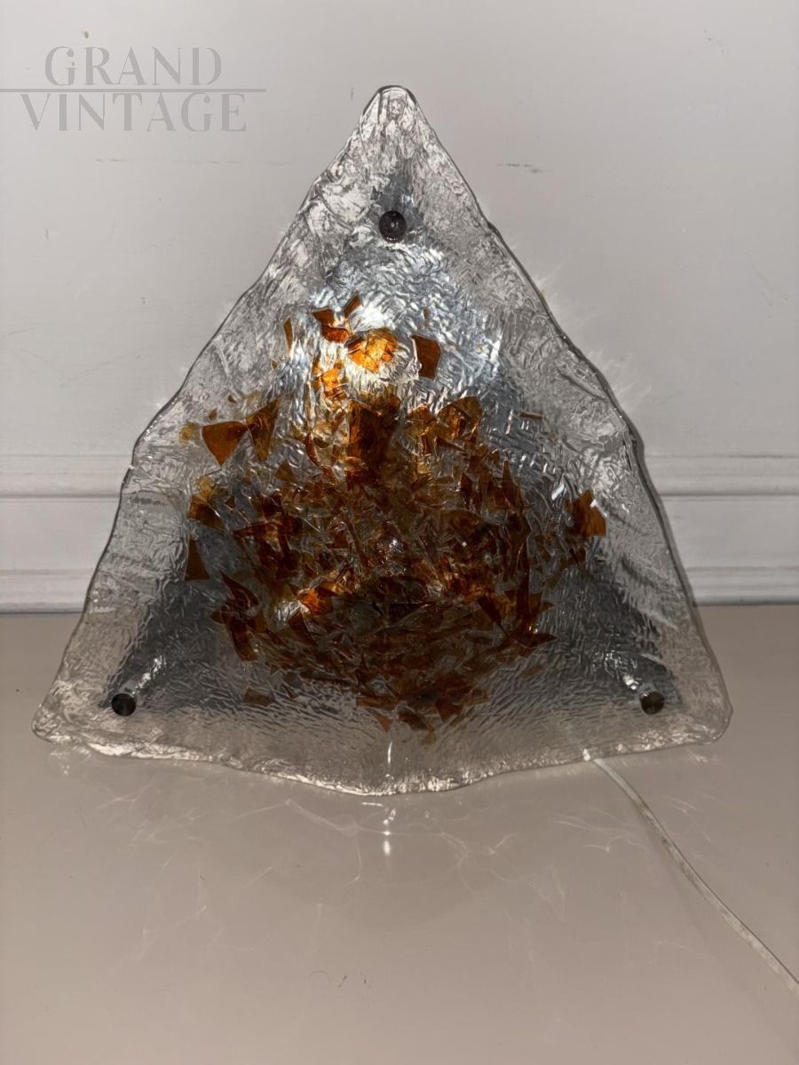 Applique plafoniera triangolare in vetro di Murano lavorato nei colori trasparente e ambrato, larghezza 43 cm, altezza 11 cm.