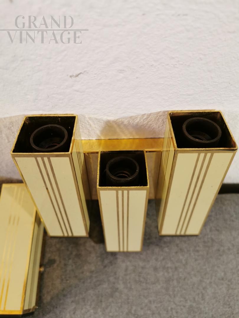 Lampade a parete vintage a tre luci, composte ciascuna da tre parallelepipedi in ottone lucido con eleganti strisce satinate. Anni '70.