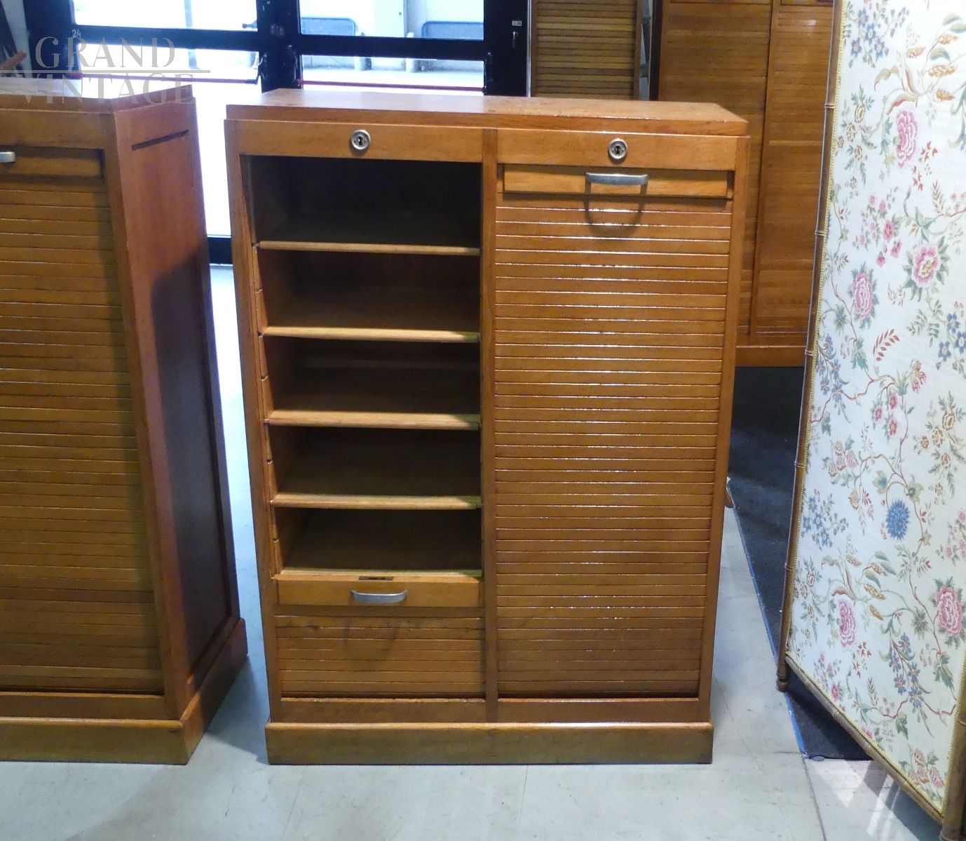 Archivio schedario a serranda doppia vintage in legno di rovere, completo di chiavi, con serrature funzionanti.