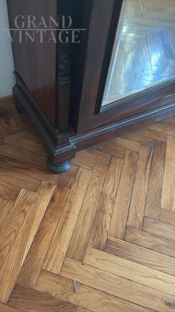 Elegante armadio a un’anta con grande specchio centrale, realizzato in palissandro indiano massello, databile alla seconda metà dell’Ottocento. Decorazioni scolpite a mano con figure laterali e cimasa superiore riccamente intagliata con mascherone centrale. Lo specchio è originale (con lievi segni tipici del tempo), così come le parti lignee e la ferramenta. Ottime proporzioni e grande impatto scenografico, ideale come pezzo d’arredo di pregio per interni classici o eclettici.