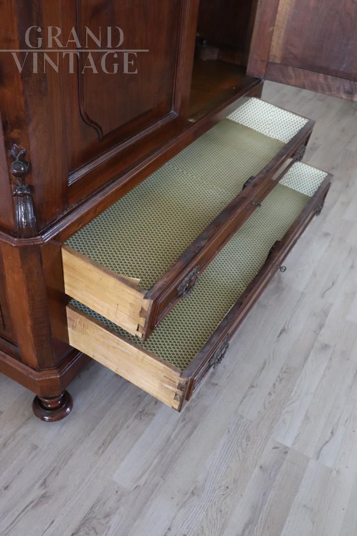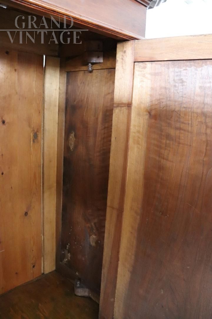 Delizioso armadio antico degli ultimi decenni del XIX secolo, realizzato in noce massello, dotato internamente di bastone per appendere abiti e, nella parte bassa, di due pratici e ampi cassetti. Molto semplice e lineare, adatto per essere inserito anche in un ambiente moderno dove si voglia dare un tocco di calore. Ottime condizioni, possibili naturali segni di usura nella carta di foderatura dei cassetti. Ottimo prezzo trattabile.