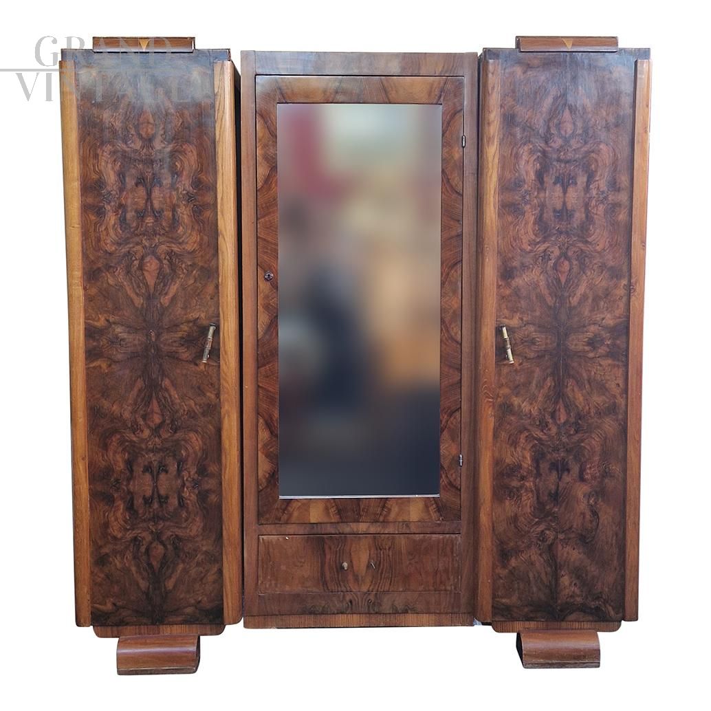 Armadio Art Déco italiano anni '30 in radica di noce con anta centrale a specchio, due vani laterali con ante cieche e un cassetto nella parte inferiore.