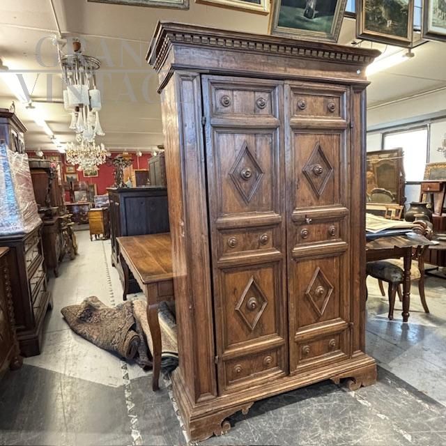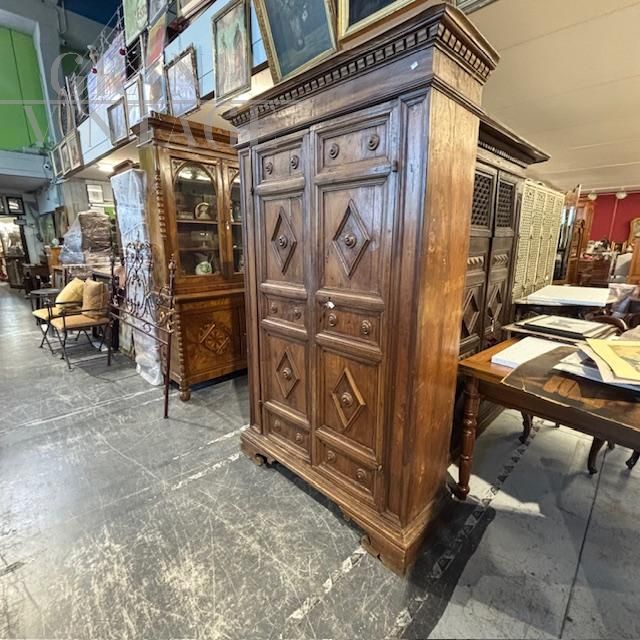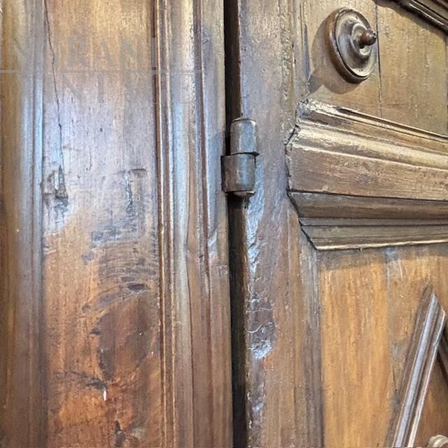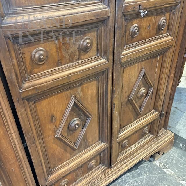 Strepitoso raro armadio stipo Umbro antico realizzato nel XVII secolo un noce massello e abete, caratterizzato da due grandi ante a losanghe, con ferramenta e chiodi coevi e dotato di ripiani interni. In buono stato, il mobile non è stato restaurato di recente, conserva però i segni di vecchi restauri e diqualche sostituzione / rifacimento.
