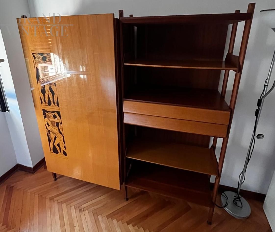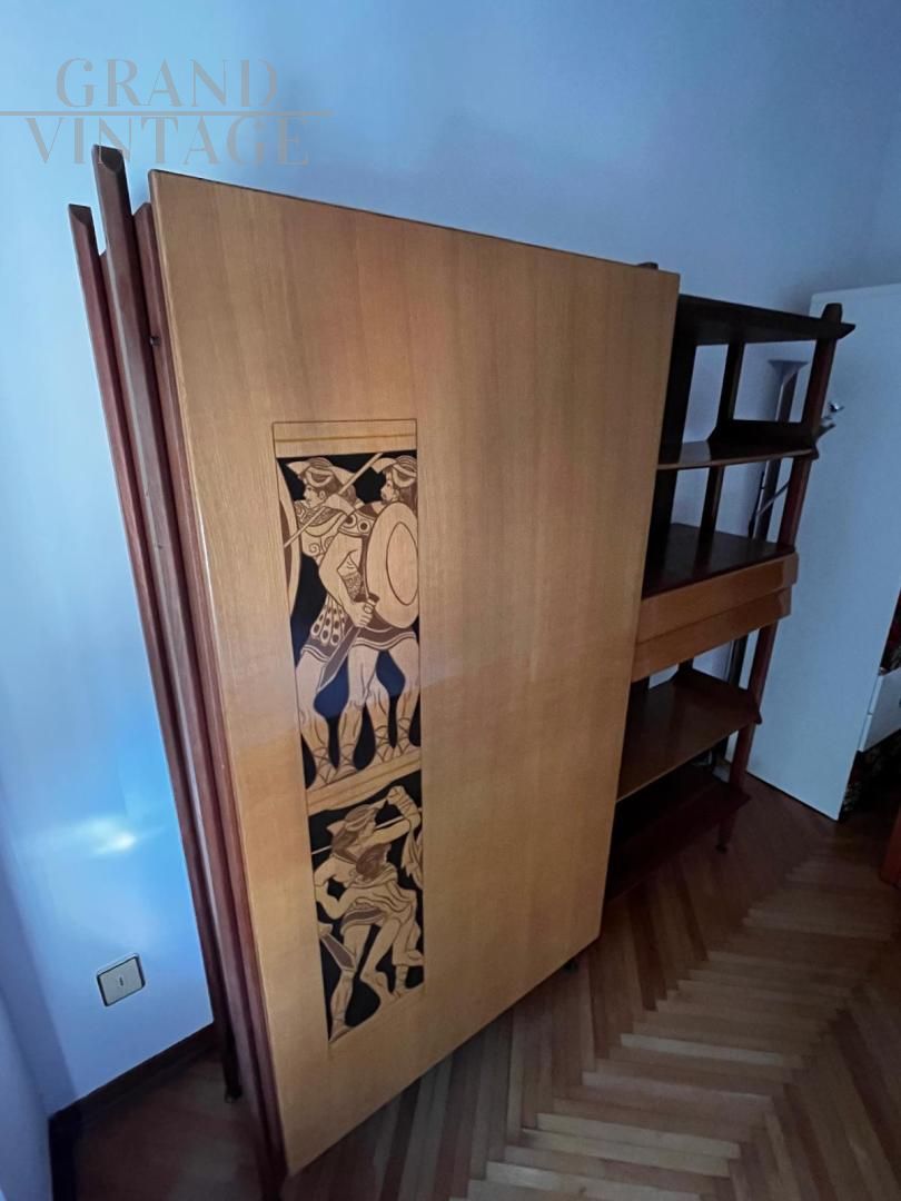 Armadio vintage Princic con letto singolo a scomparsa, Gorizia anni '50 - '60, con la tipica serigrafia con figure dell'antica Grecia.