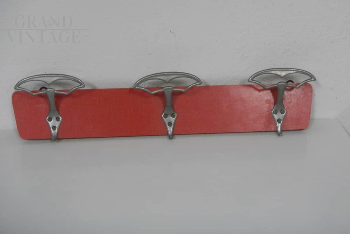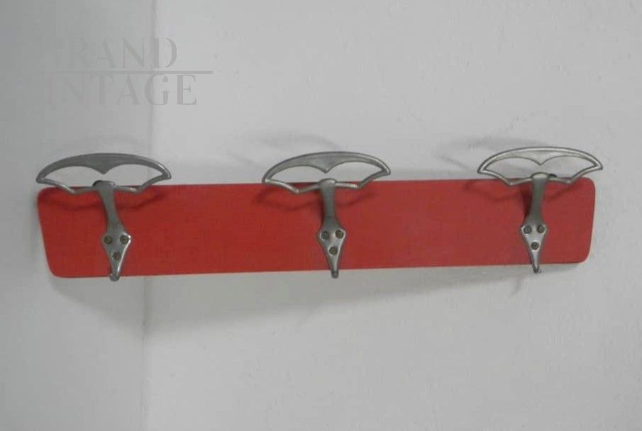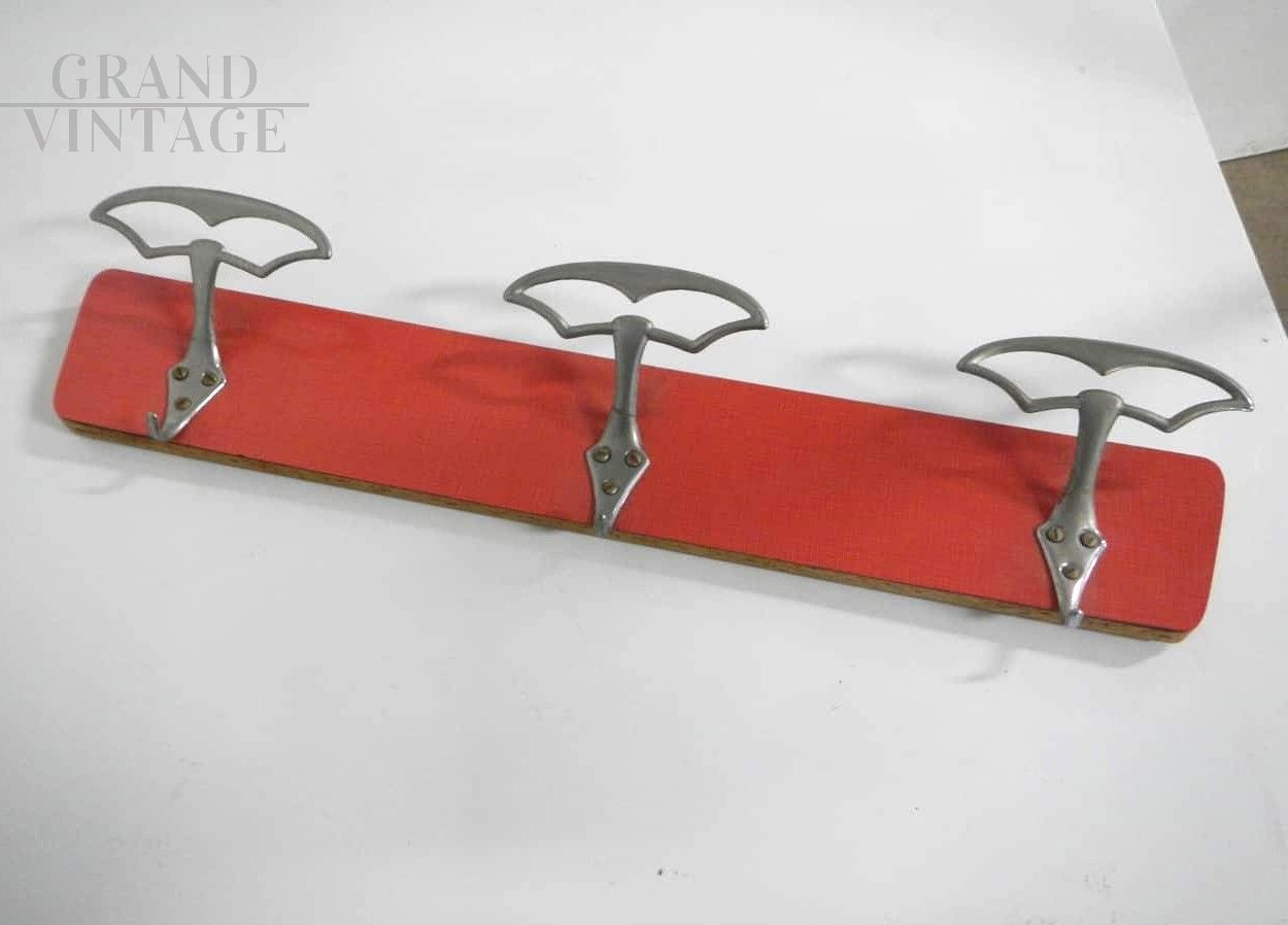Attaccapanni da parete vintage anni '70 con struttura in legno compresso e formica rossa e 3 ganci in metallo, in buone condizioni.