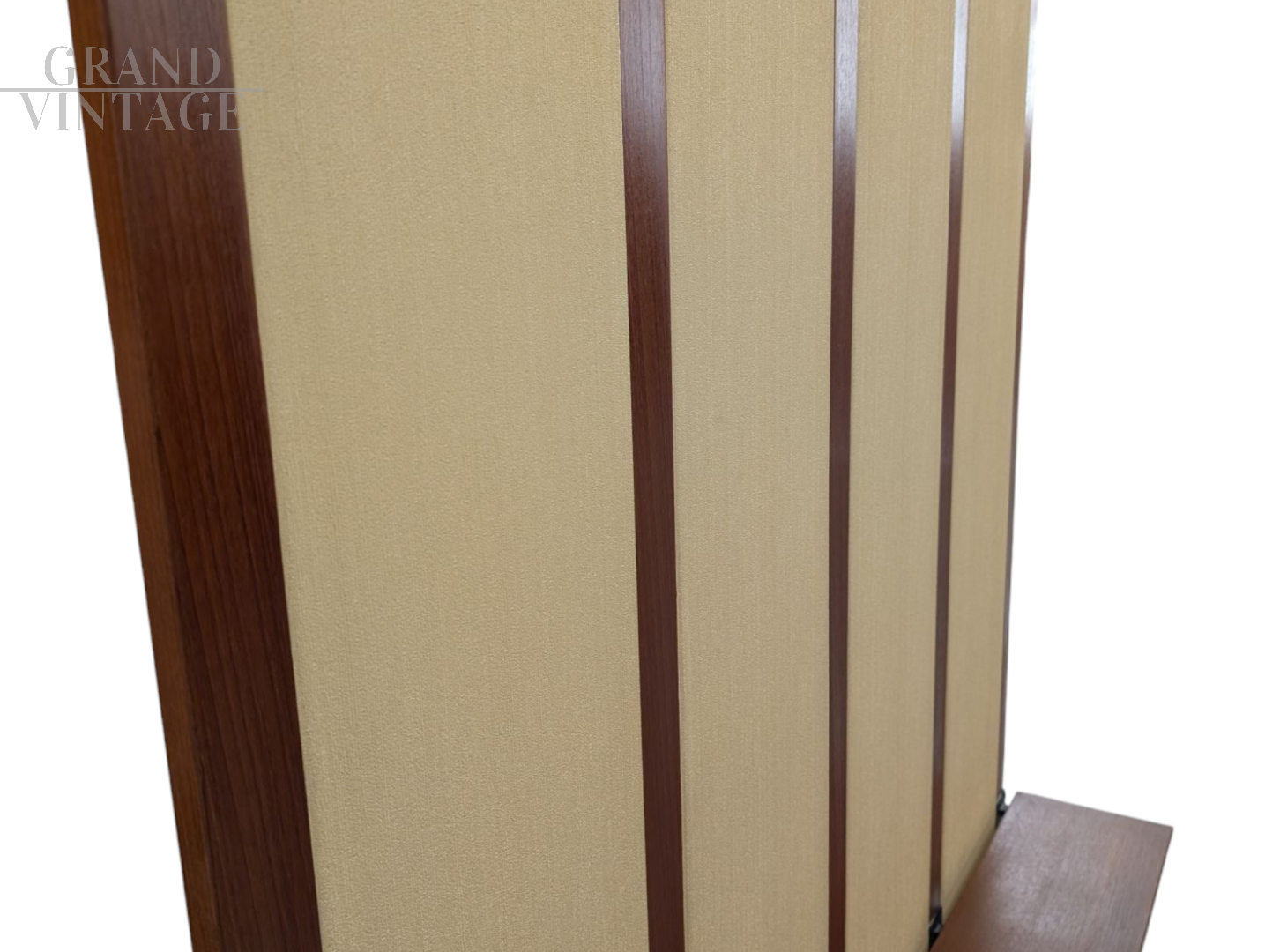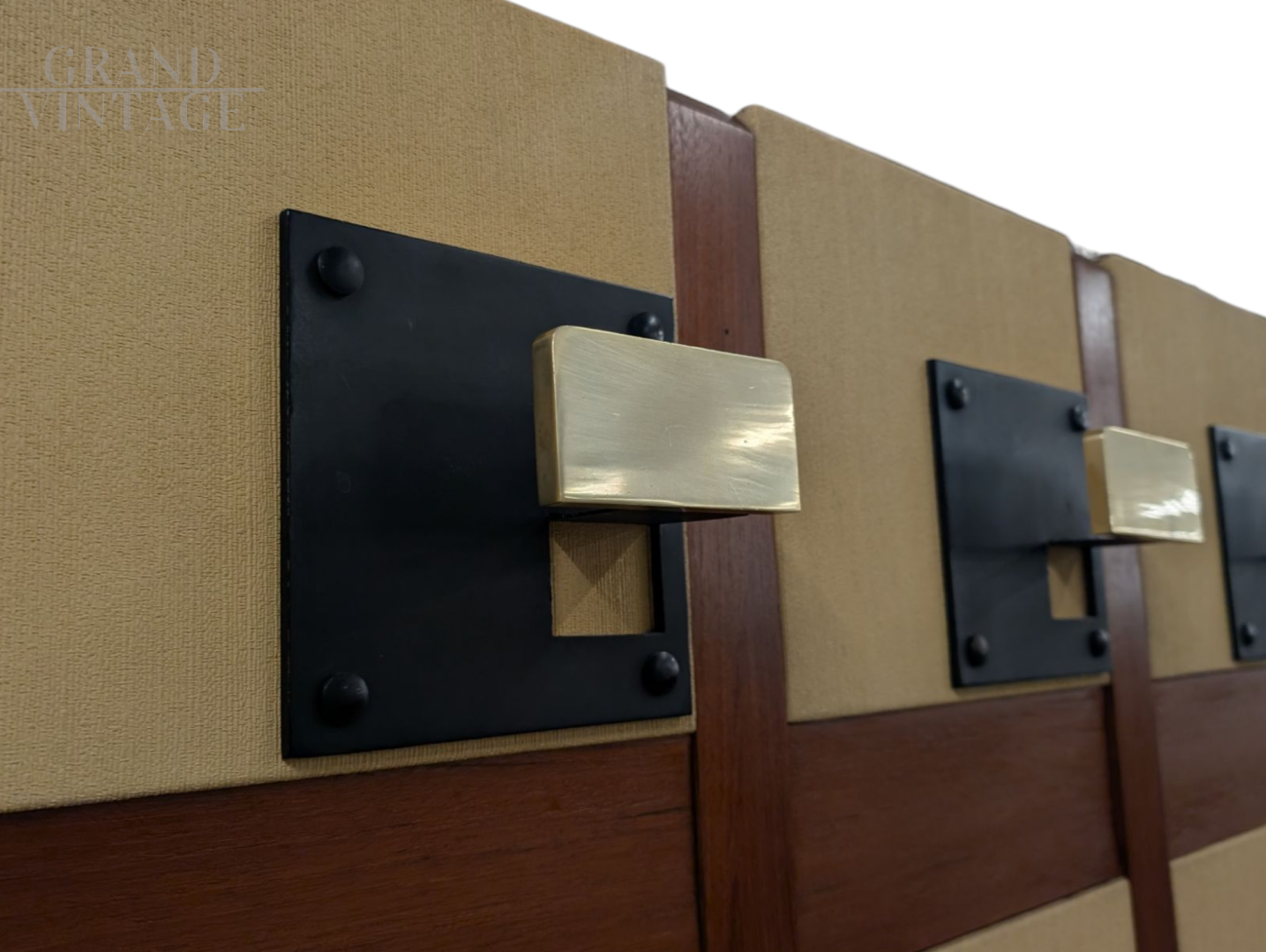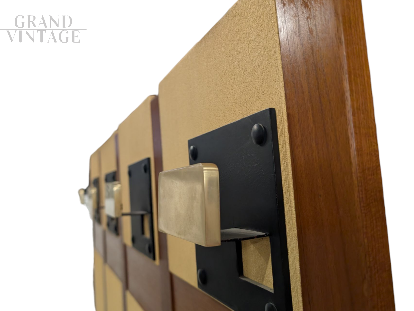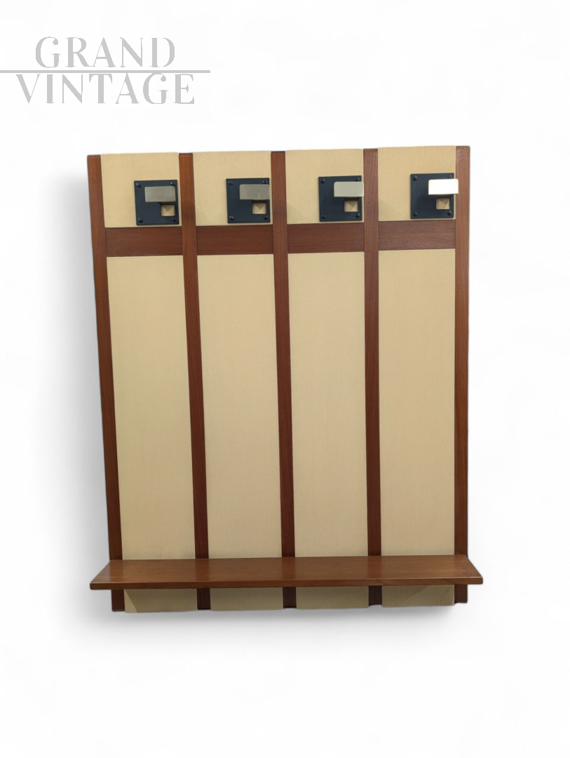 Attaccapanni vintage da parete legno, tessuto beige e ottone, anni '70