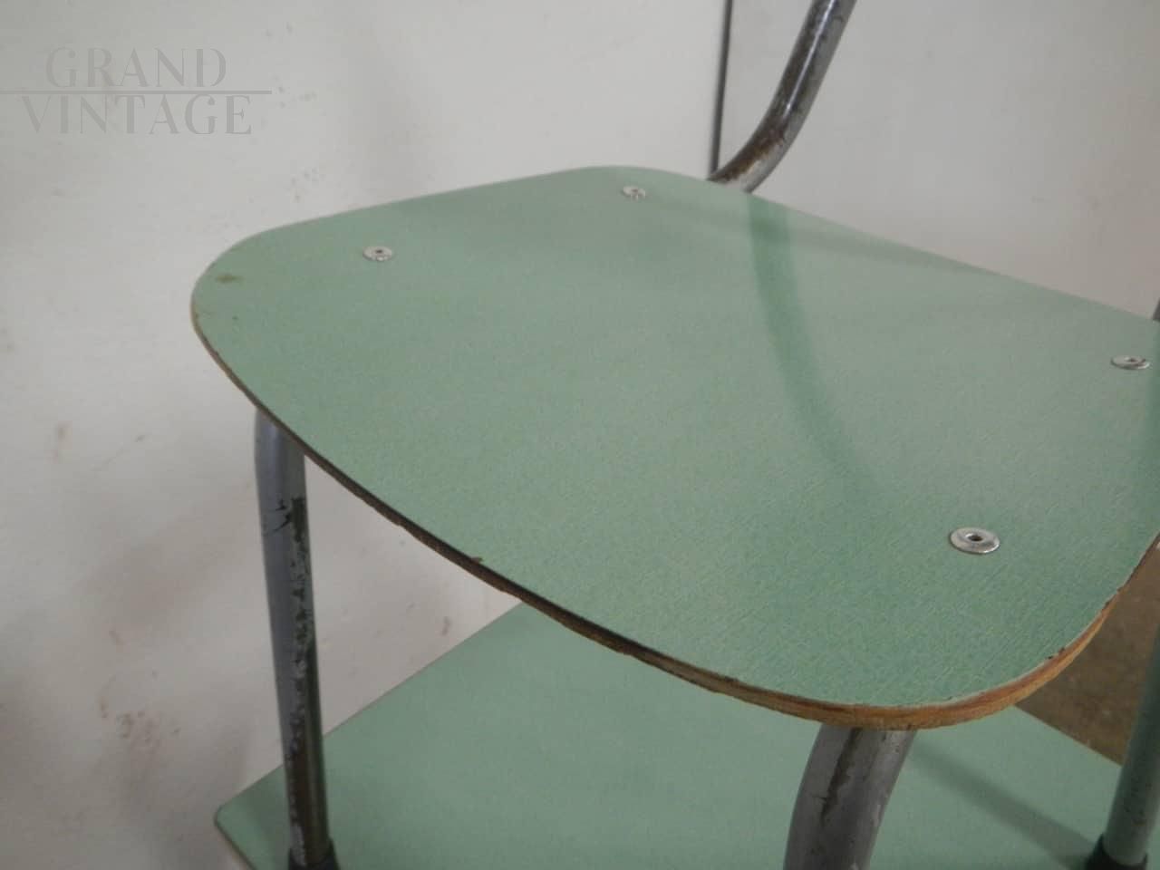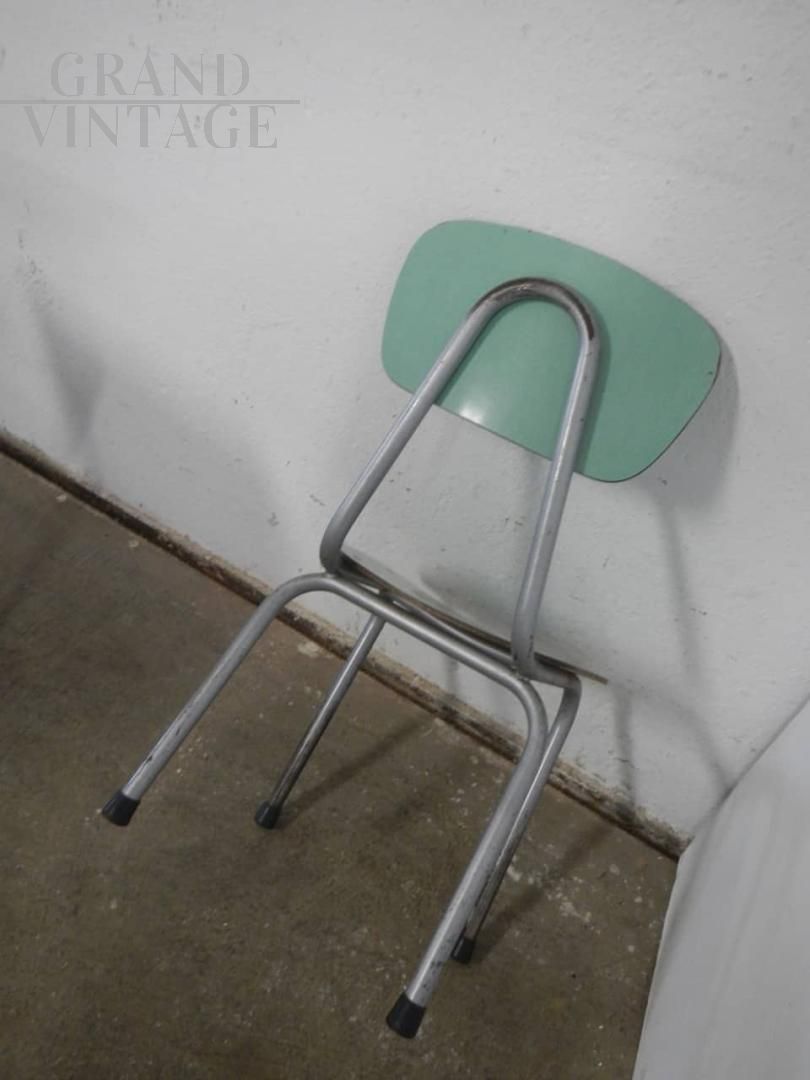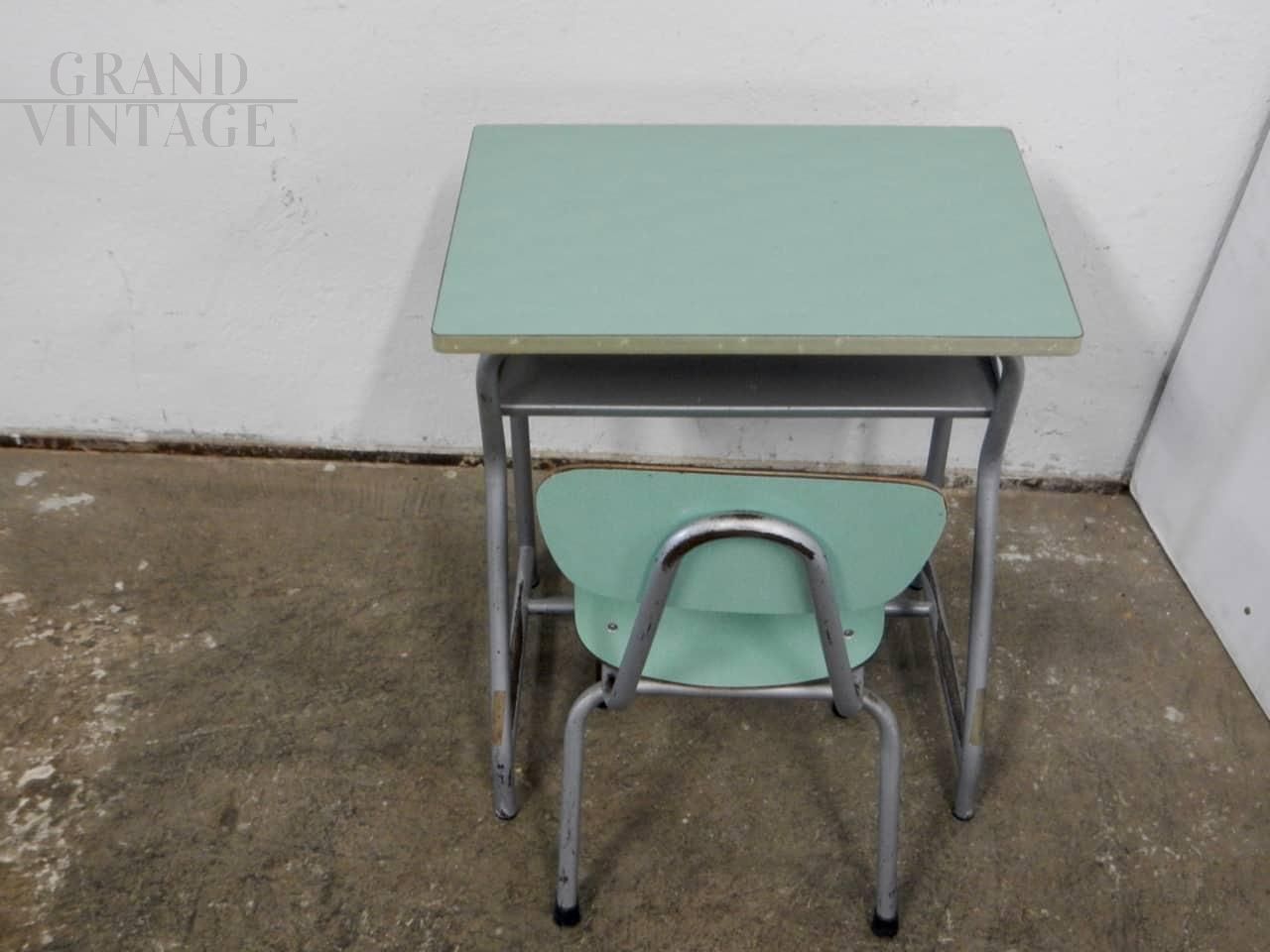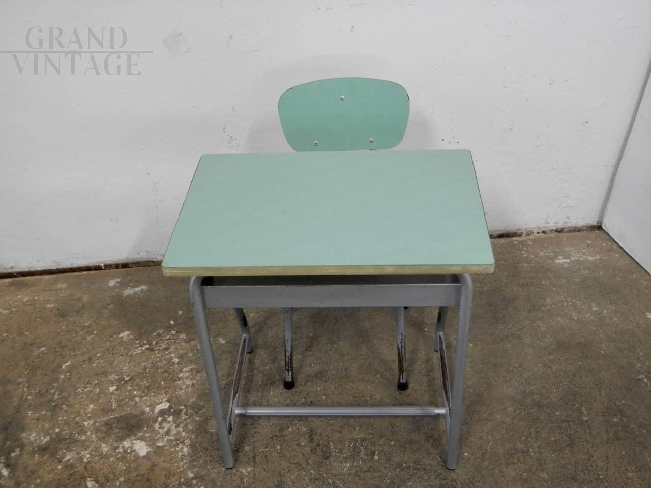 Piccolo banco scolastico vintage in formica verde con sedia, usato nelle scuole dell’infanzia. Presenta delle imperfezioni dovute all’uso. La struttura è buona. La sedia misura 29 x 28 cm, altezza 61 cm, altezza seduta 33 cm.