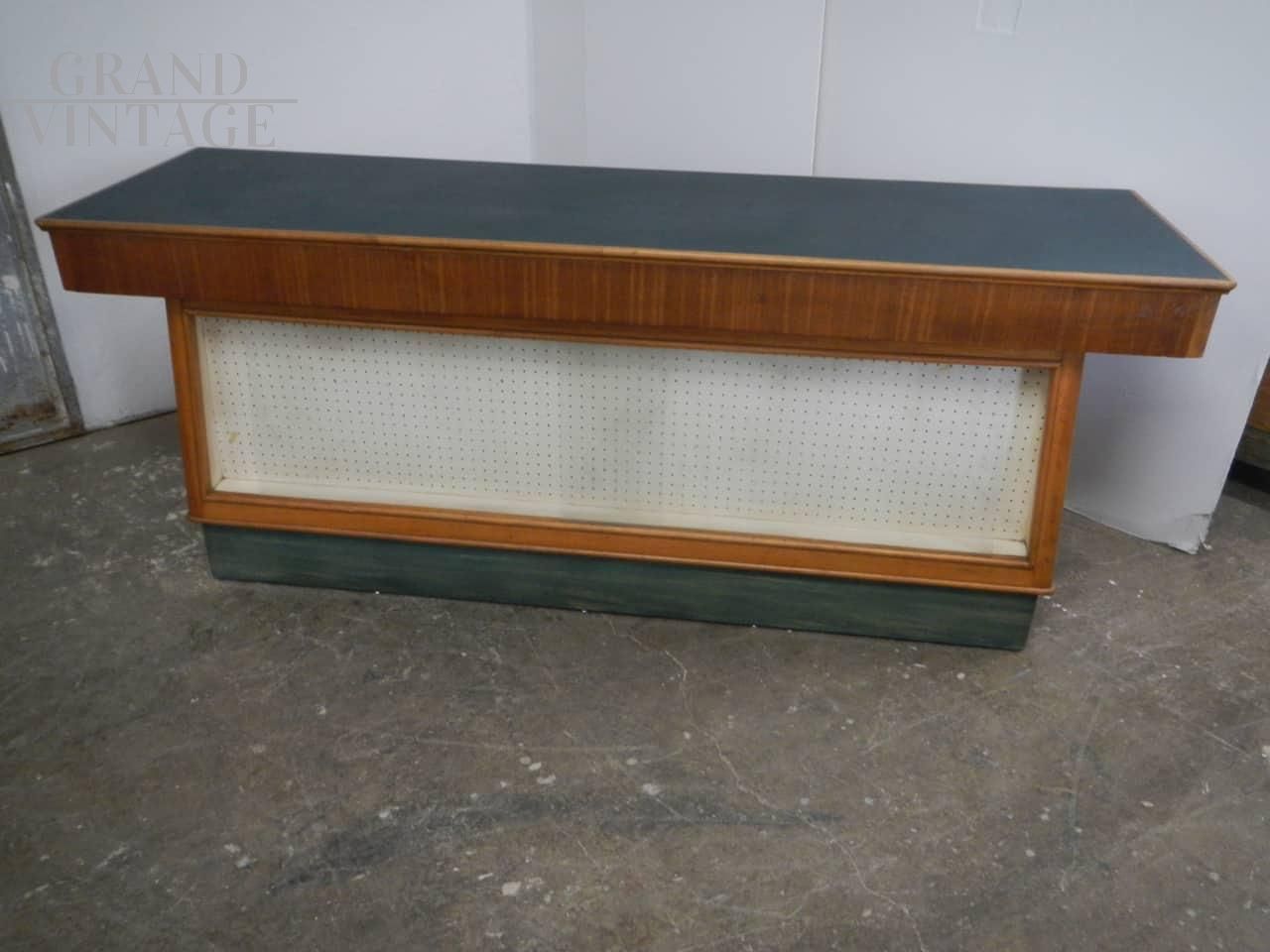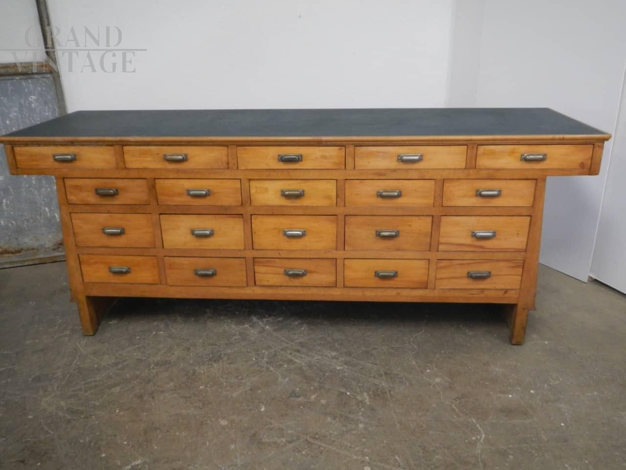 Banco da merceria vintage bifacciale in legno di faggio con vetrina originale da un lato e 20 cassetti nel retrobanco. La parte più stretta misura cm 186 x 57 x altezza 73cm. I cassetti sono di misure diverse: a partire dal piano i primi 5 cassetti misurano 37 x 41 x altezza 7 cm, i secondi 5 hanno grandezza 30 x 41 x altezza 9 cm. Gli ultimi 10 alla base misurano 30 x 41 x altezza 13 cm.
