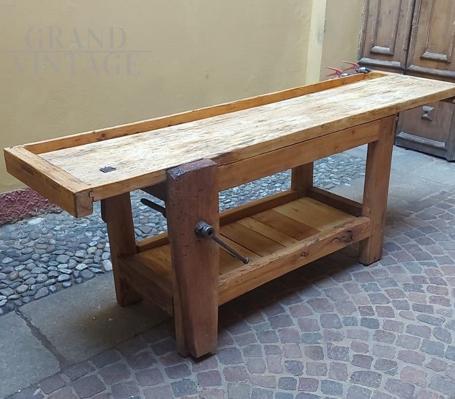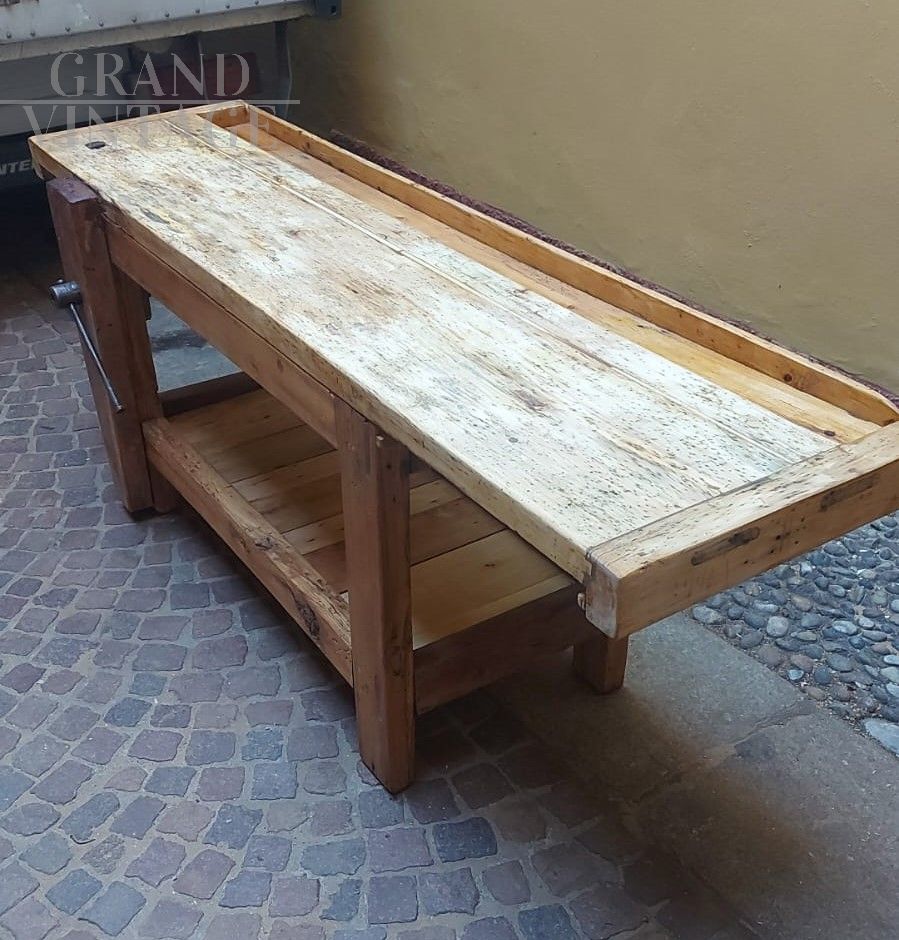 Banco da falegname vintage con doppio piano, morsa sulla sinistra e piano nella parte inferiore, in buone condizioni, restaurabile secondo gusto personale.