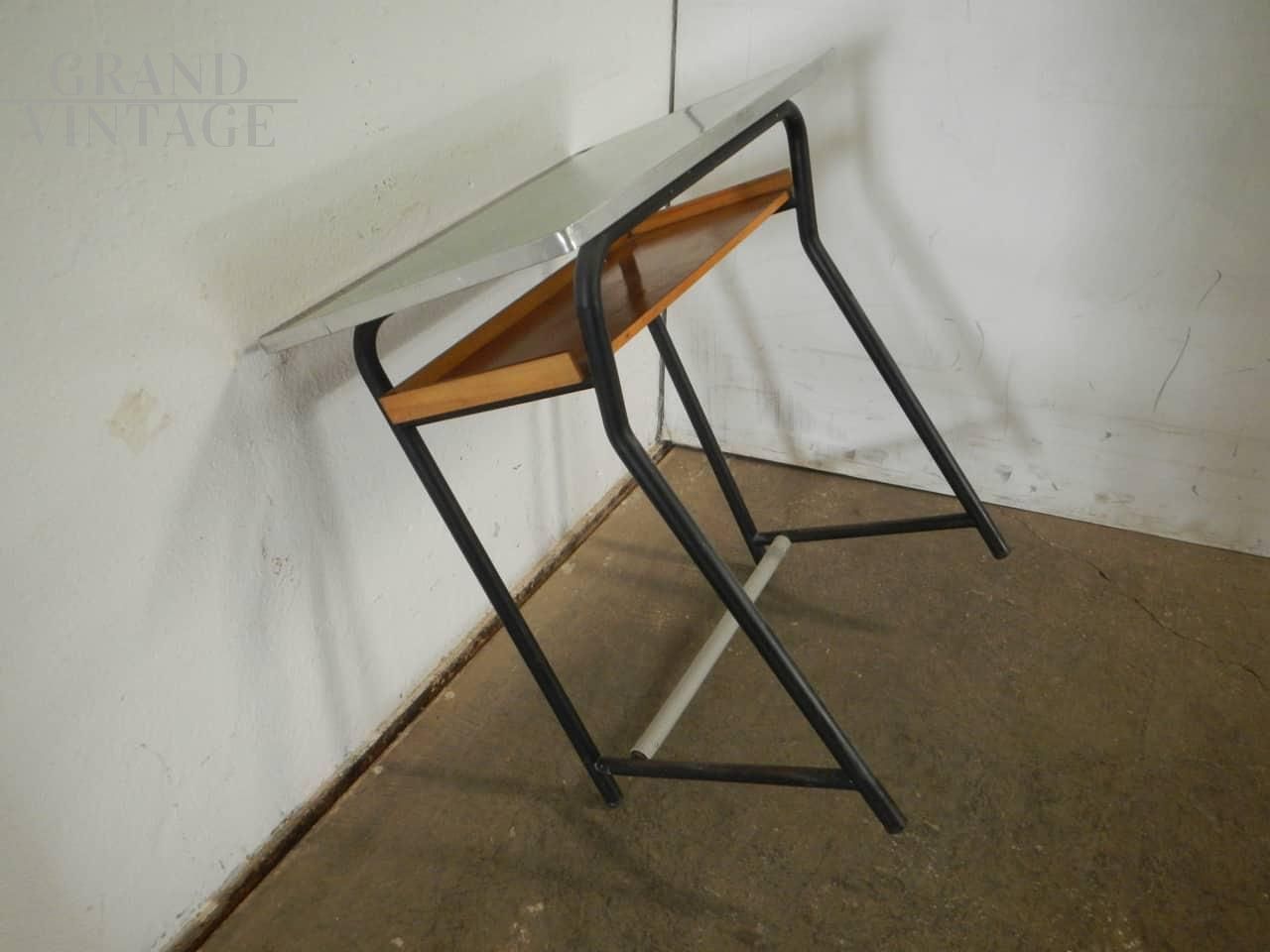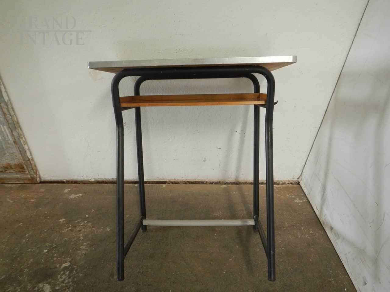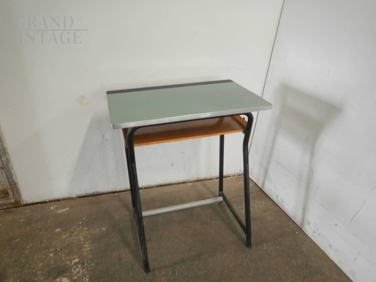 Banchetto scolastico vintage anni '70 con piano in formica verde e struttura in ferro con poggiapiedi, reggi cartella e mensola in legno. La misura per inserire la sedia è di Cm 60.