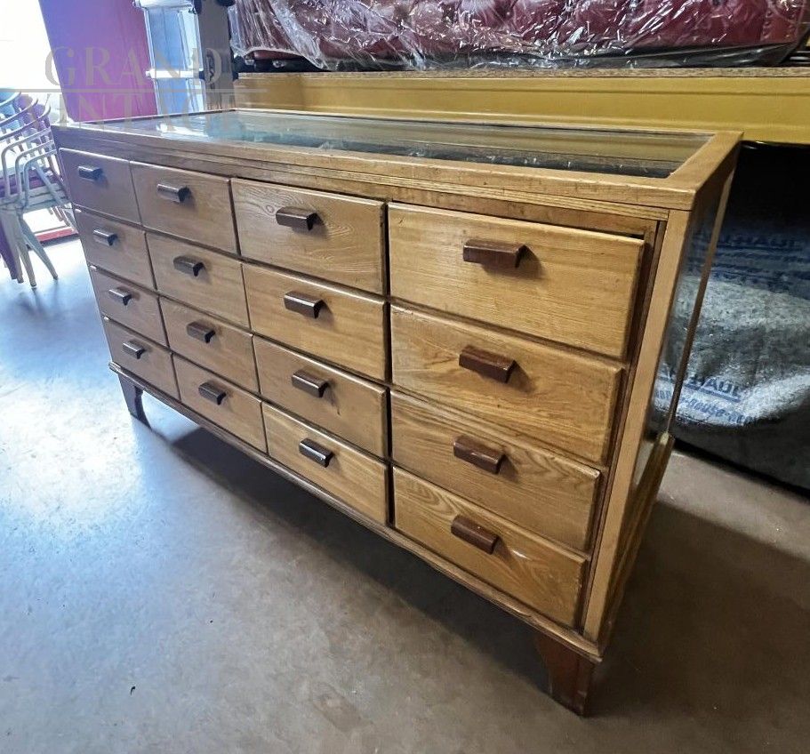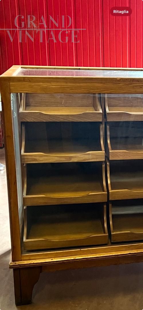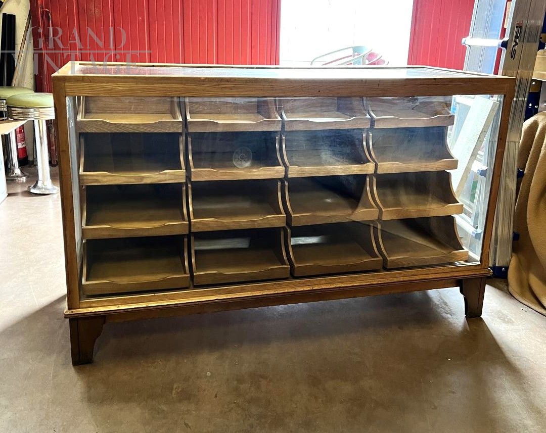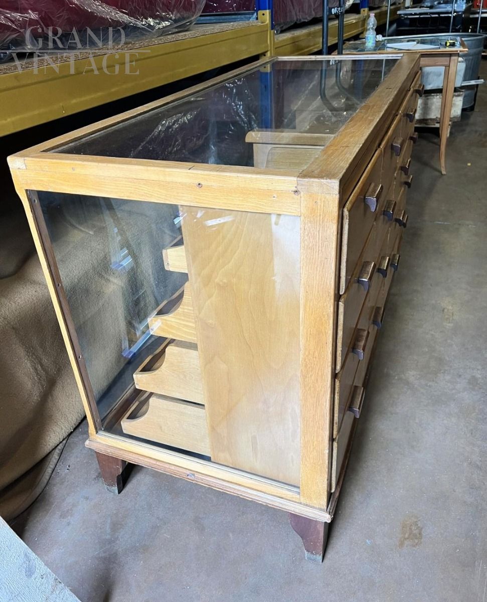 Bancone da negozio a vetrina vintage in stile americano con struttura in legno e cassetti estraibili con diverse profondità, il piano è a vetrina così come la parte frontale.